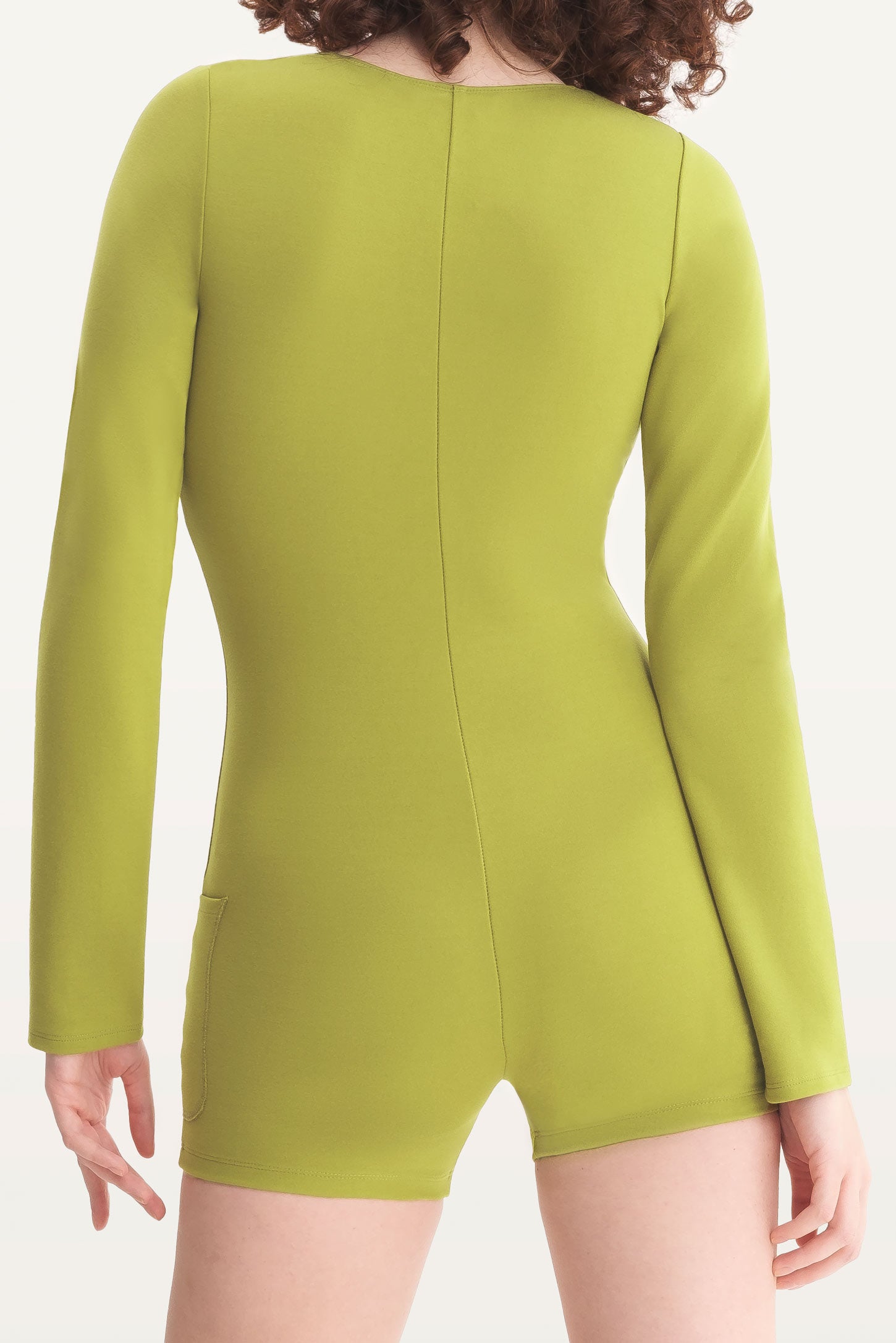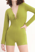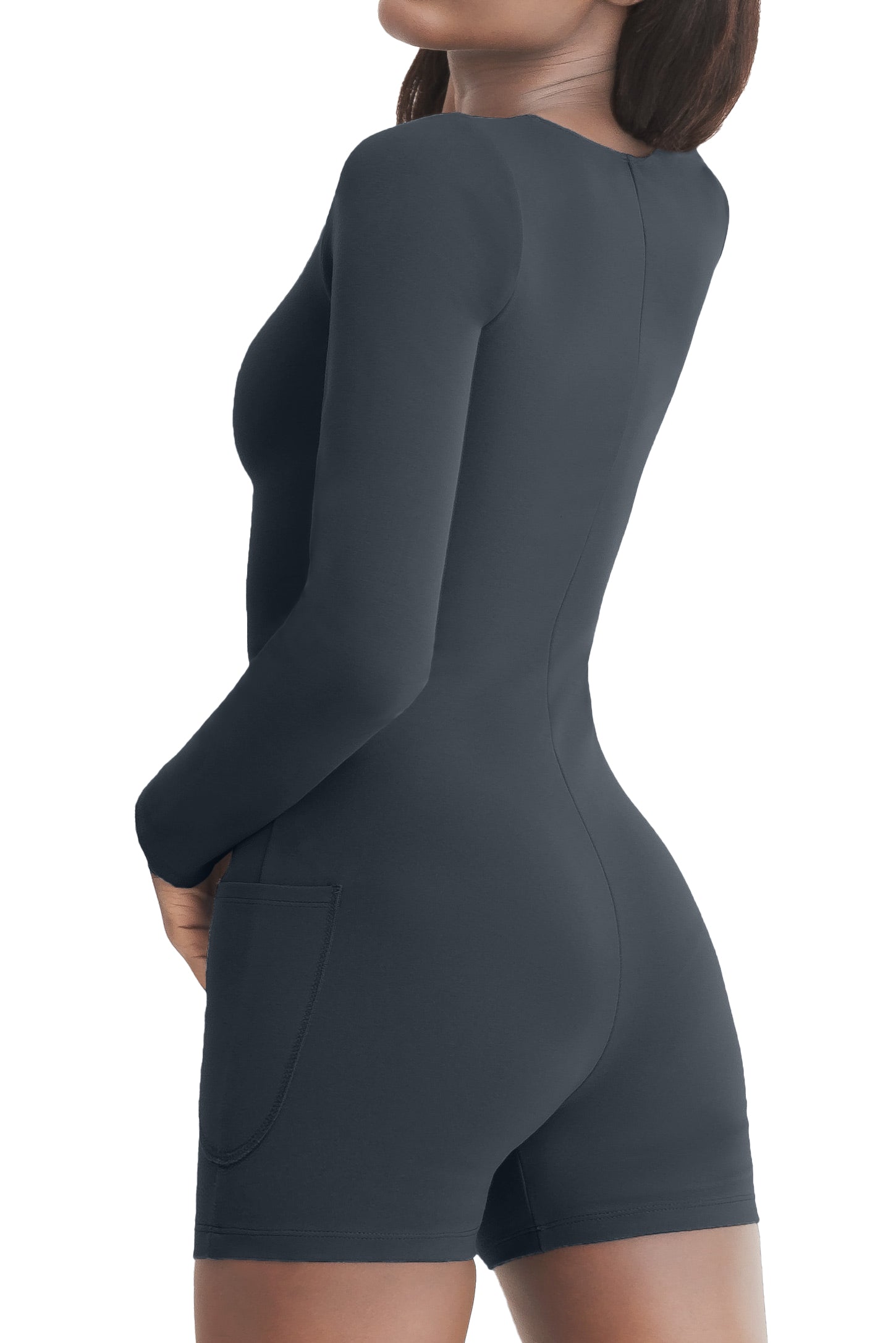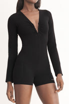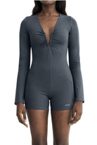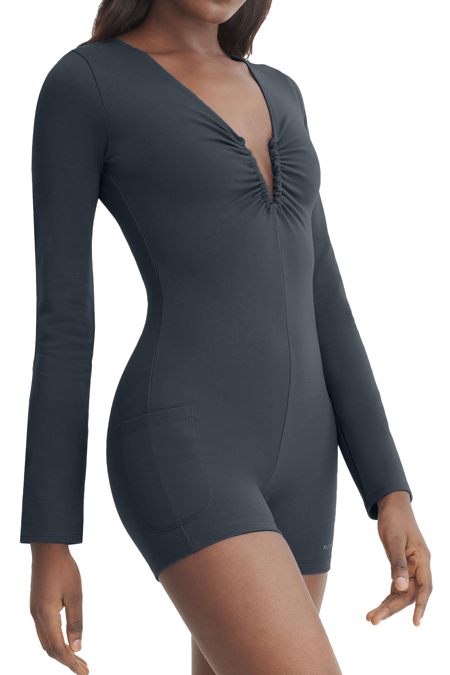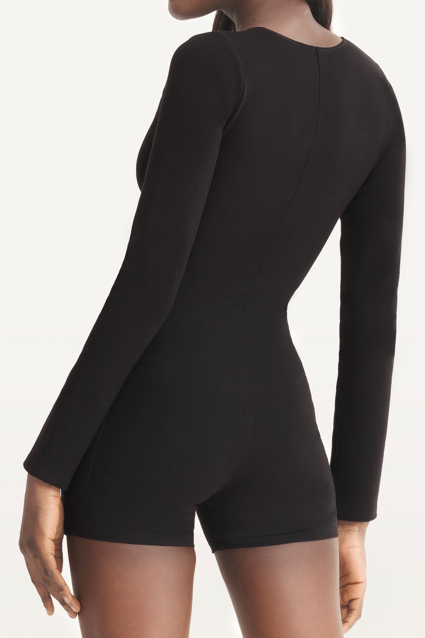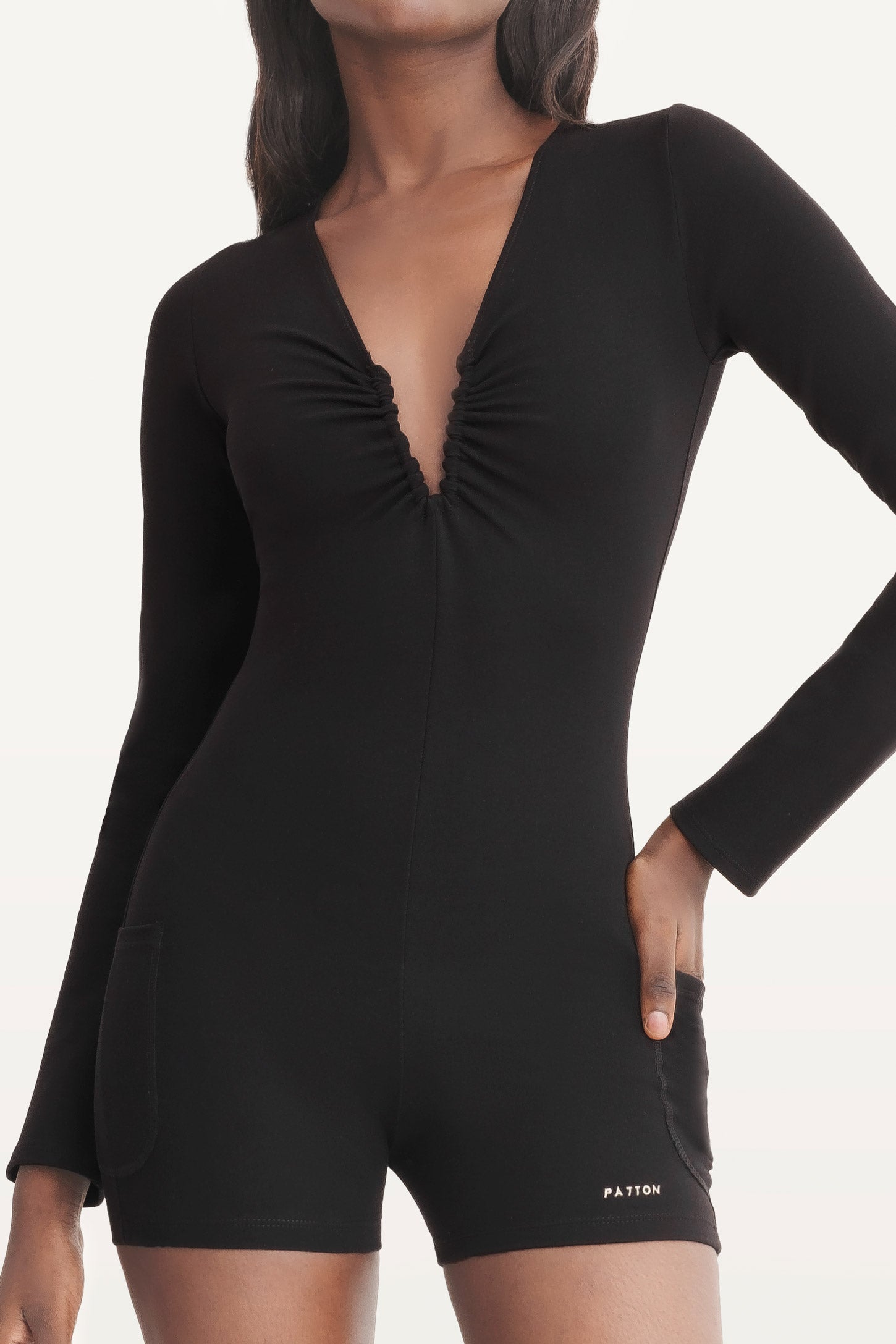 A biker-short length unitard with a plunge neckline, long sleeves, side pockets, and an embroidered logo.