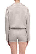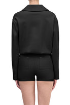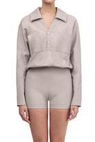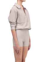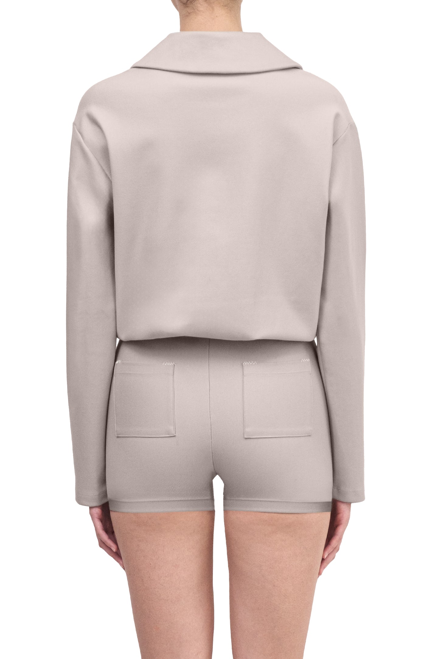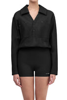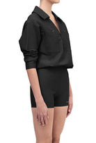 A biker-short length unitard featuring a long-sleeve polo top with snap button closures, gartered waistband, chest and back patch pockets with contrast stitching, and an embroidered logo.