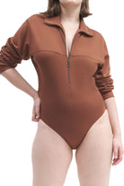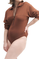 A long-sleeve bodysuit with half-zip fastening and collar, snap closures, and an embroidered logo.