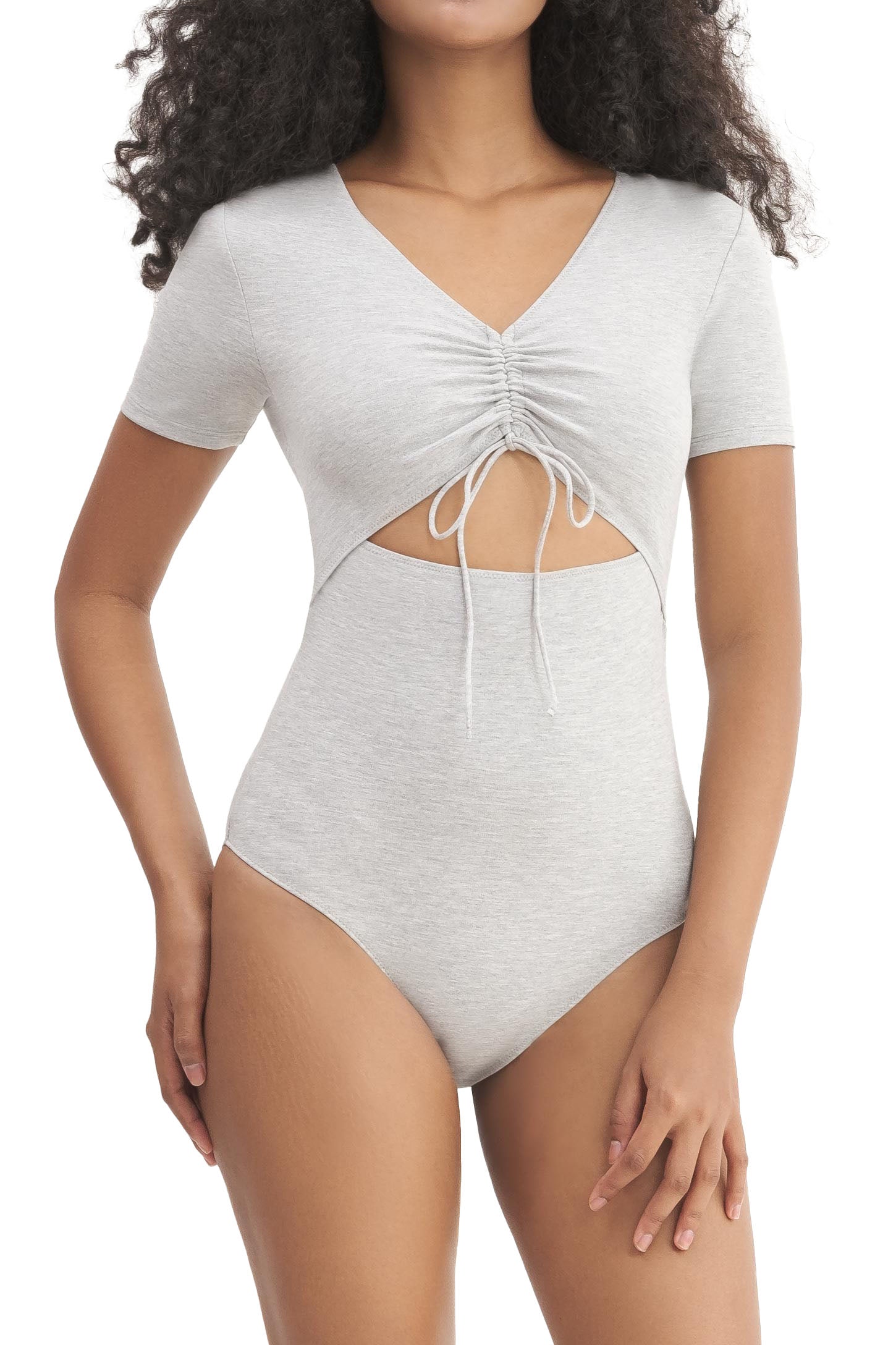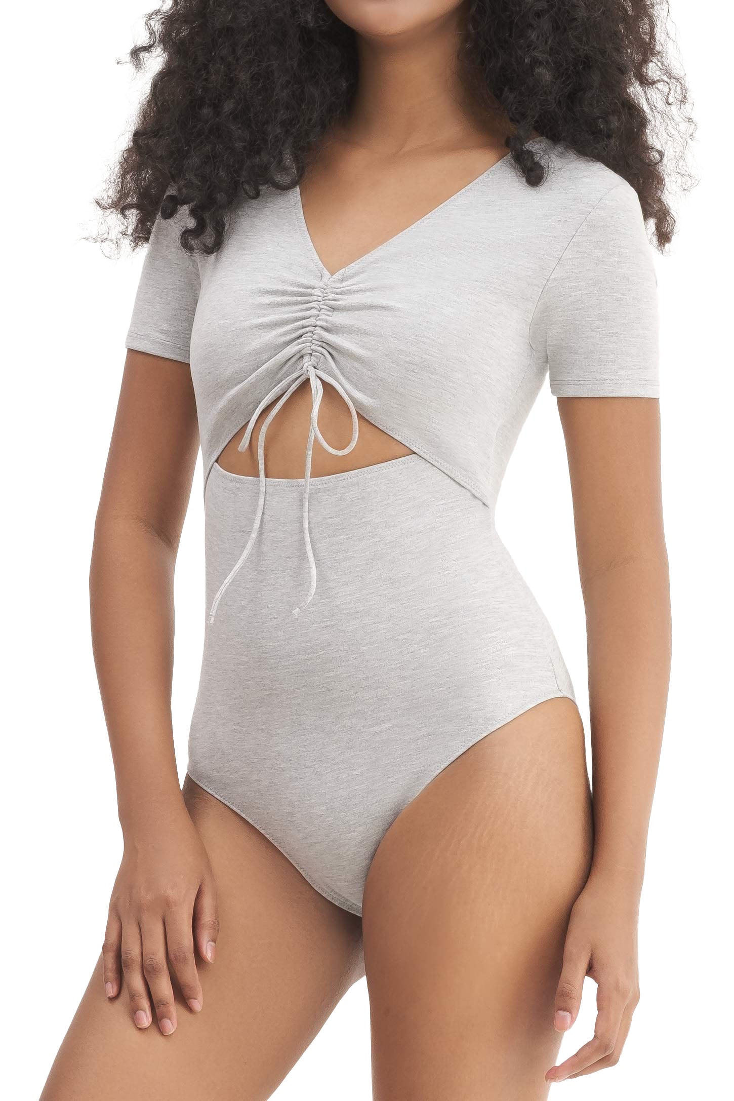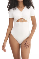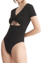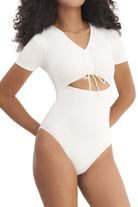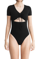 A short-sleeve bodysuit with a V-neckline, adjustable chest drawstring and frontal cut out, snap closures, and an embroidered logo.