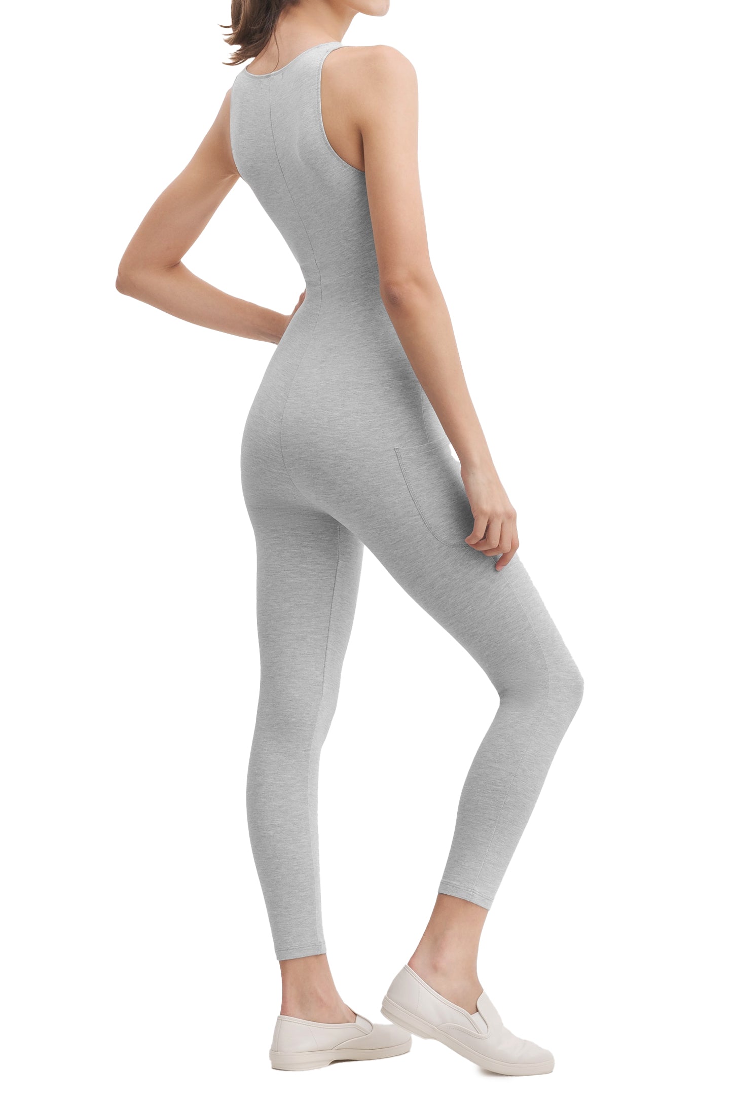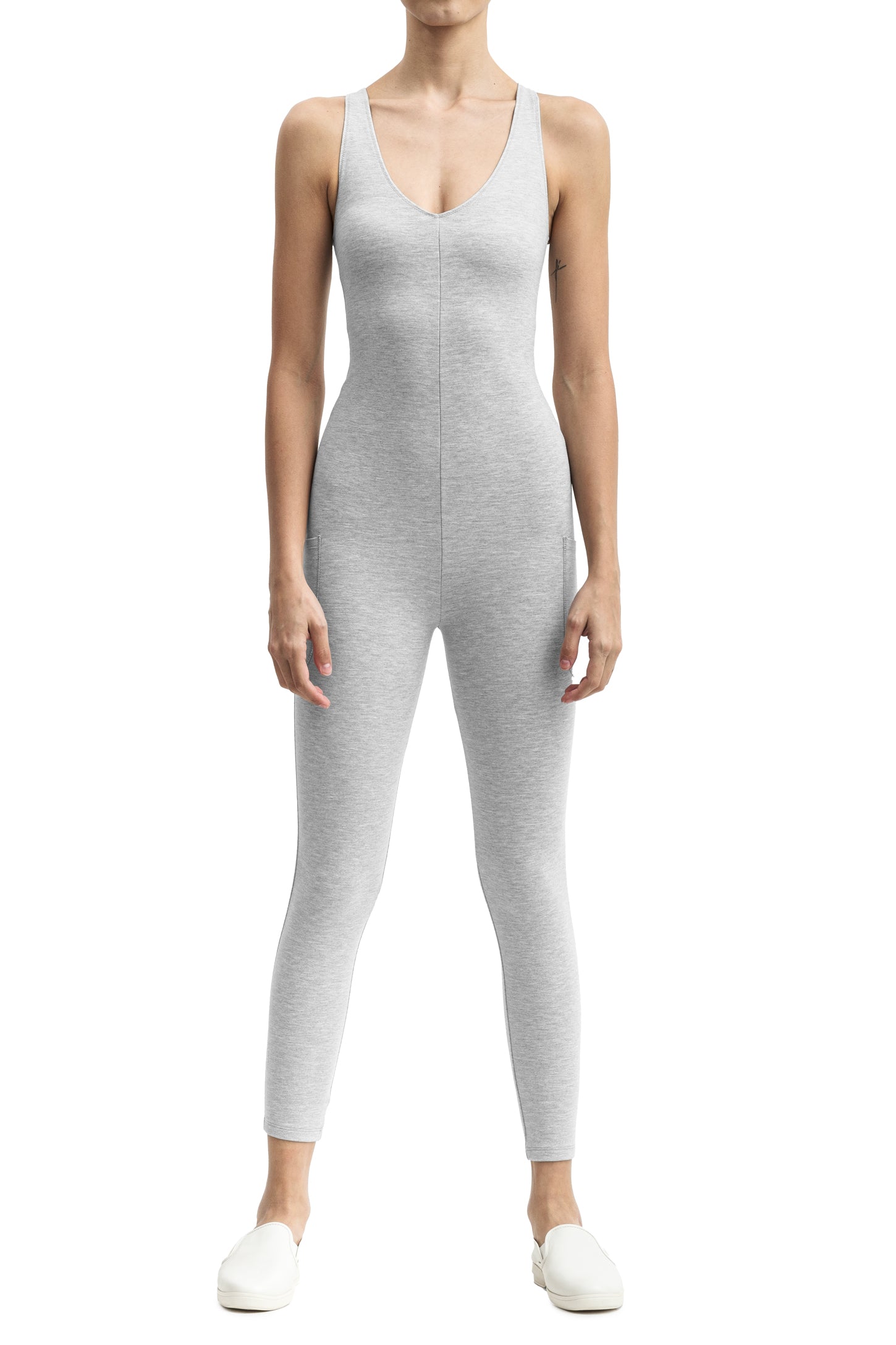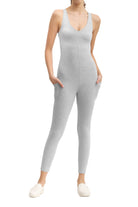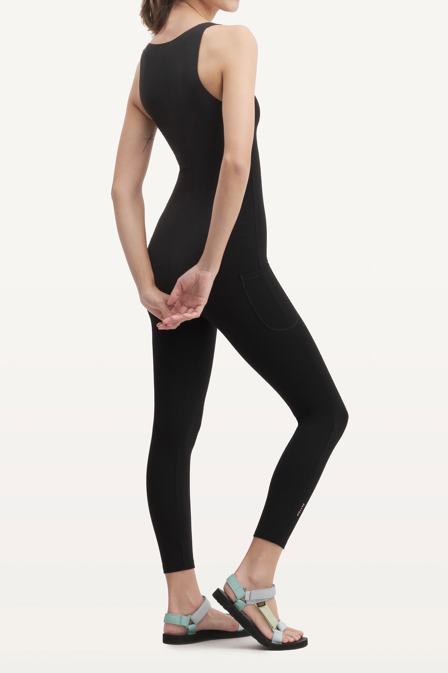 A full-length sleeveless unitard featuring a scoop v-neckline, side pockets, and an embroidered logo.