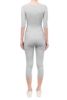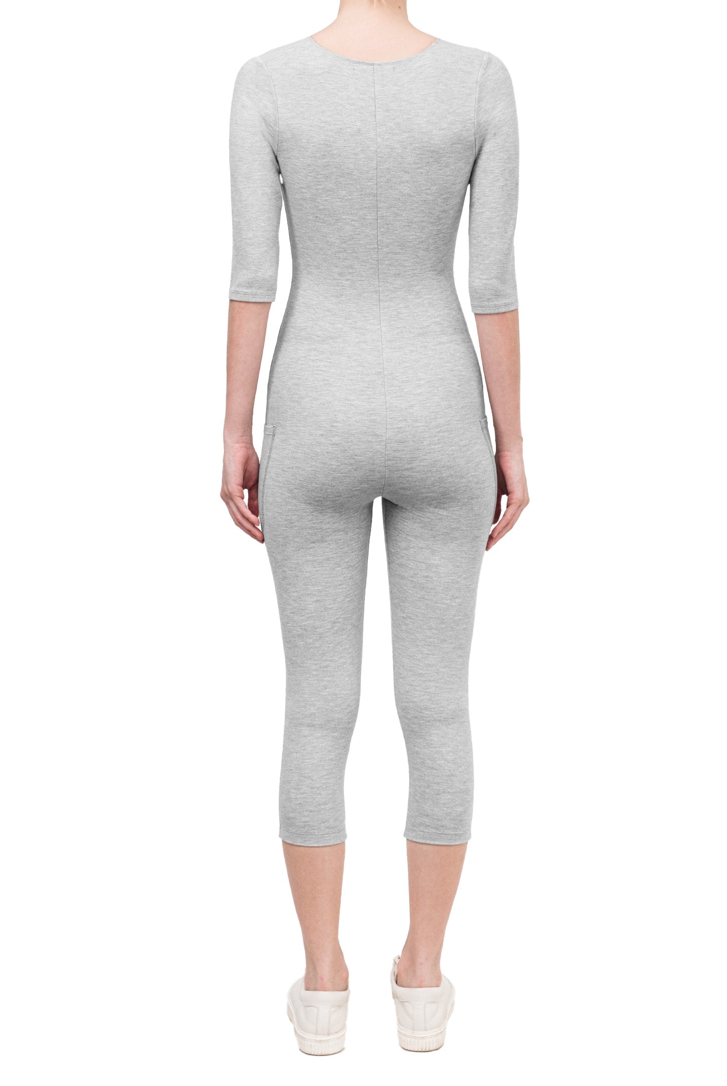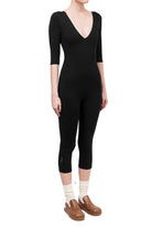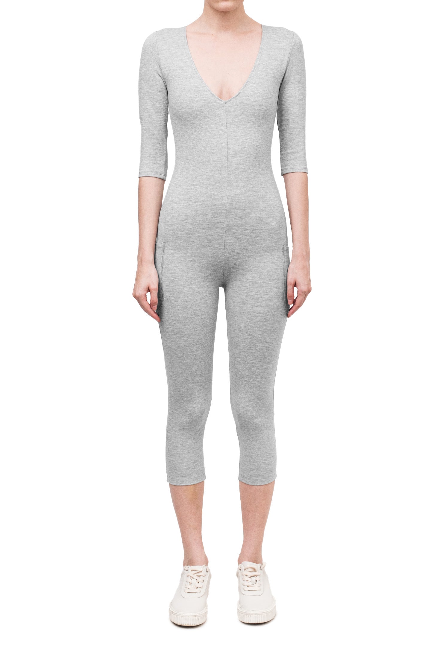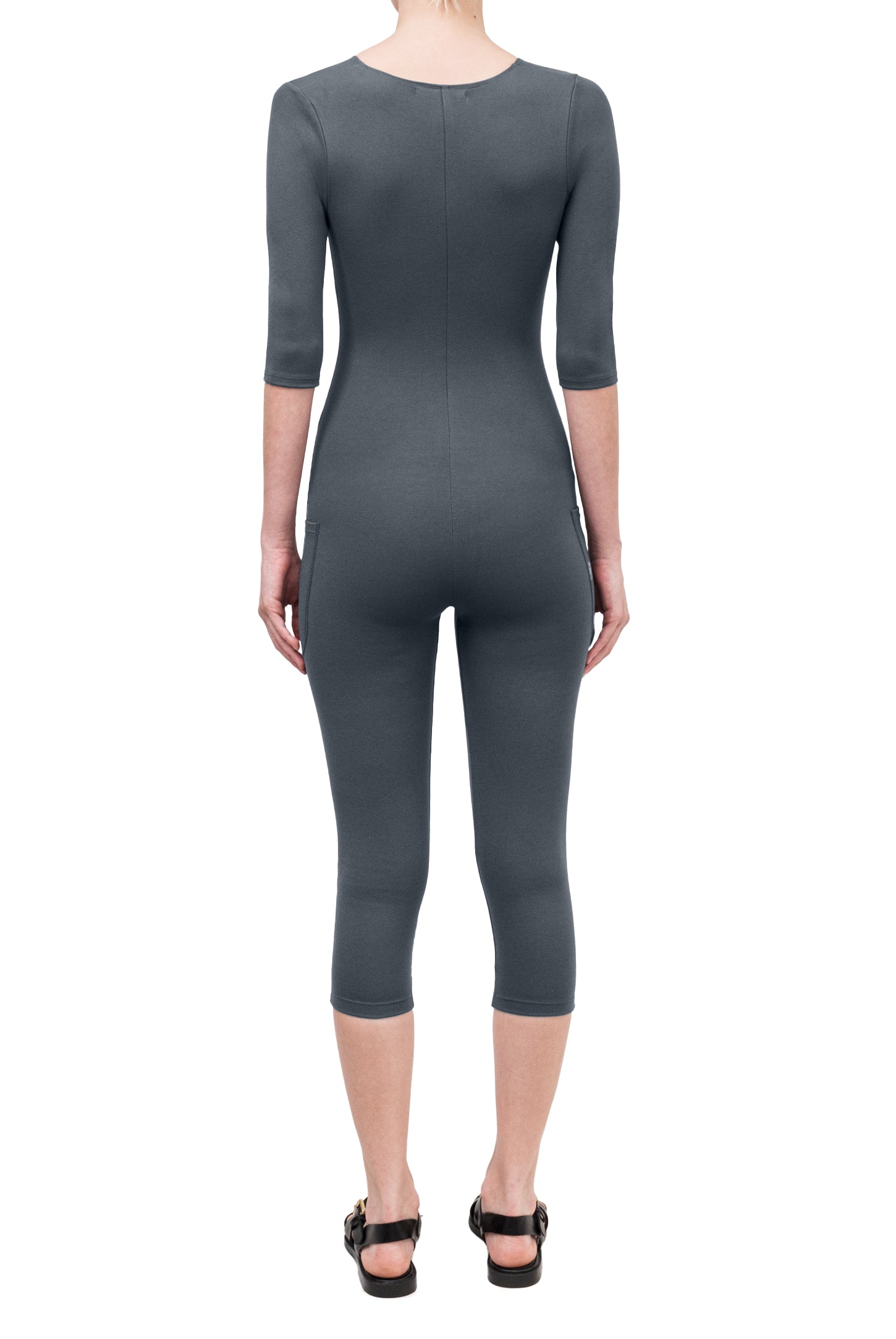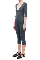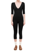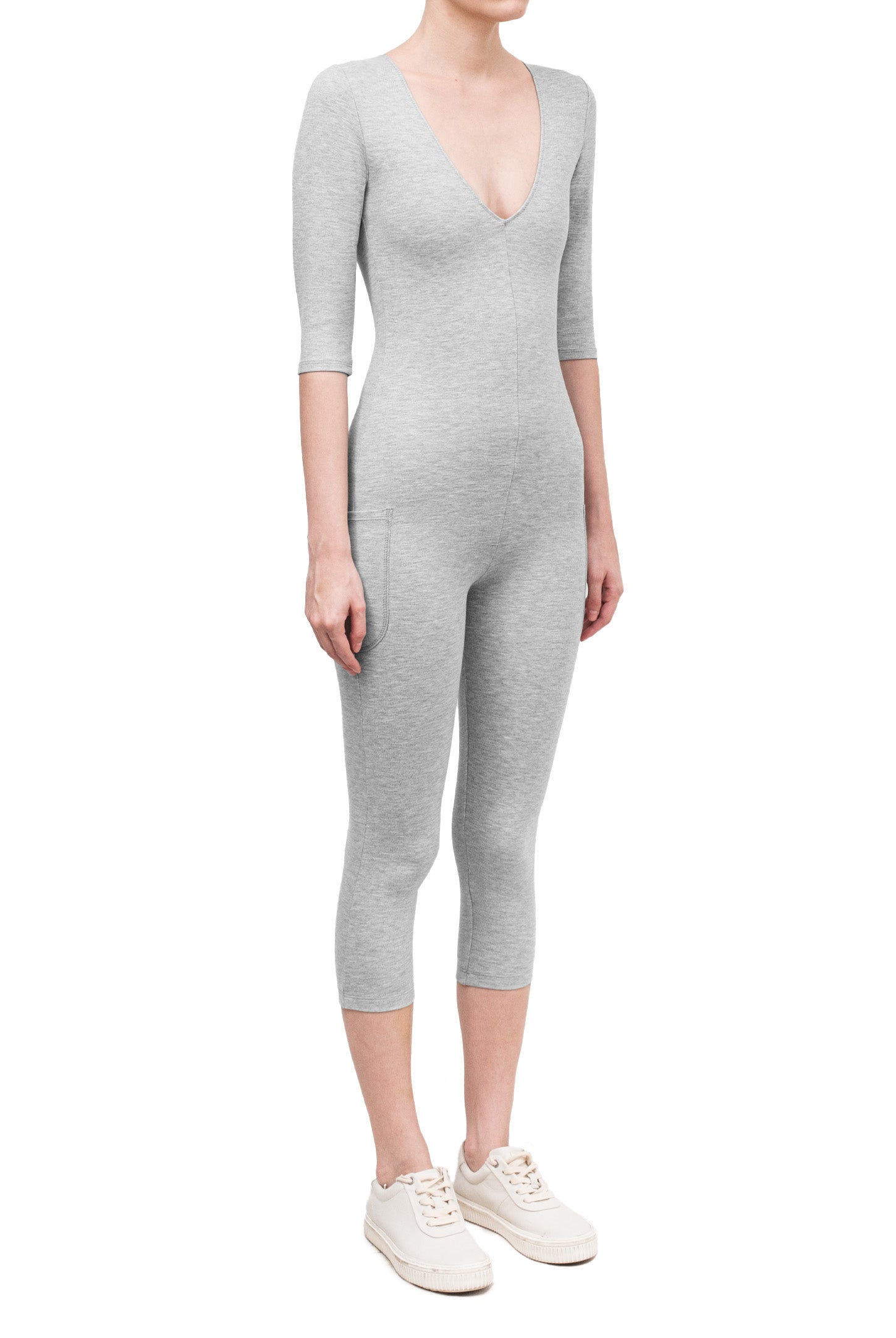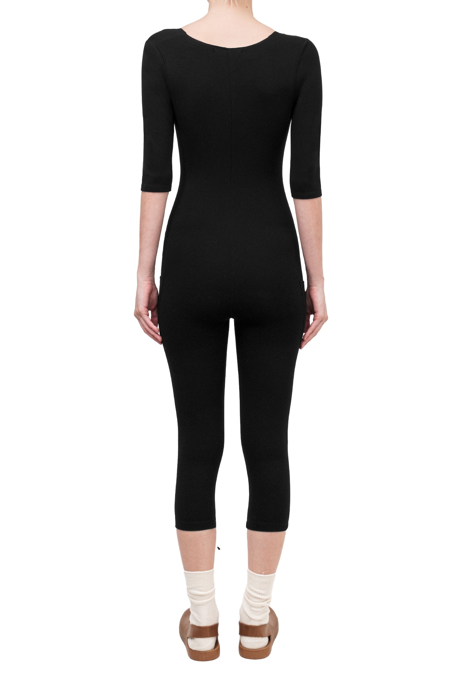 A mid-calf length unitard with a scoop v-neckline, half-sleeved top, side pockets, and an embroidered logo.