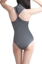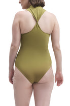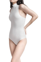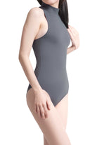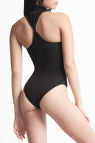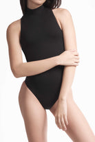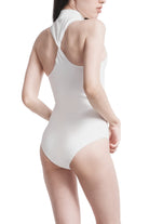 A semi-halter bodysuit with a mock neck, twisted back design, snap closures, and embroidered logo.