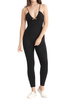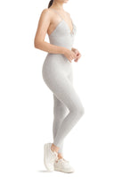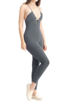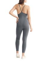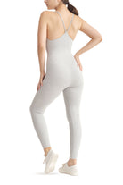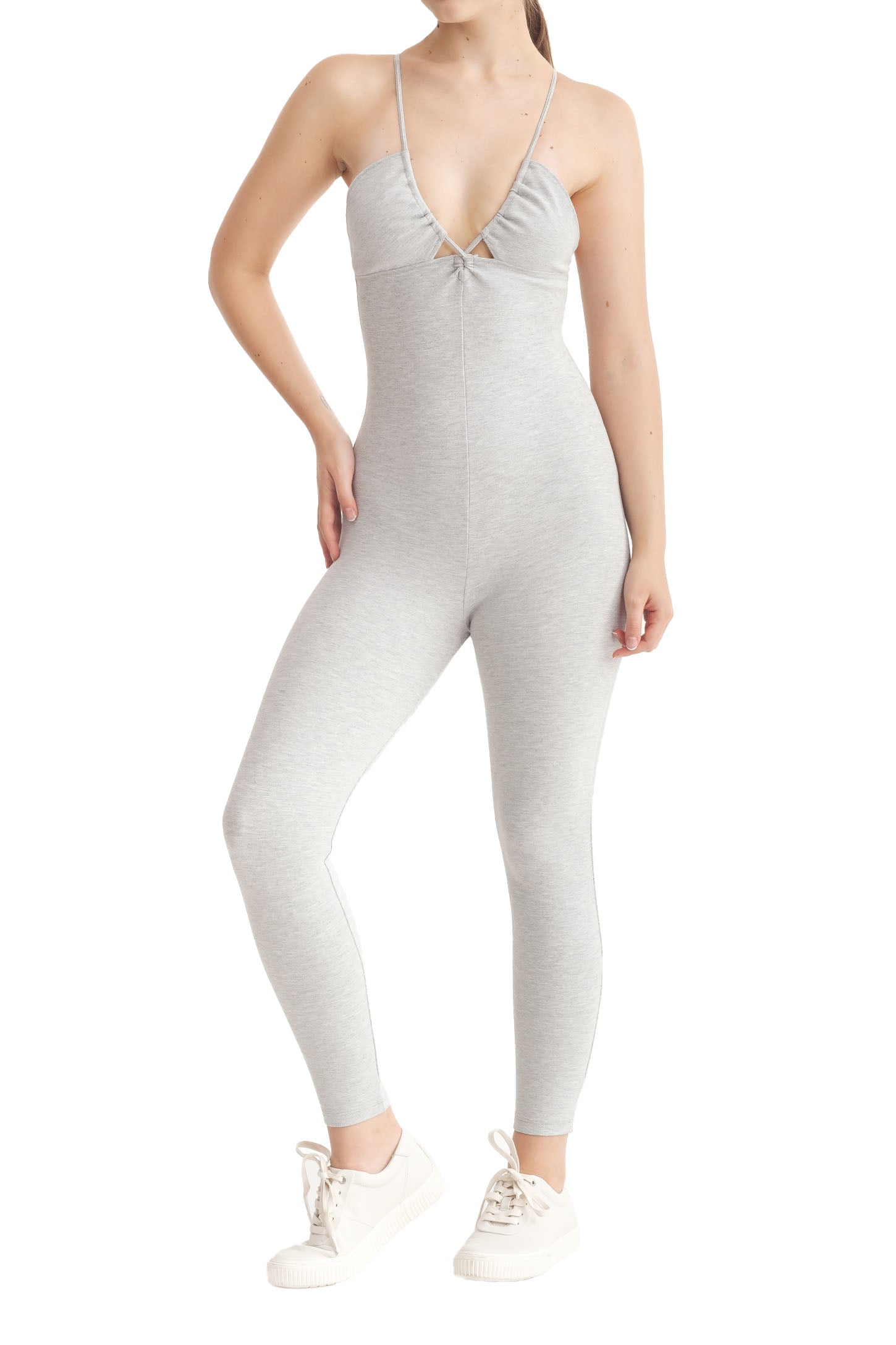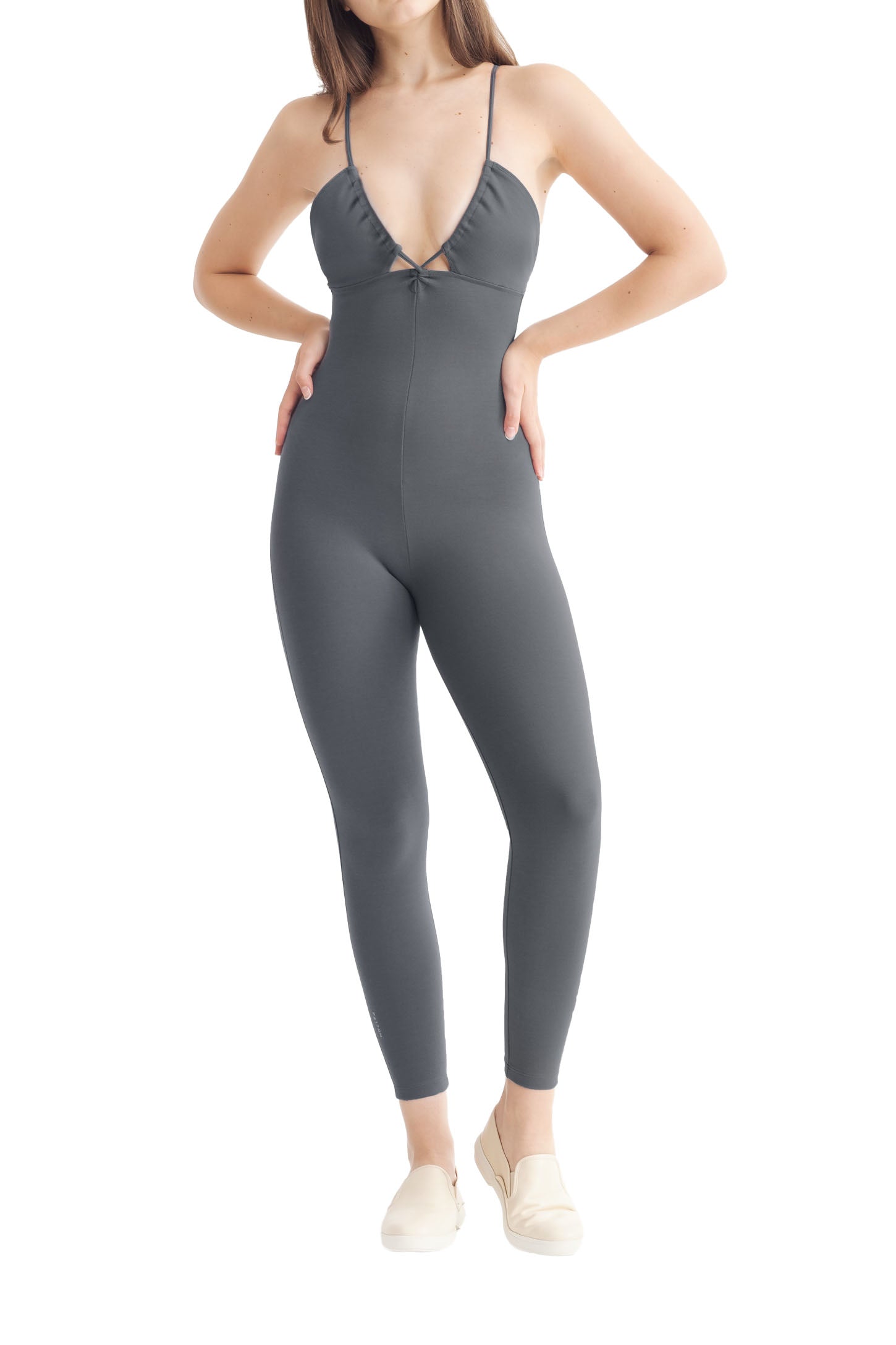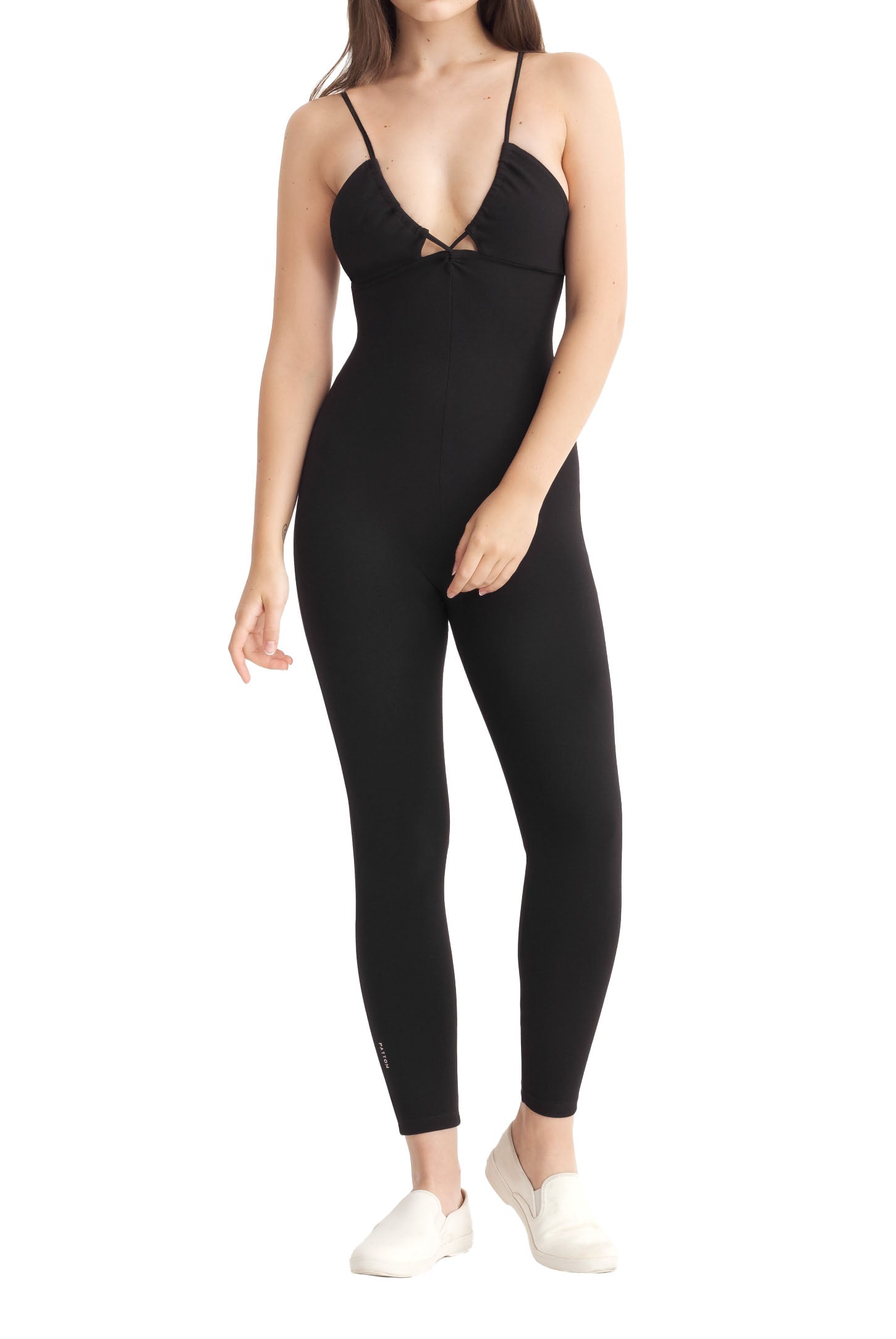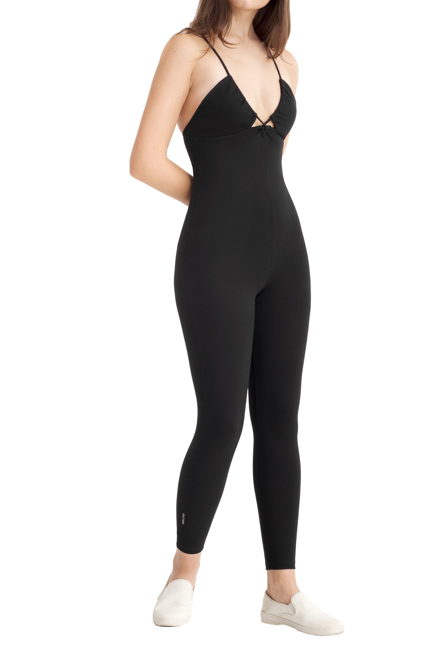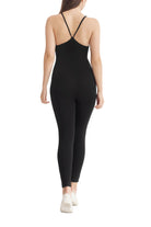 A full-length sleeveless unitard with a plunge neckline, cut out details, adjustable straps, slit opening for bra pads, and embroidered logo.