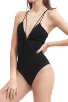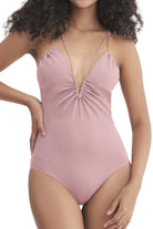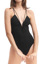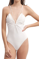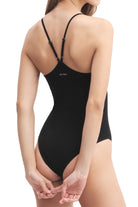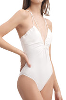 A sleeveless bodysuit featuring a ruched plunge V-neckline, adjustable straps, slit opening for bra pads, snap closures, and an embroidered logo.