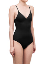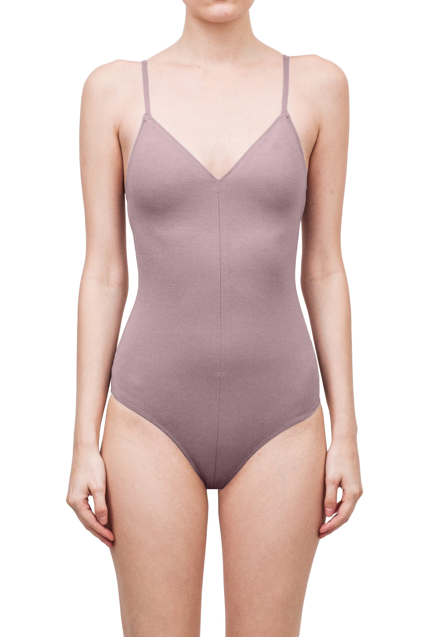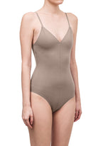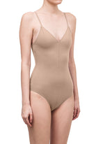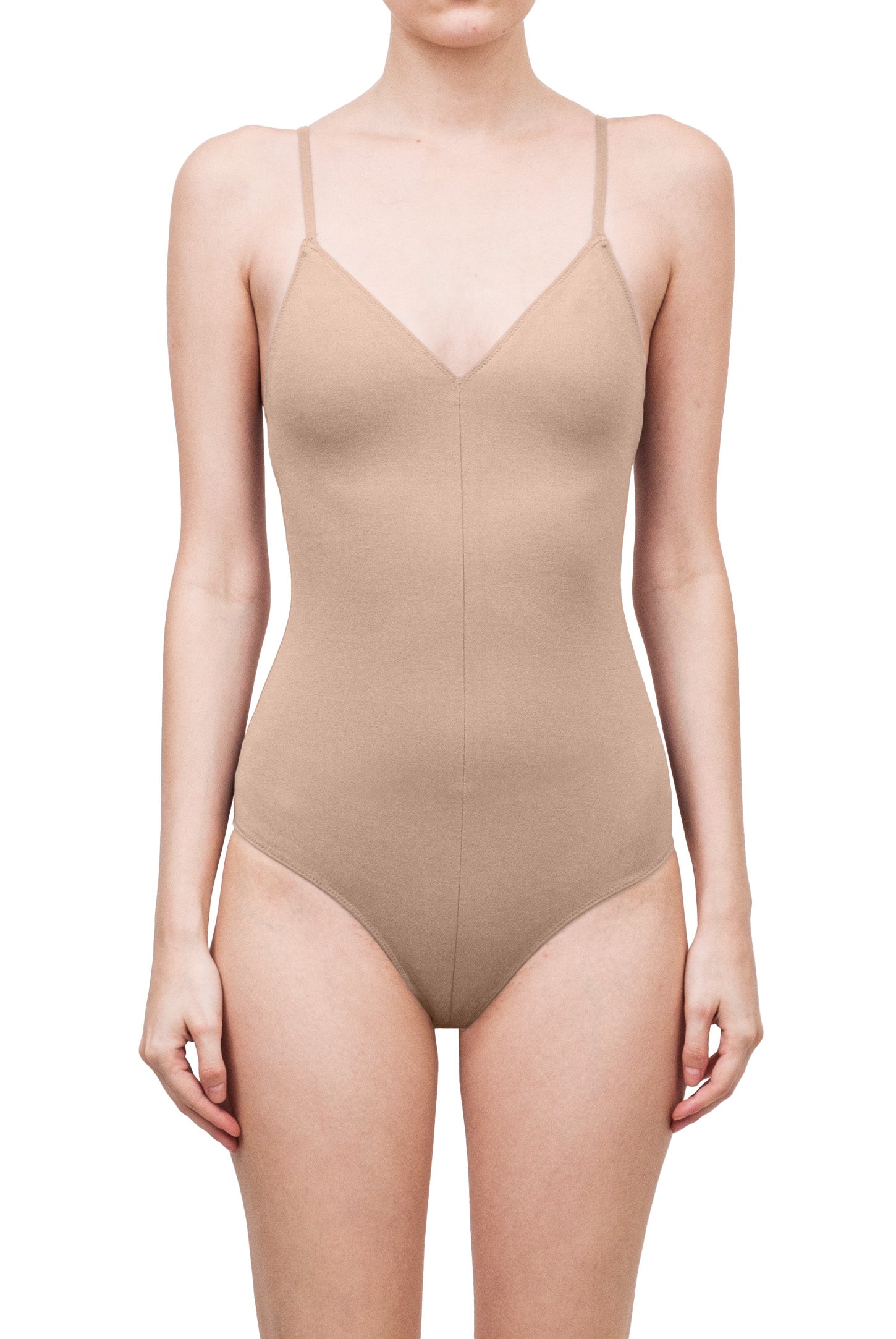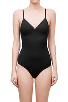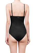 A sleeveless bodysuit with a V-neckline, adjustable straps, snap closures, and an embroidered logo.