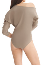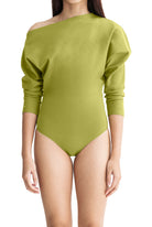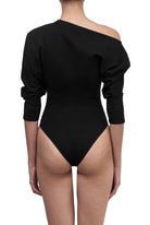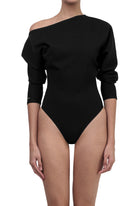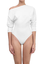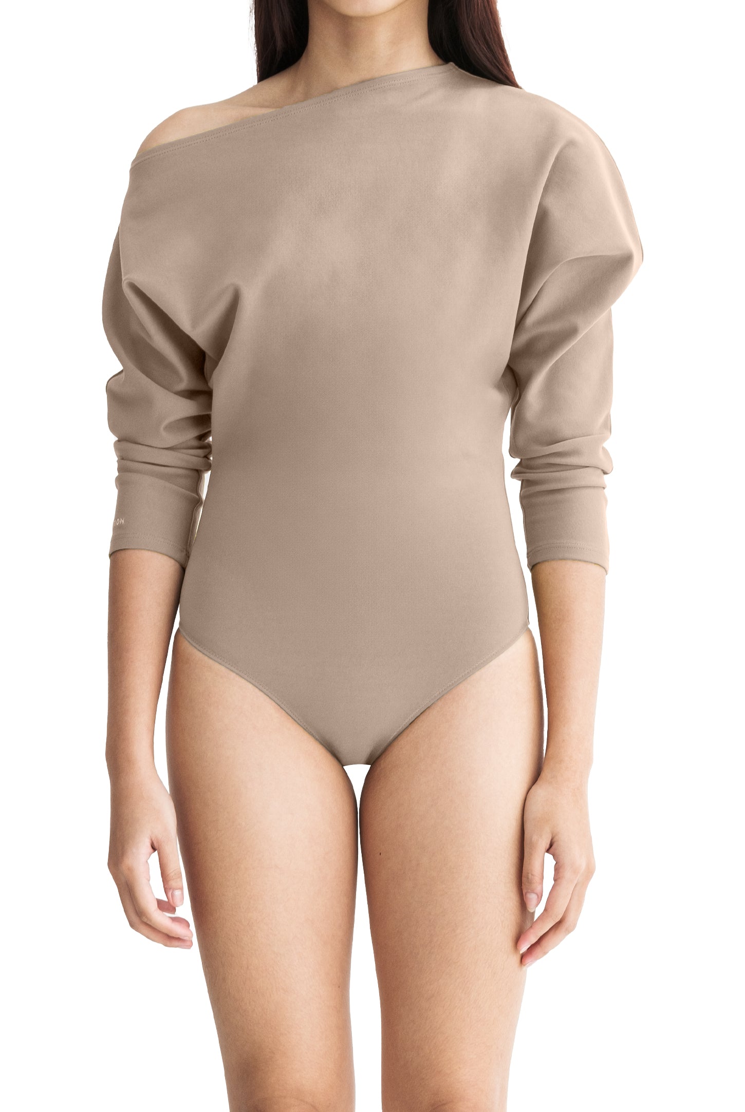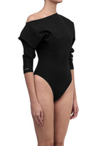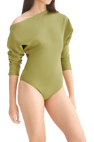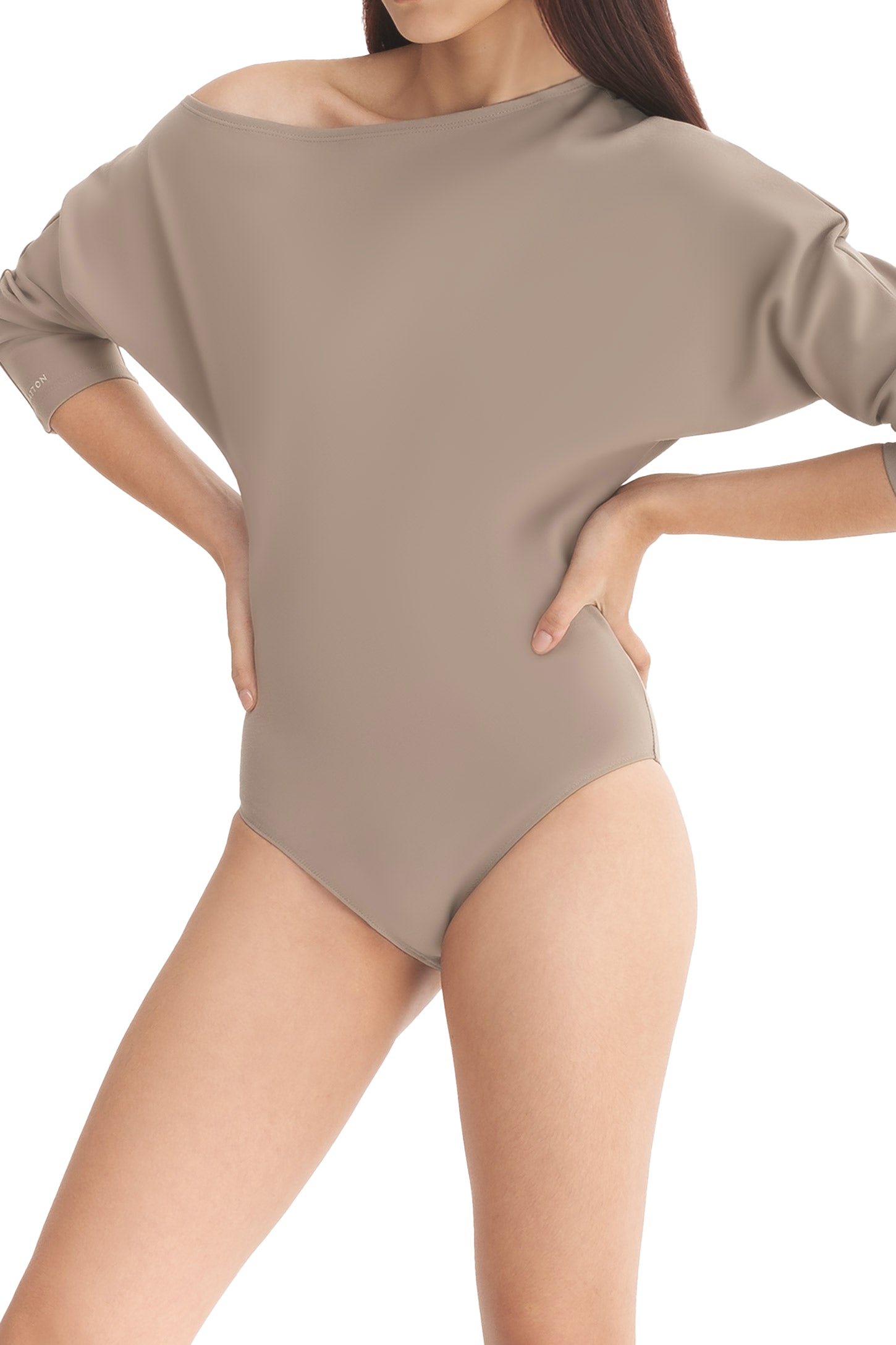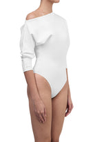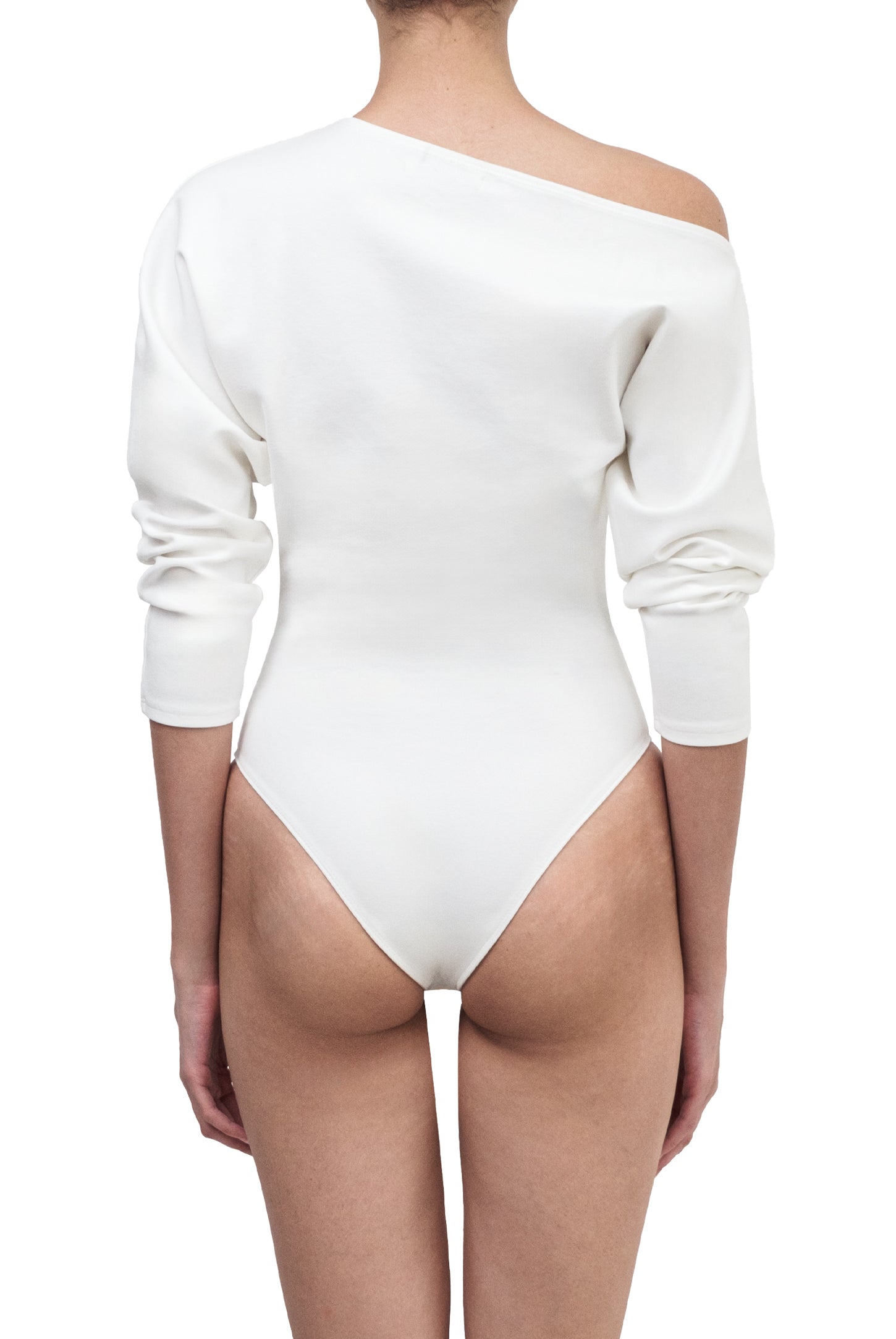 A long-sleeve bodysuit with an asymmetric neckline, embroidered logo in one sleeve and snap buttons.