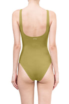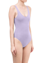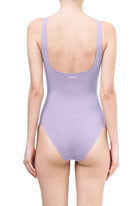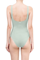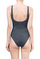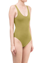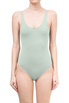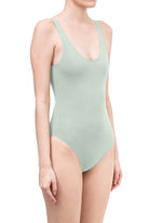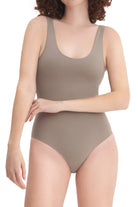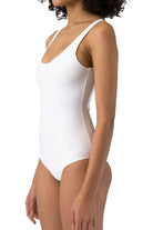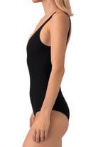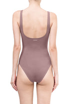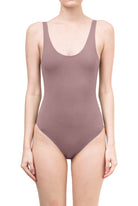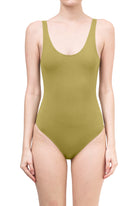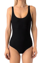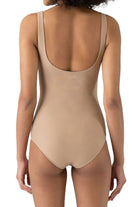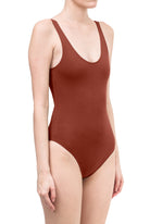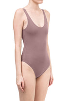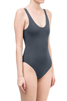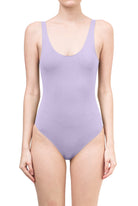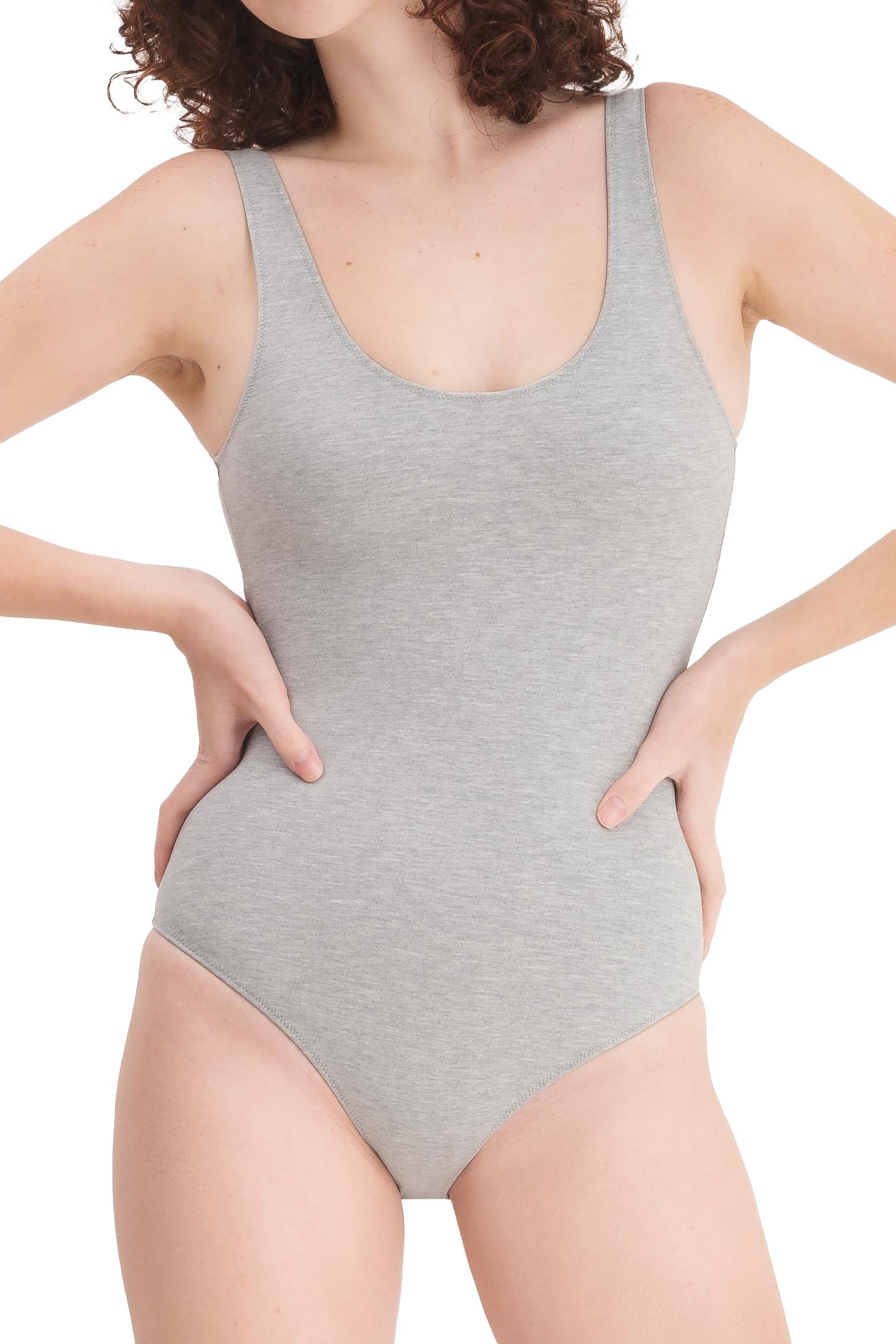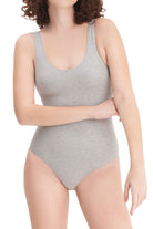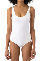 A sleeveless bodysuit featuring a scoop neckline and low-cut back with snap closures and an embroidered logo.