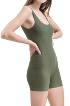 A biker-short length unitard with a classic scoop neckline, low back, side pockets, and embroidered logo.