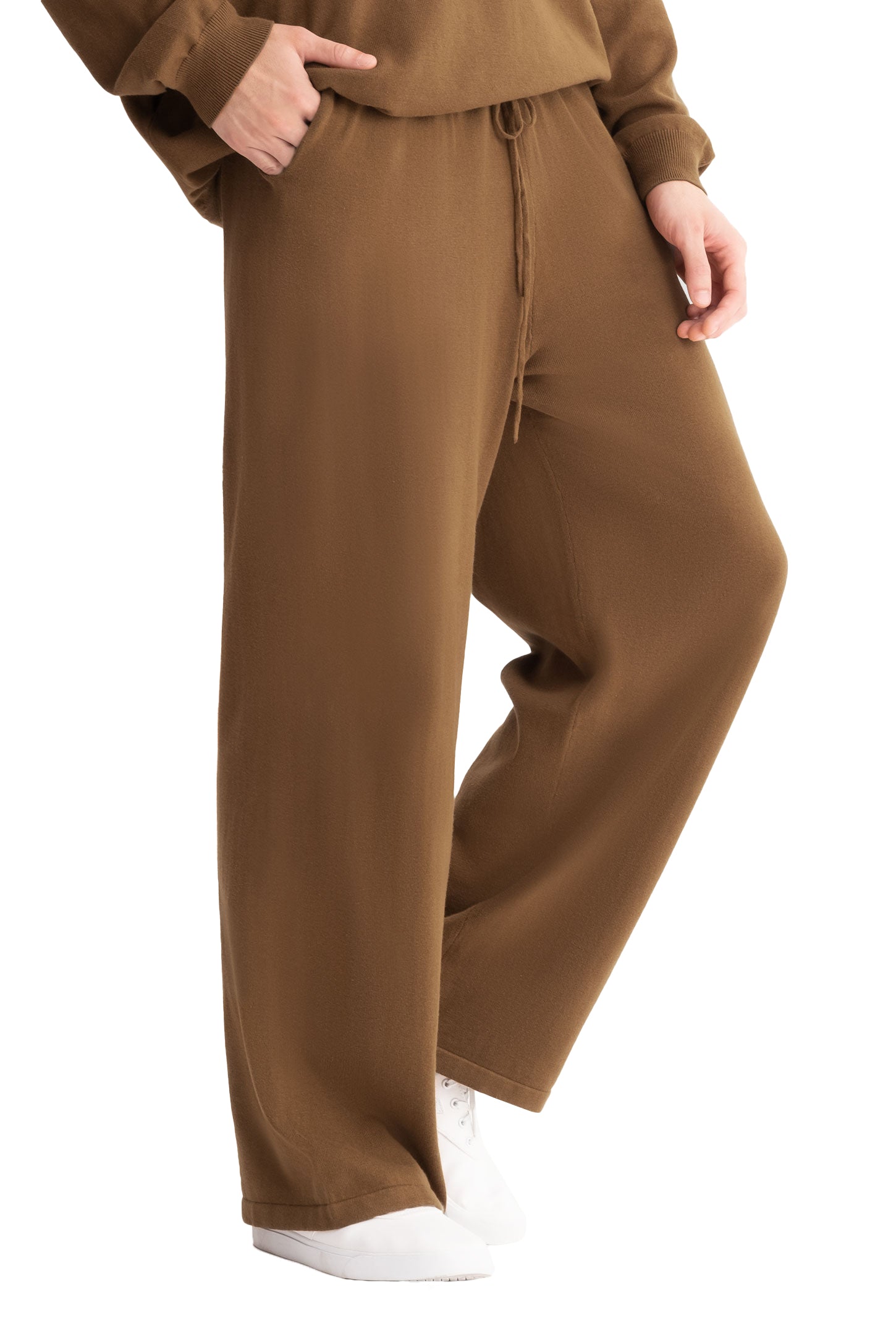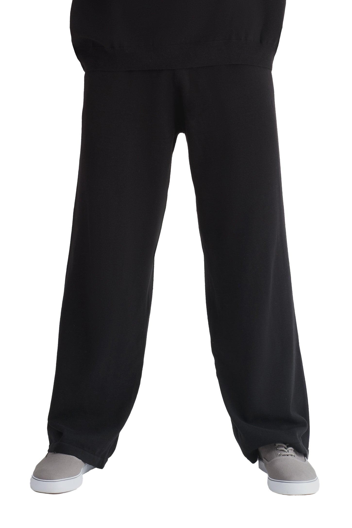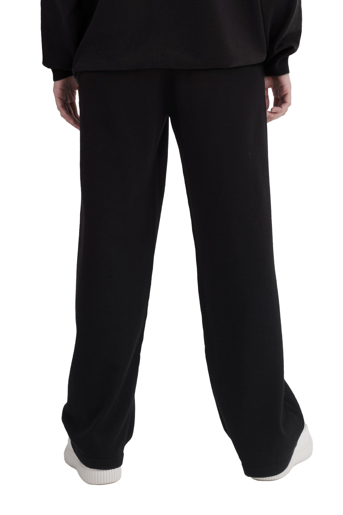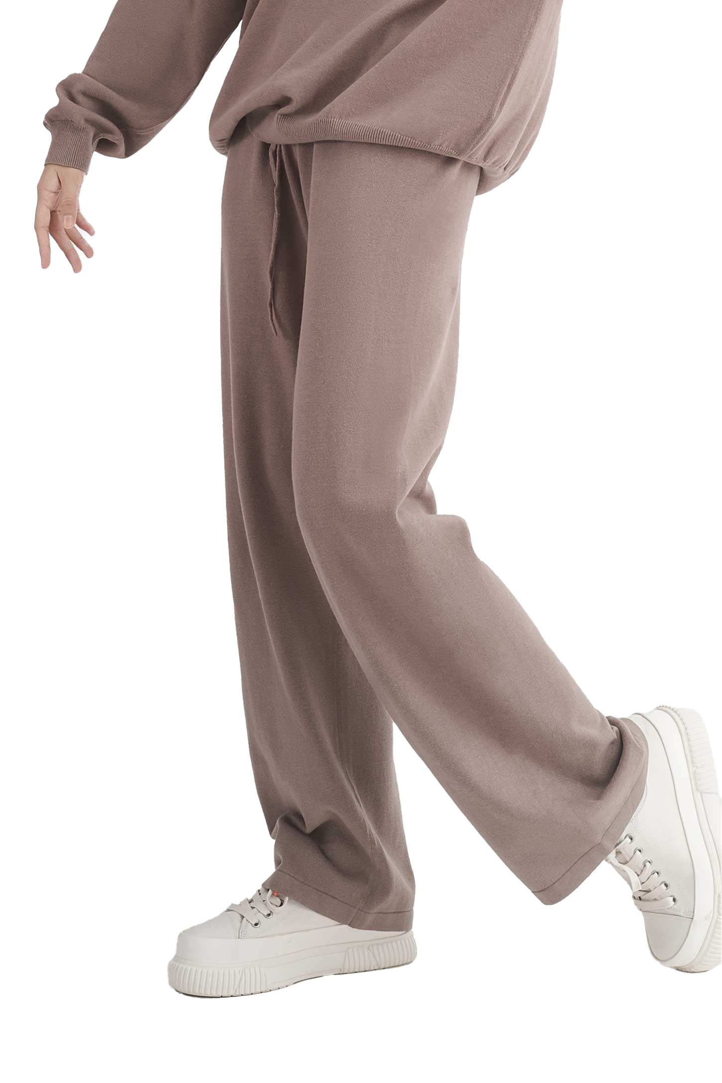 Unisex high-waisted knitted joggers with a loose, straight leg fit, side pockets, and adjustable drawstring waistband.