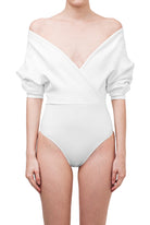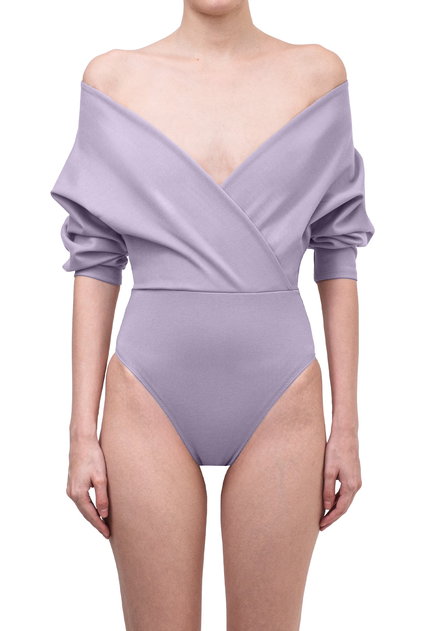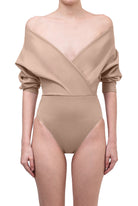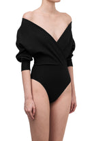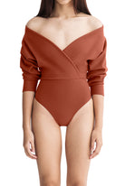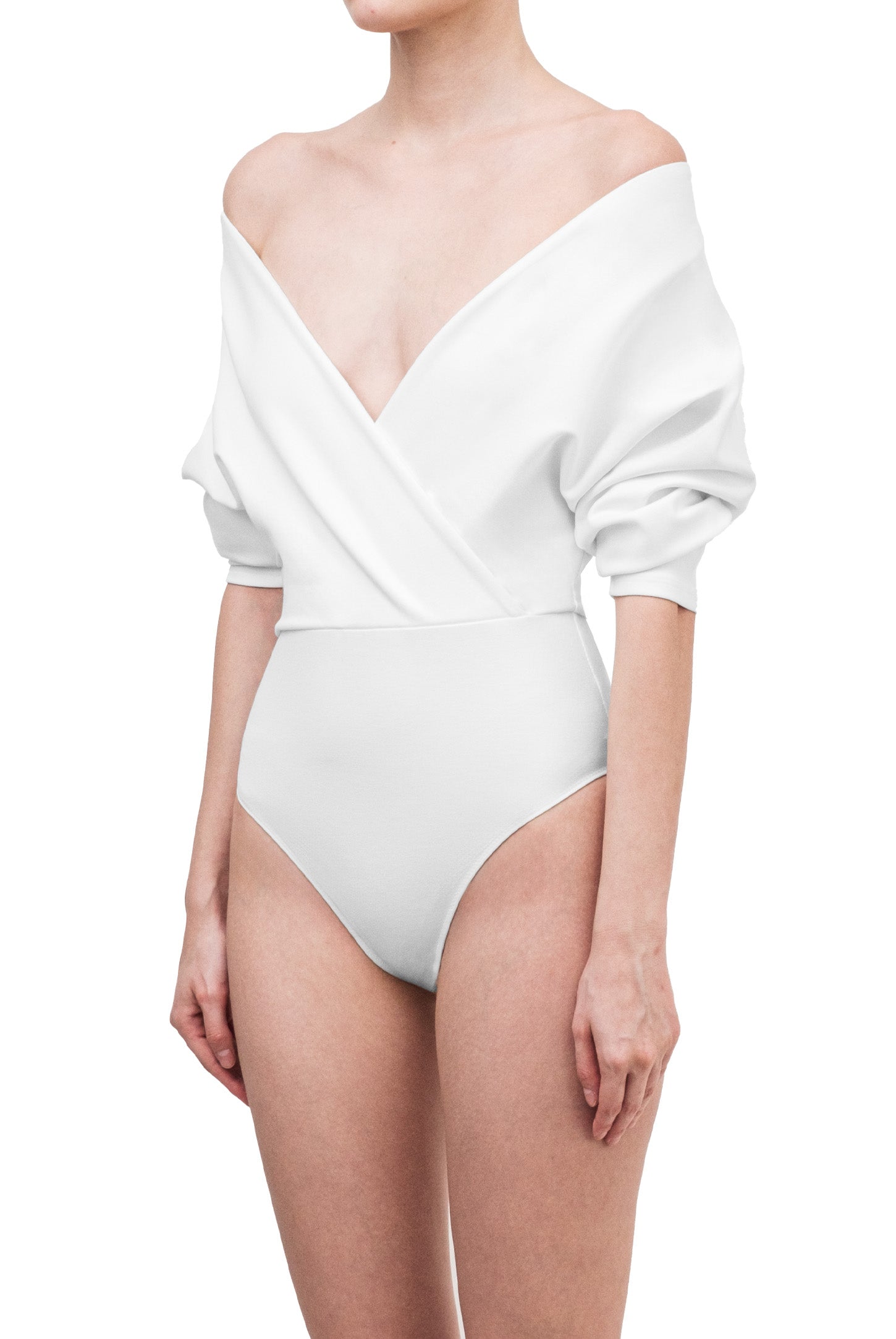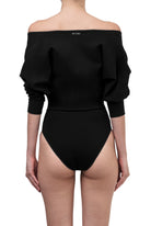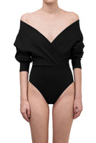 A long-sleeve bodysuit with cross wrap design, embroidered logo at the back and snap buttons. Wear as is or off the shoulder.