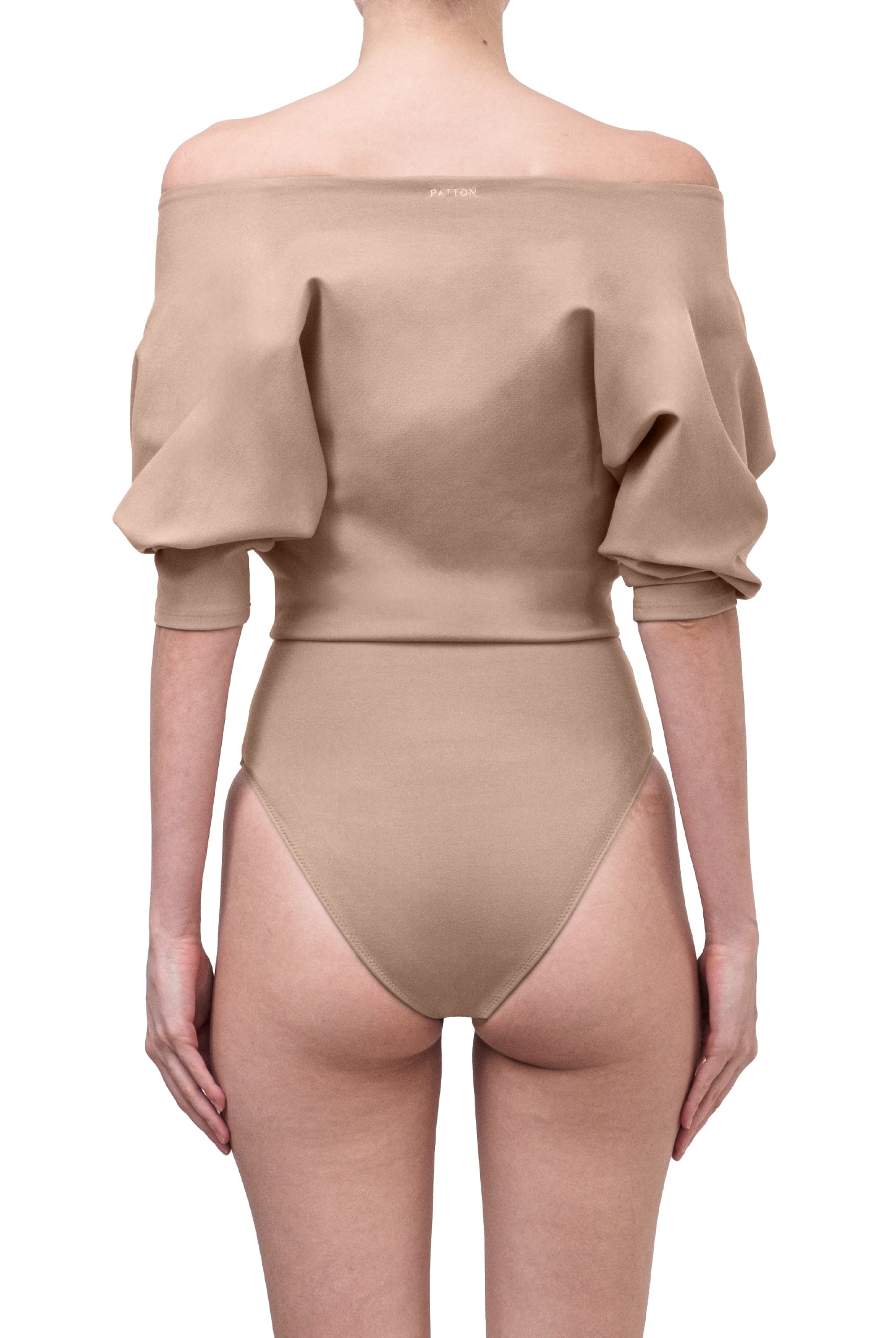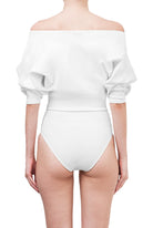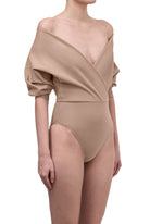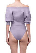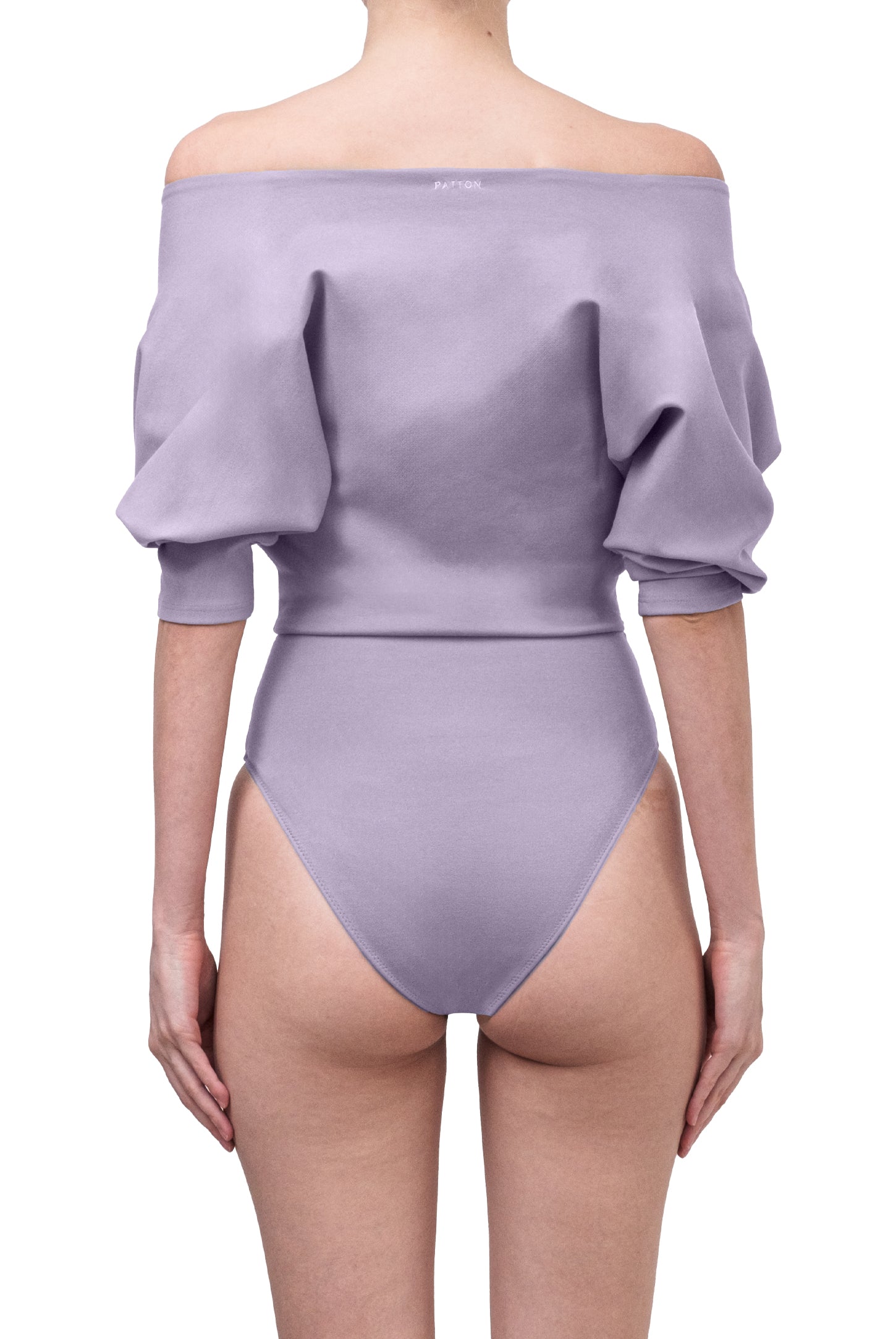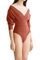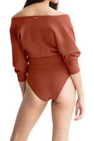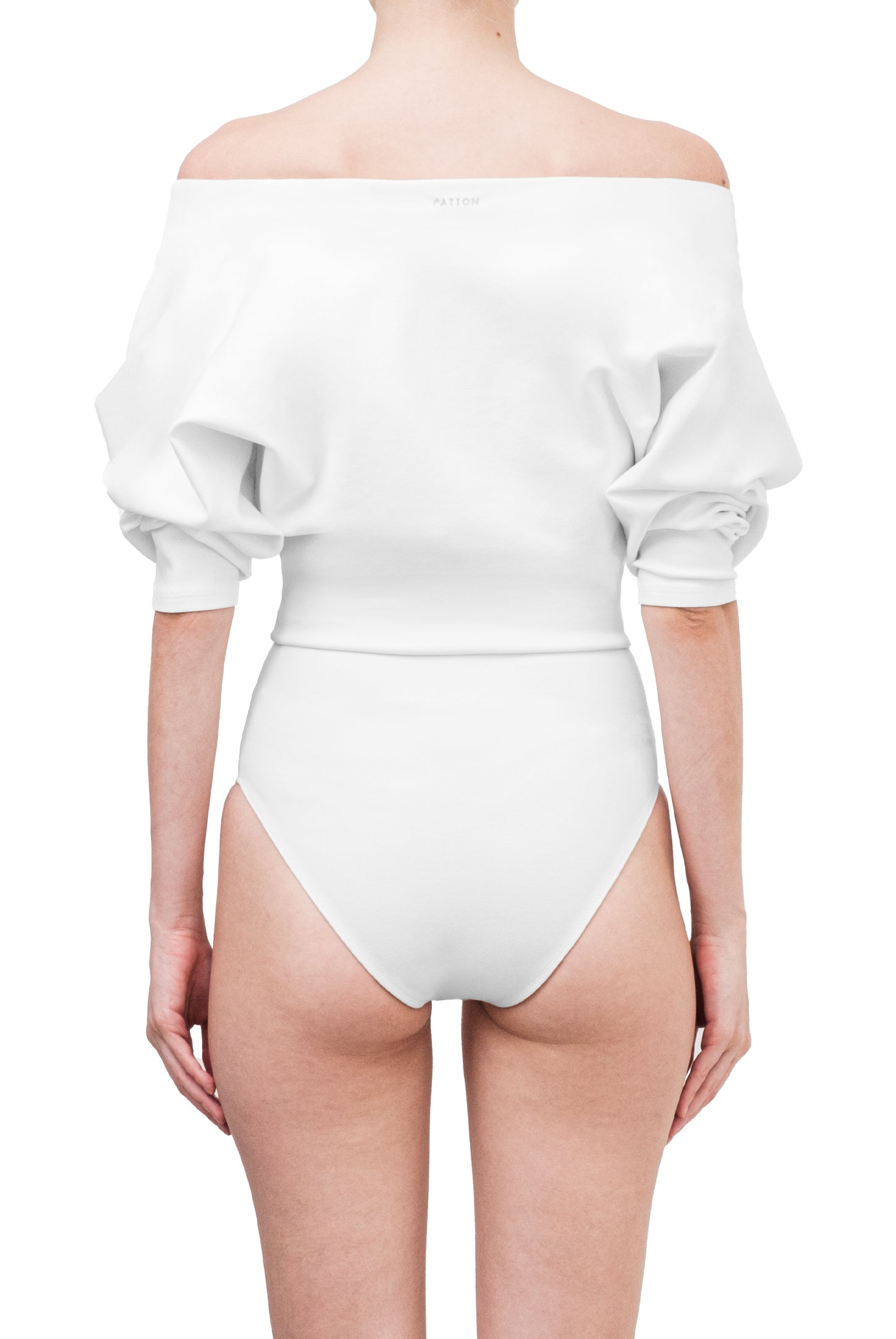 A long-sleeve bodysuit with cross wrap design, embroidered logo at the back and snap buttons. Wear as is or off the shoulder.
