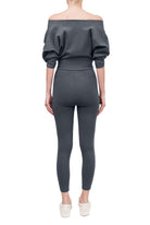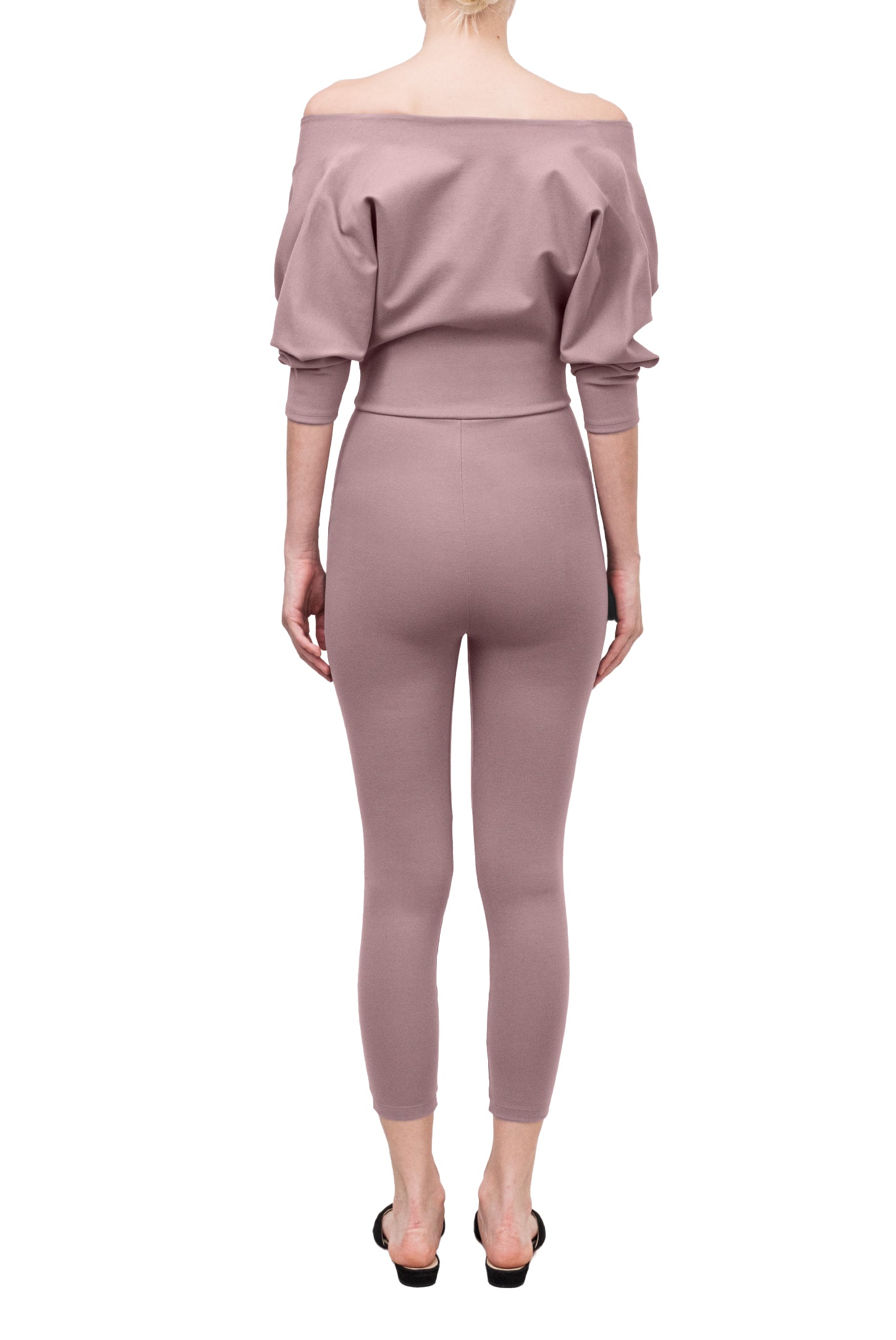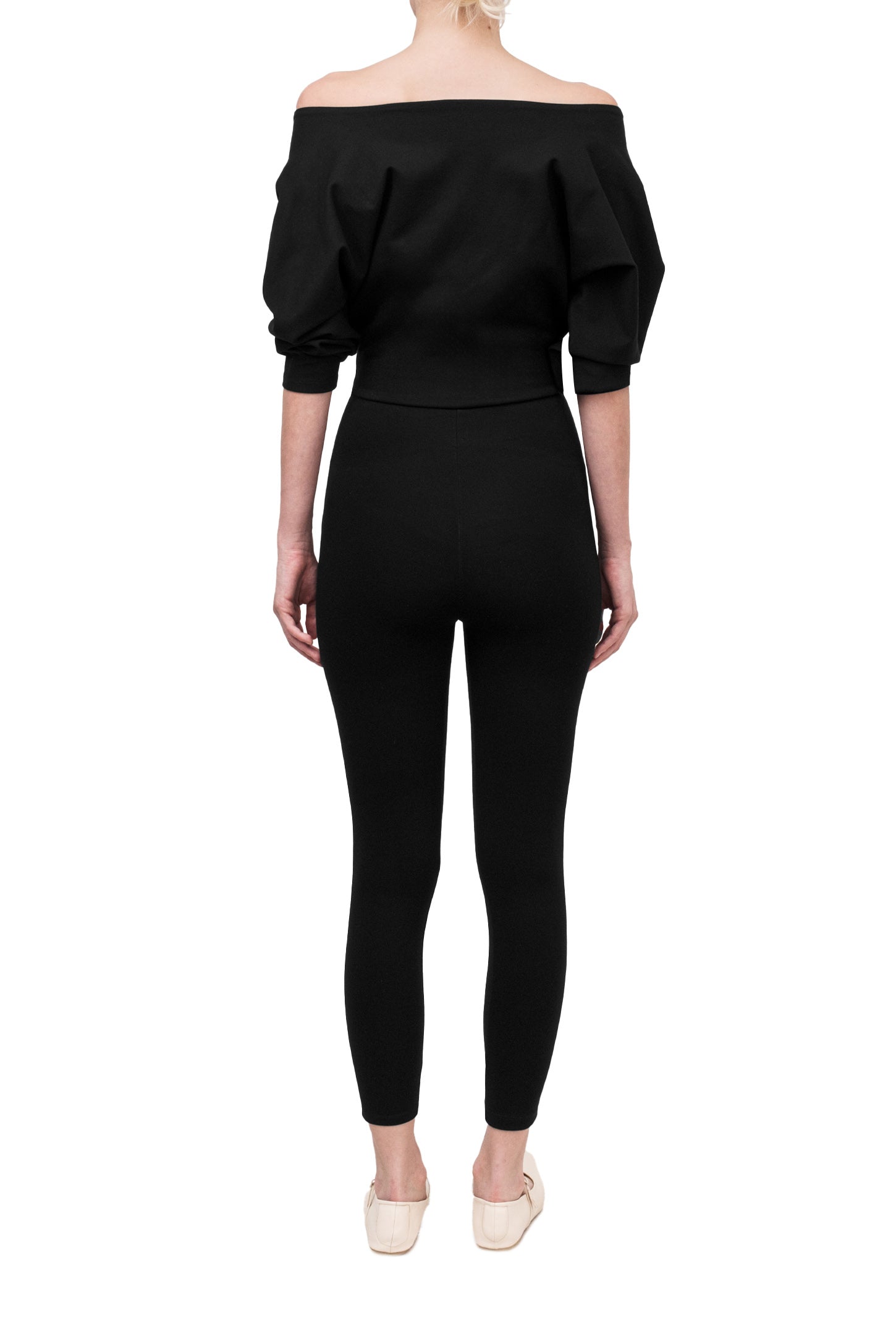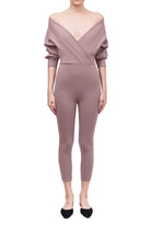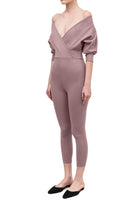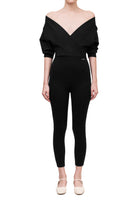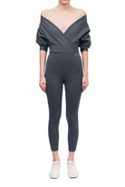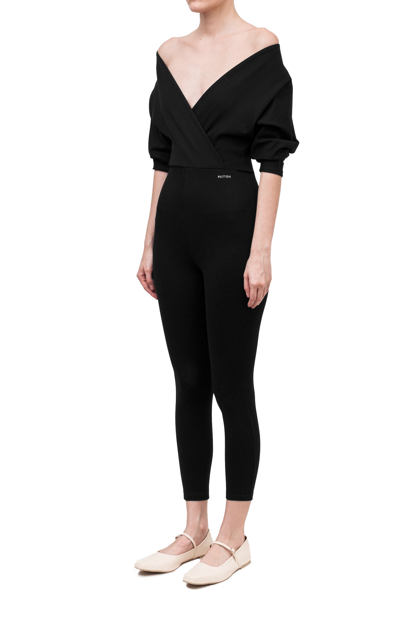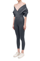 A full-length unitard with long sleeves, cross wrap design, and an embroidered logo.