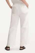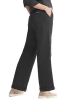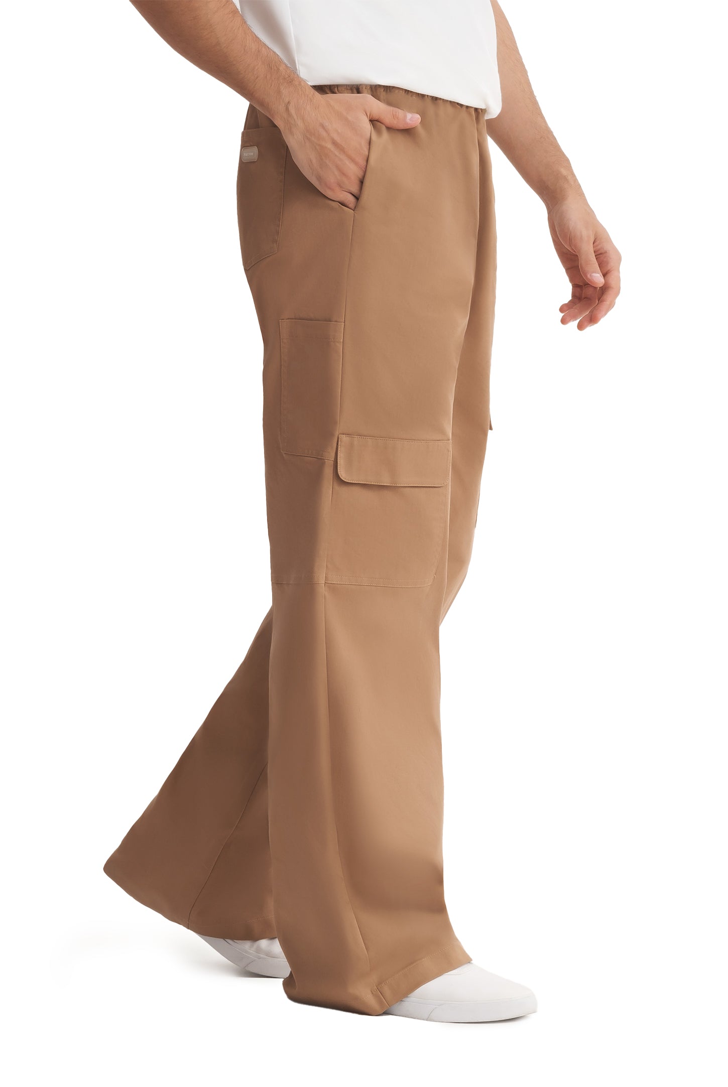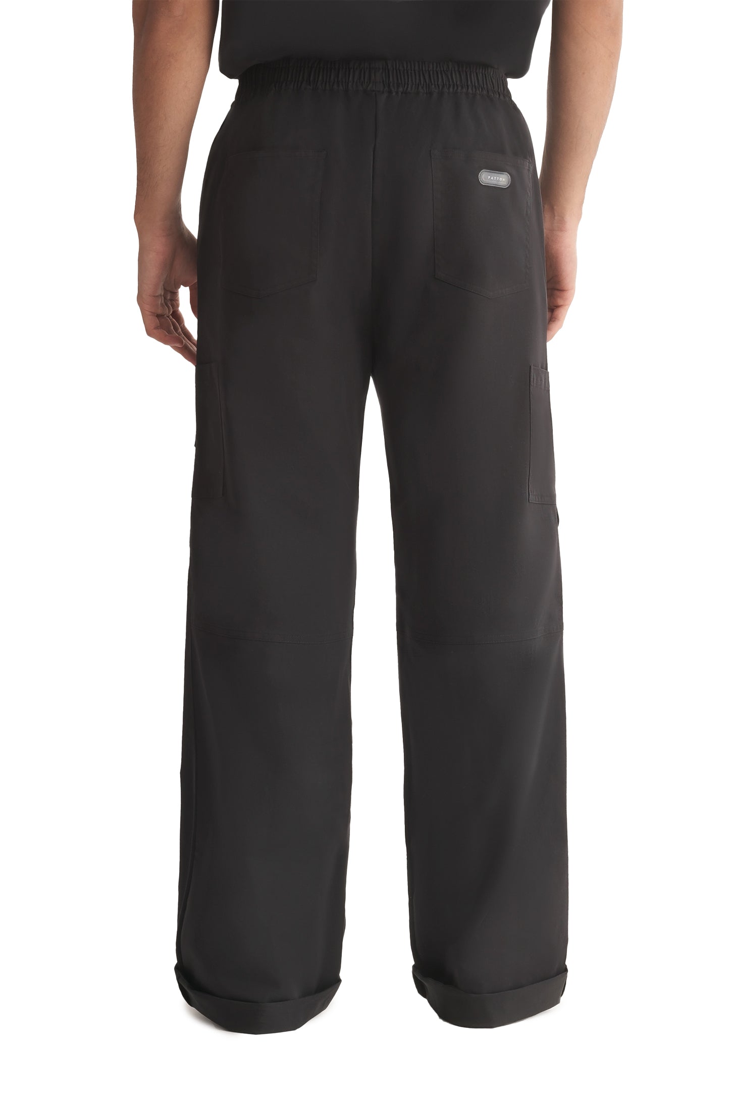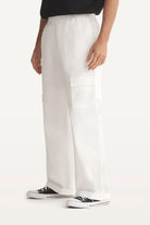 Mid-rise unisex straight-leg pants with a gartered waistband, uneven flap pockets, side and back pockets, and a rubber patch logo.