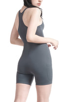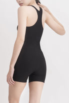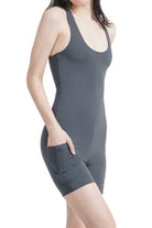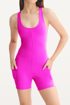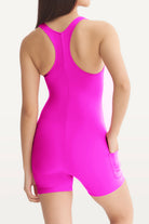 A biker-short length unitard with a classic scoop neck and racer back, side pockets, and an embroidered logo.