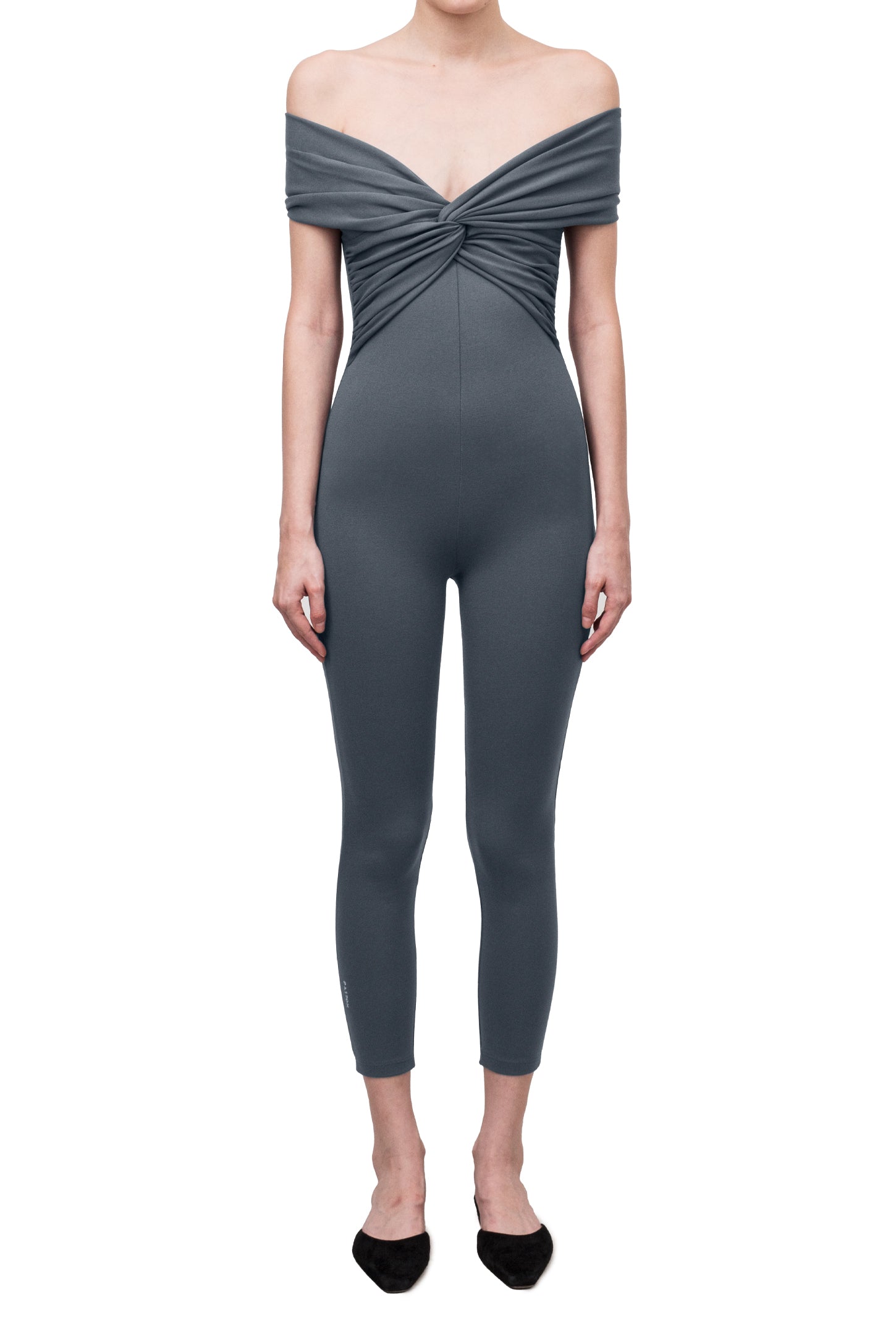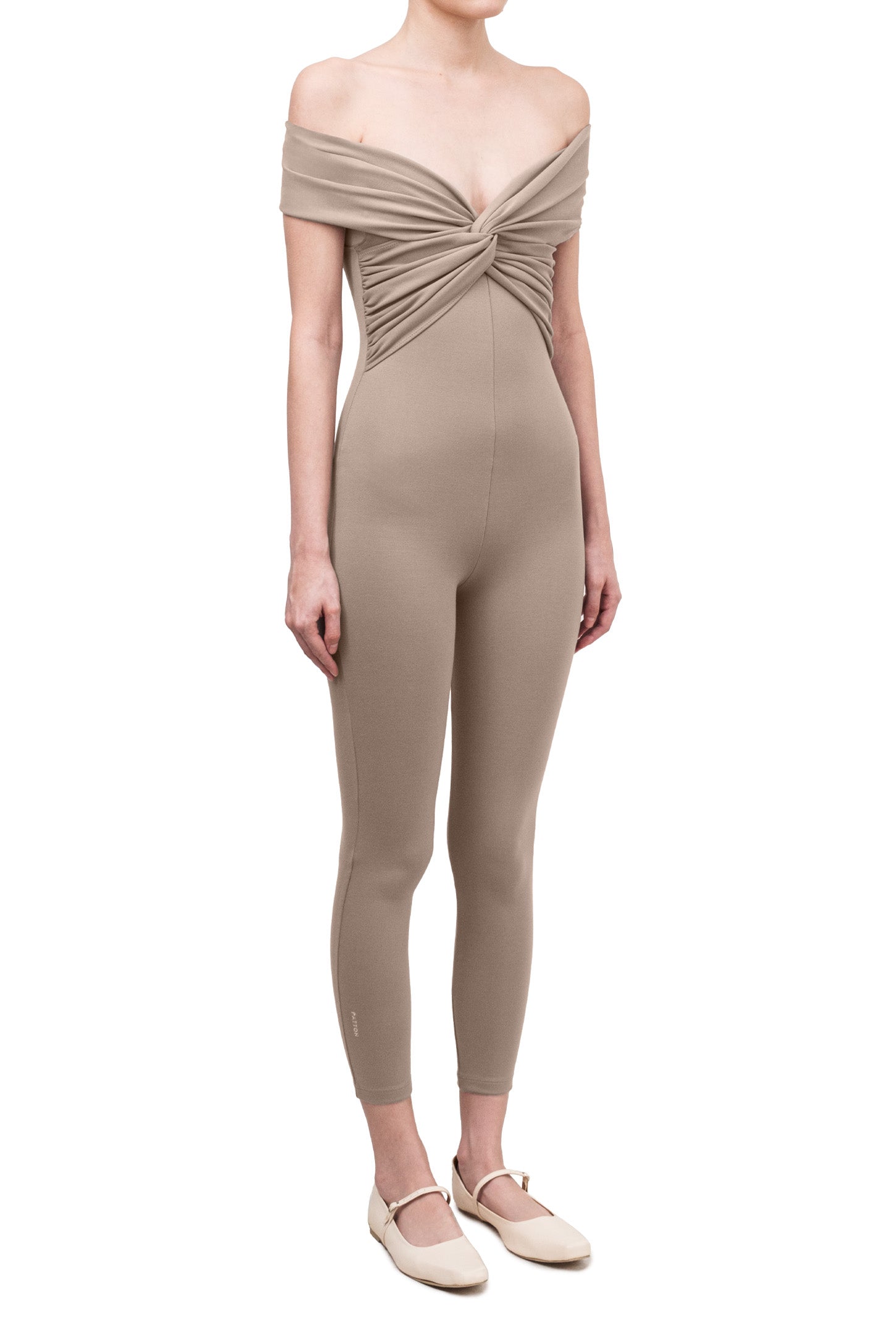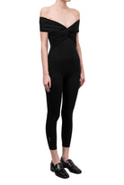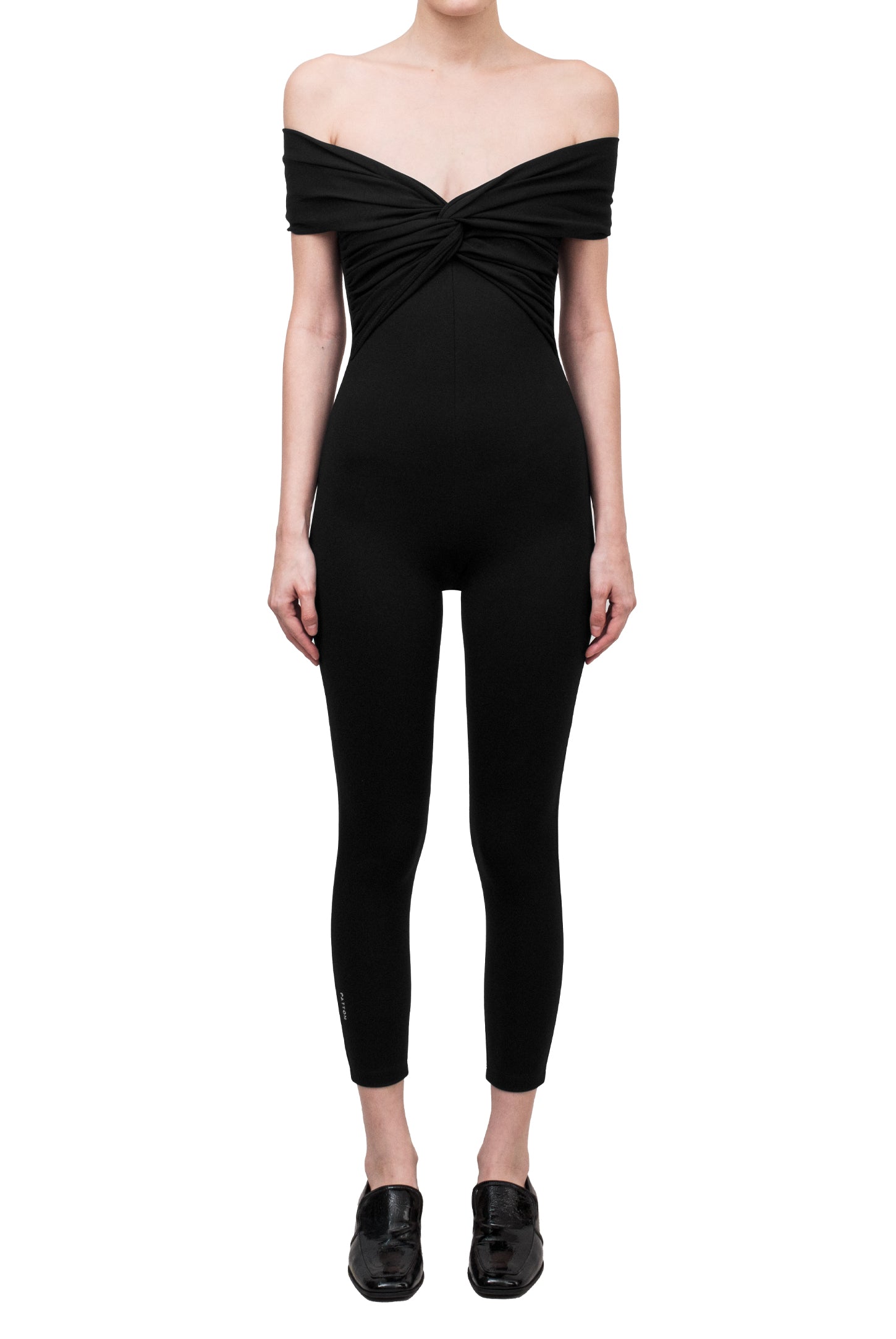 A full-length unitard featuring a twisted frontal design that goes off the shoulder and an embroidered logo.