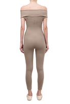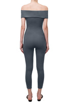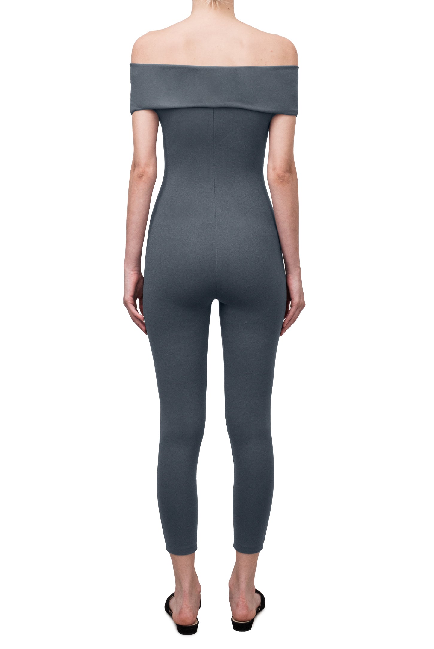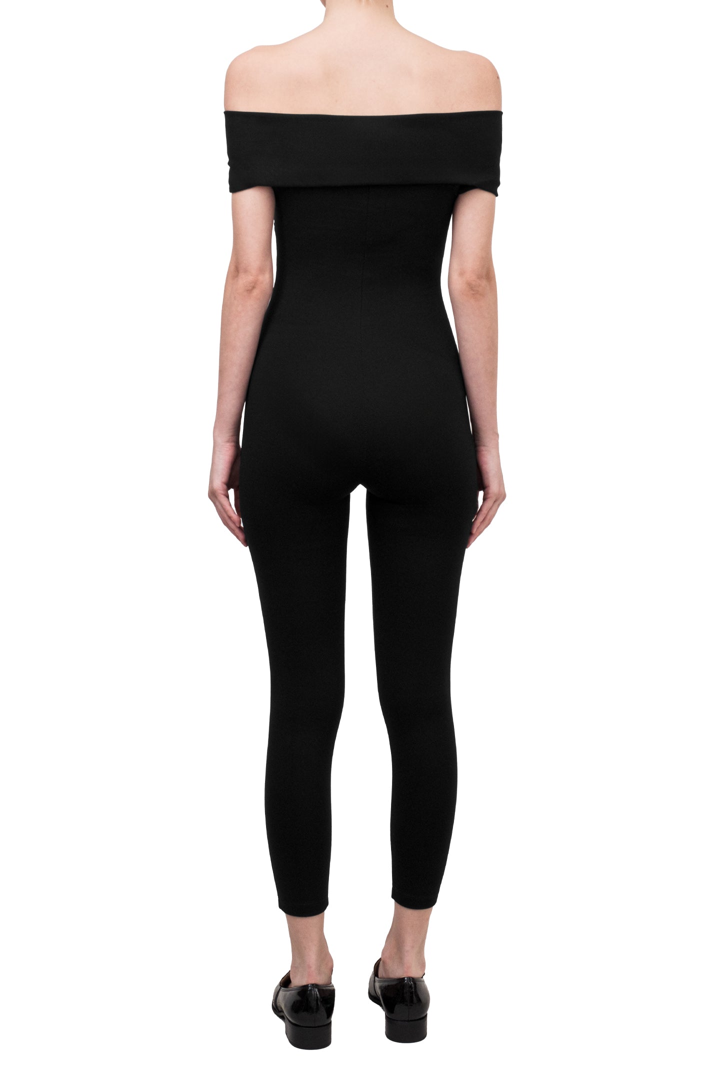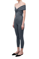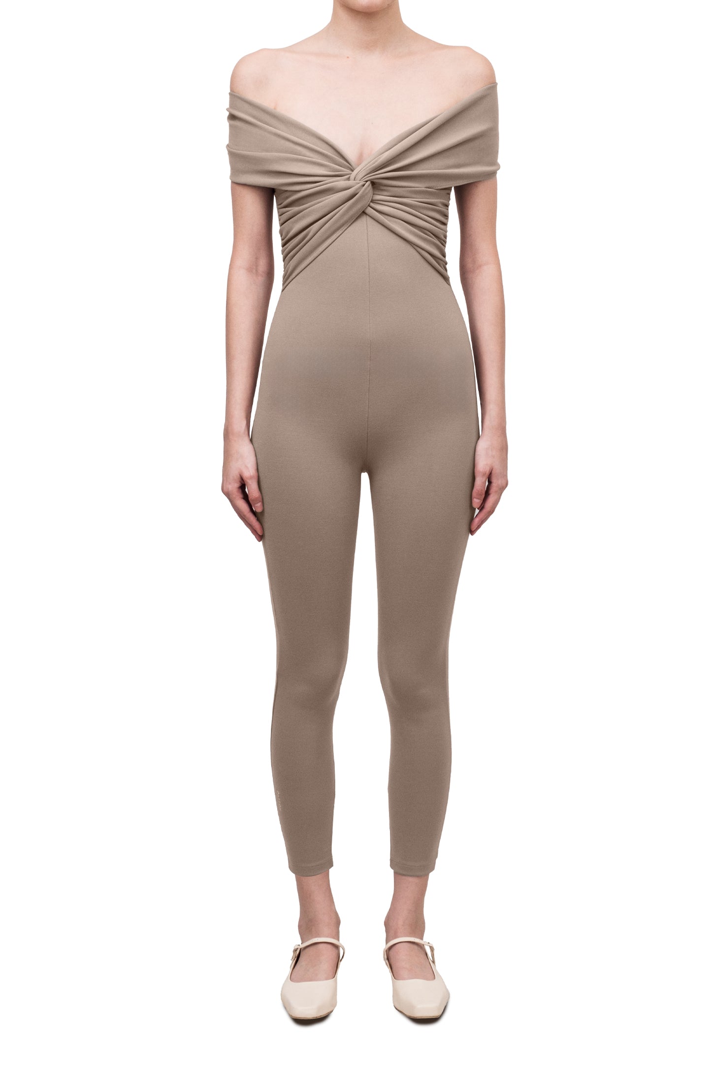 A full-length unitard featuring a twisted frontal design that goes off the shoulder and an embroidered logo.