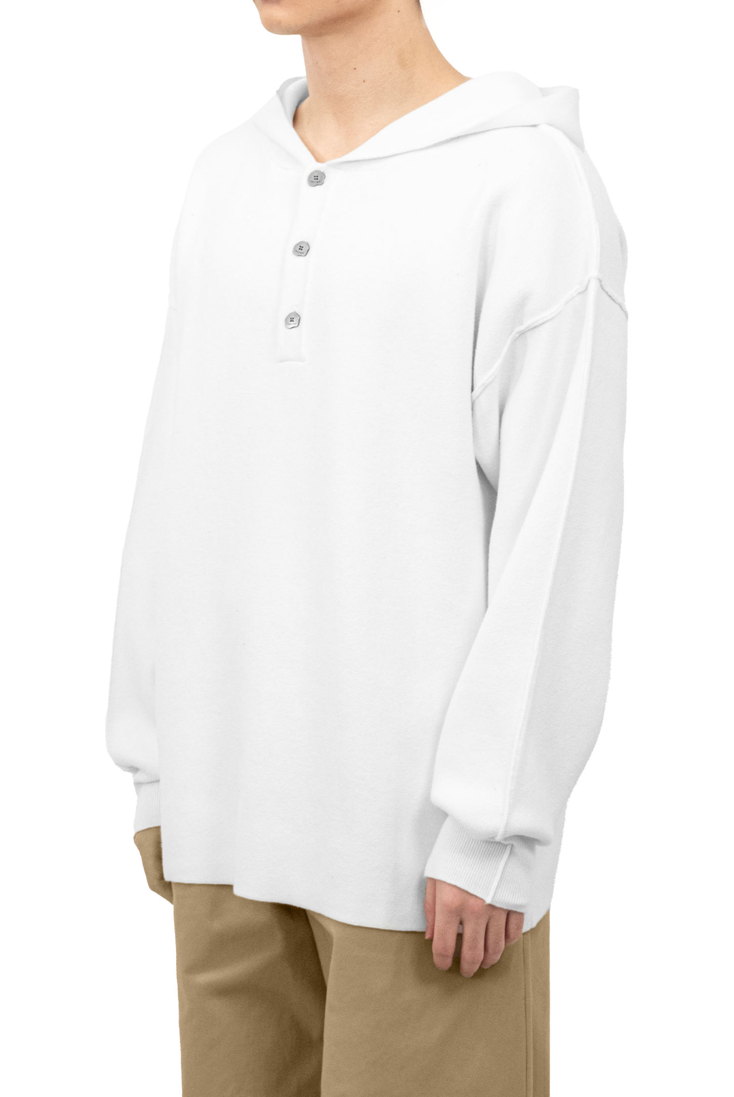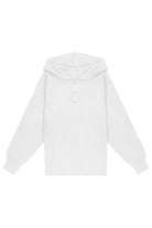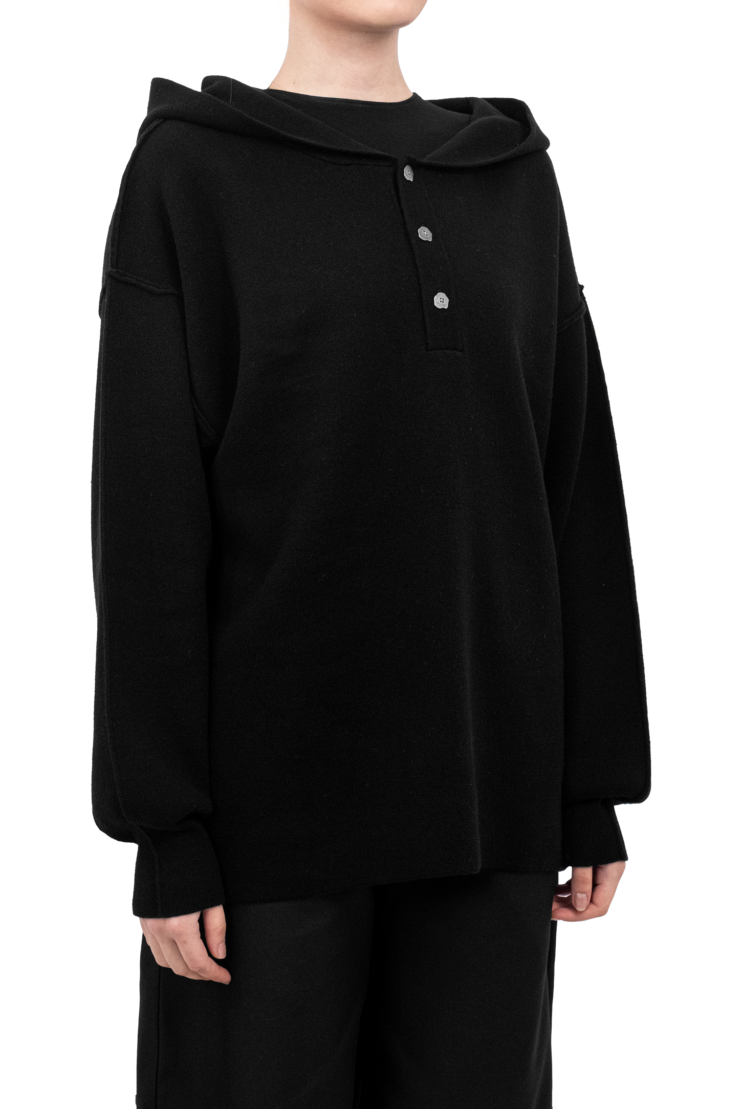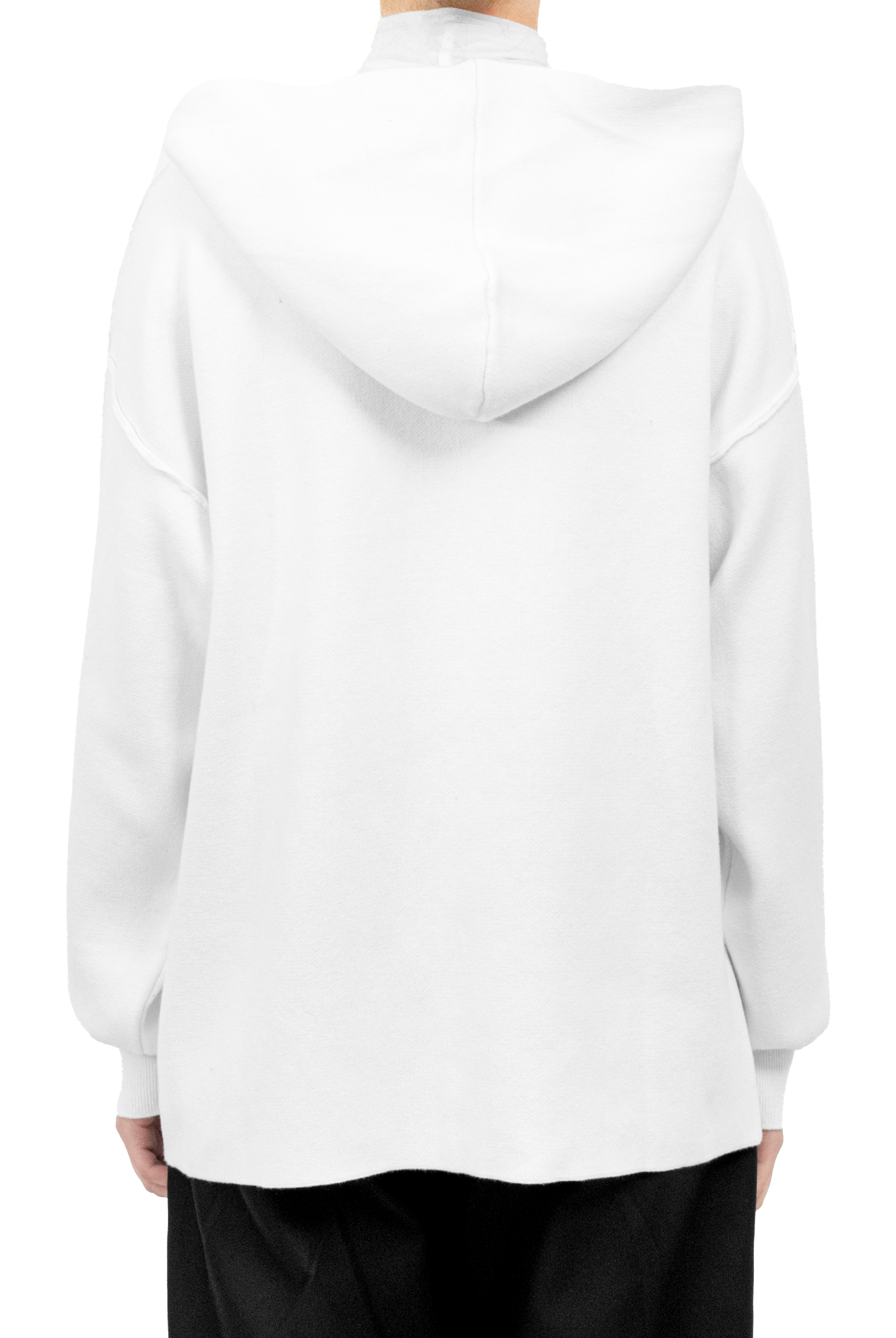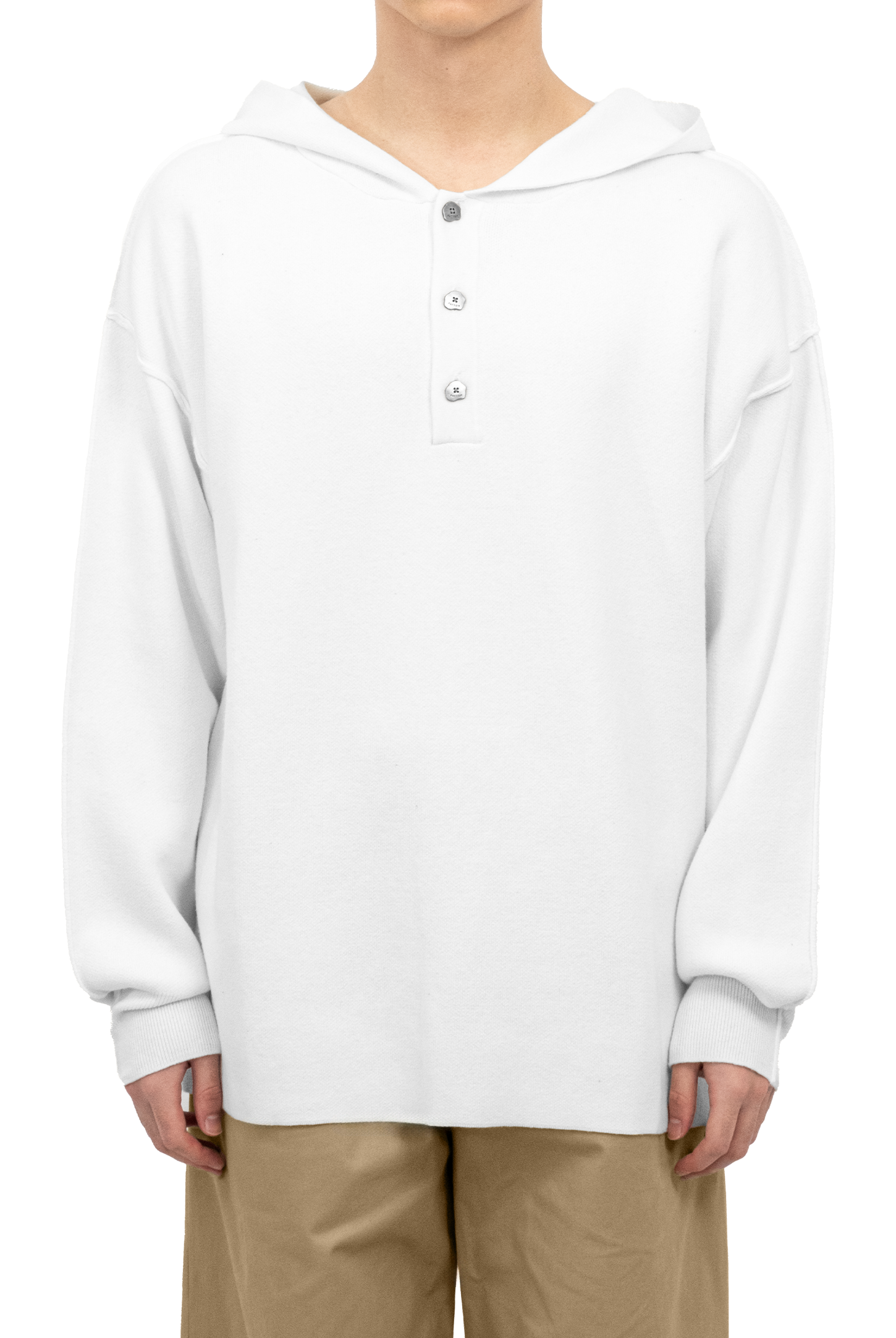 An oversized, unisex hoodie with metal button closures, and raw edge design.