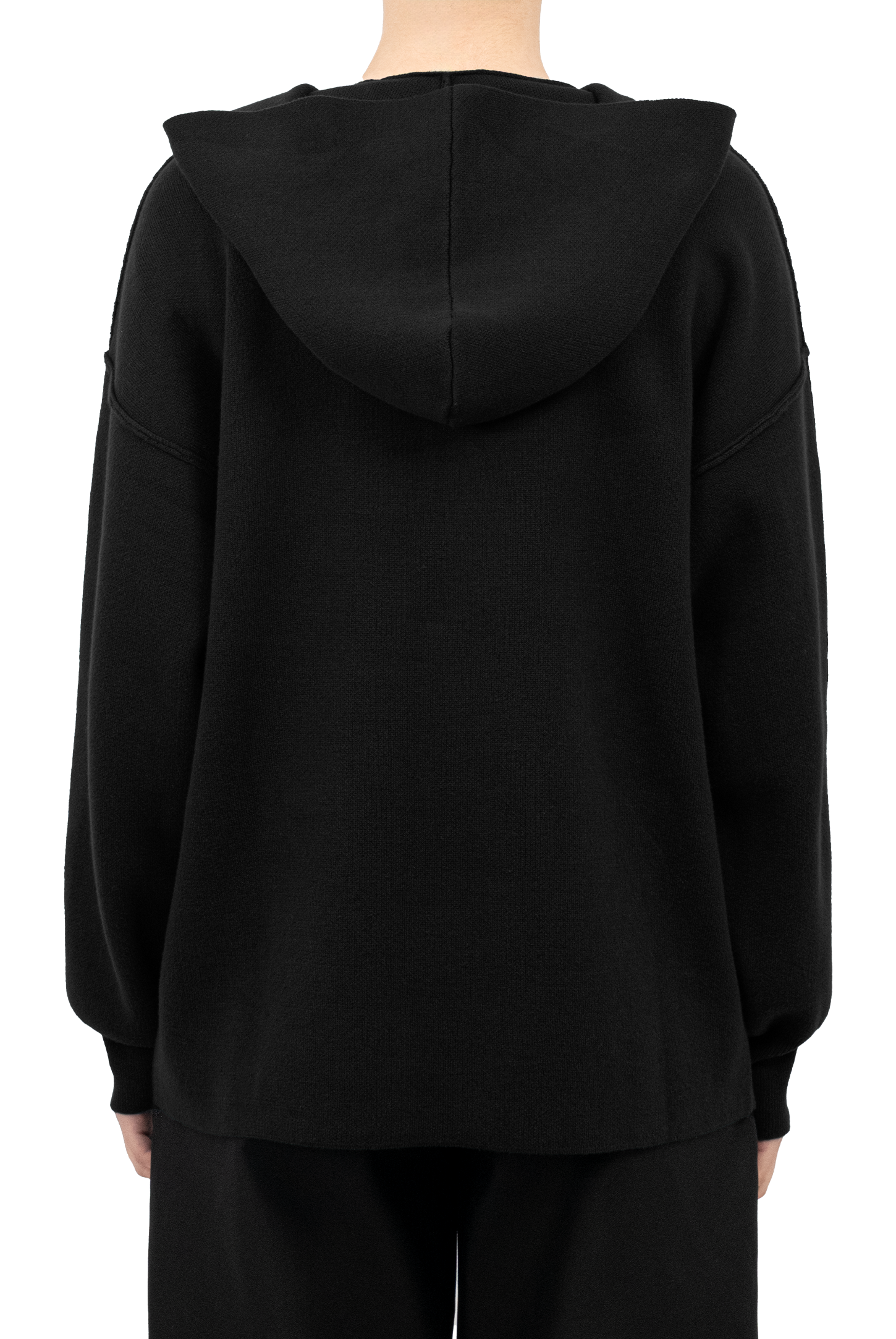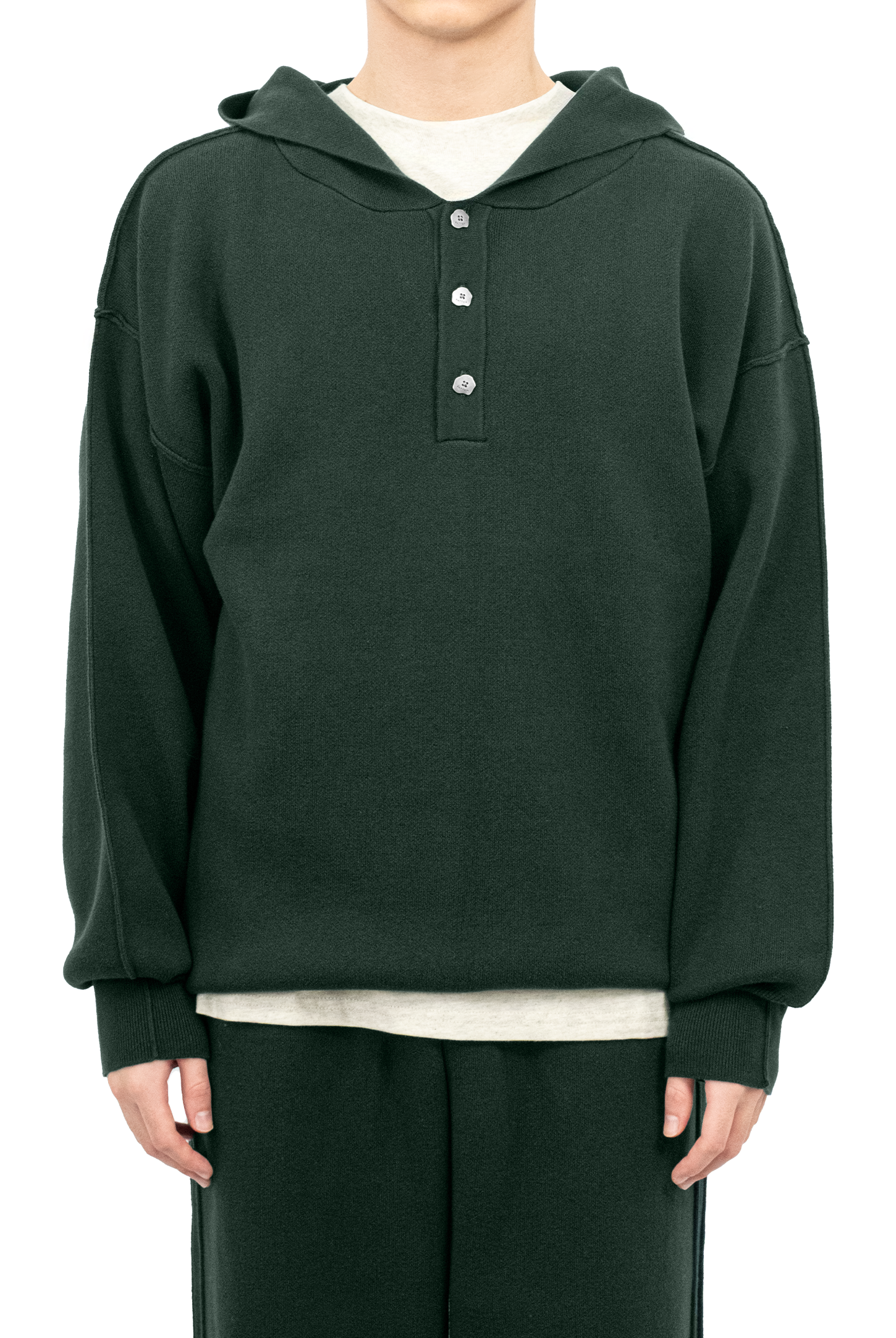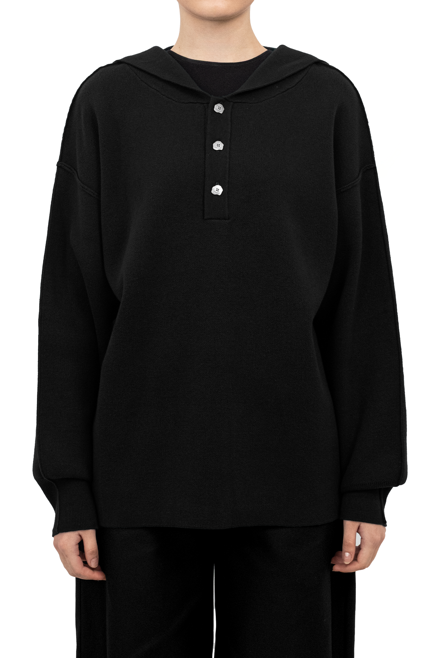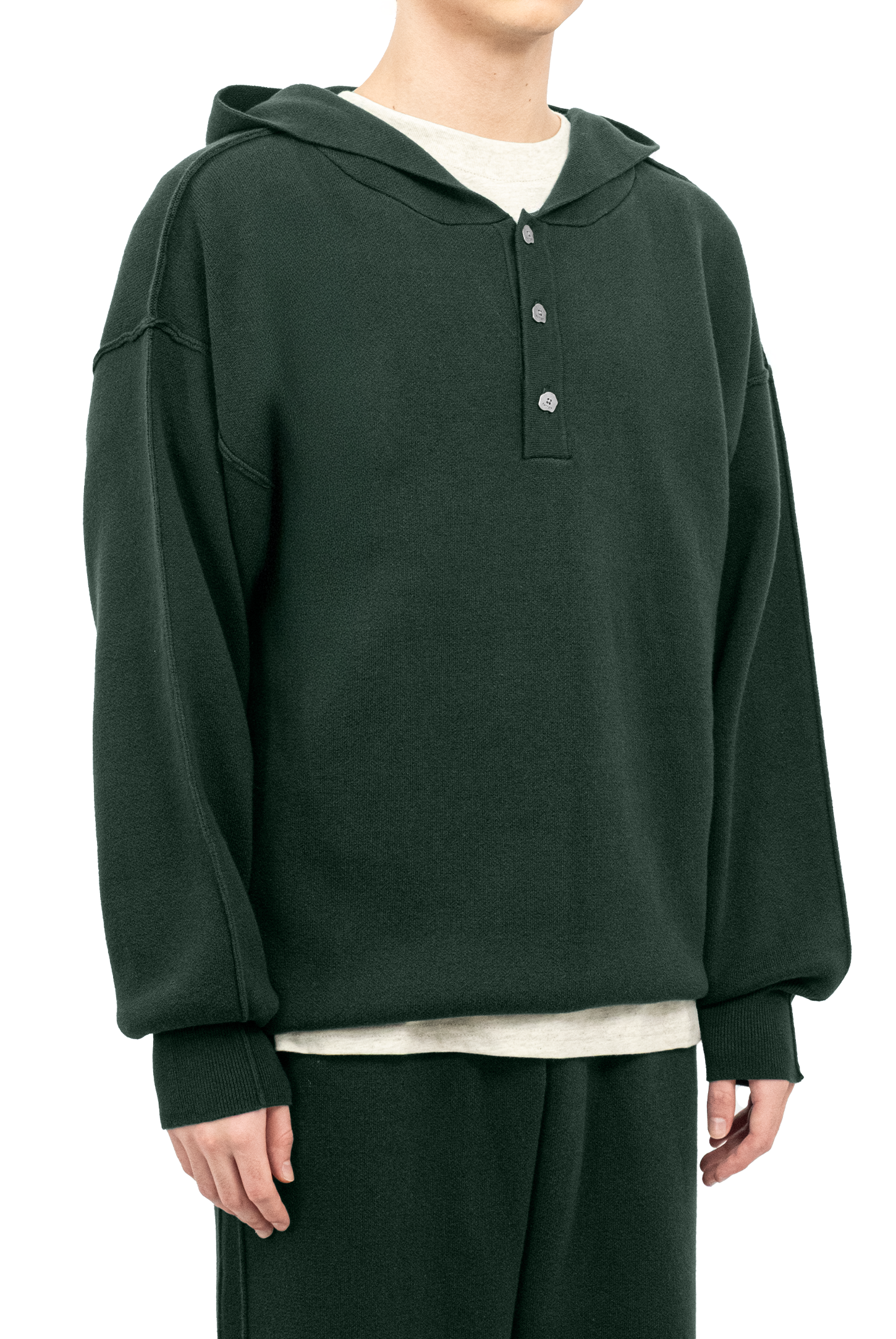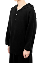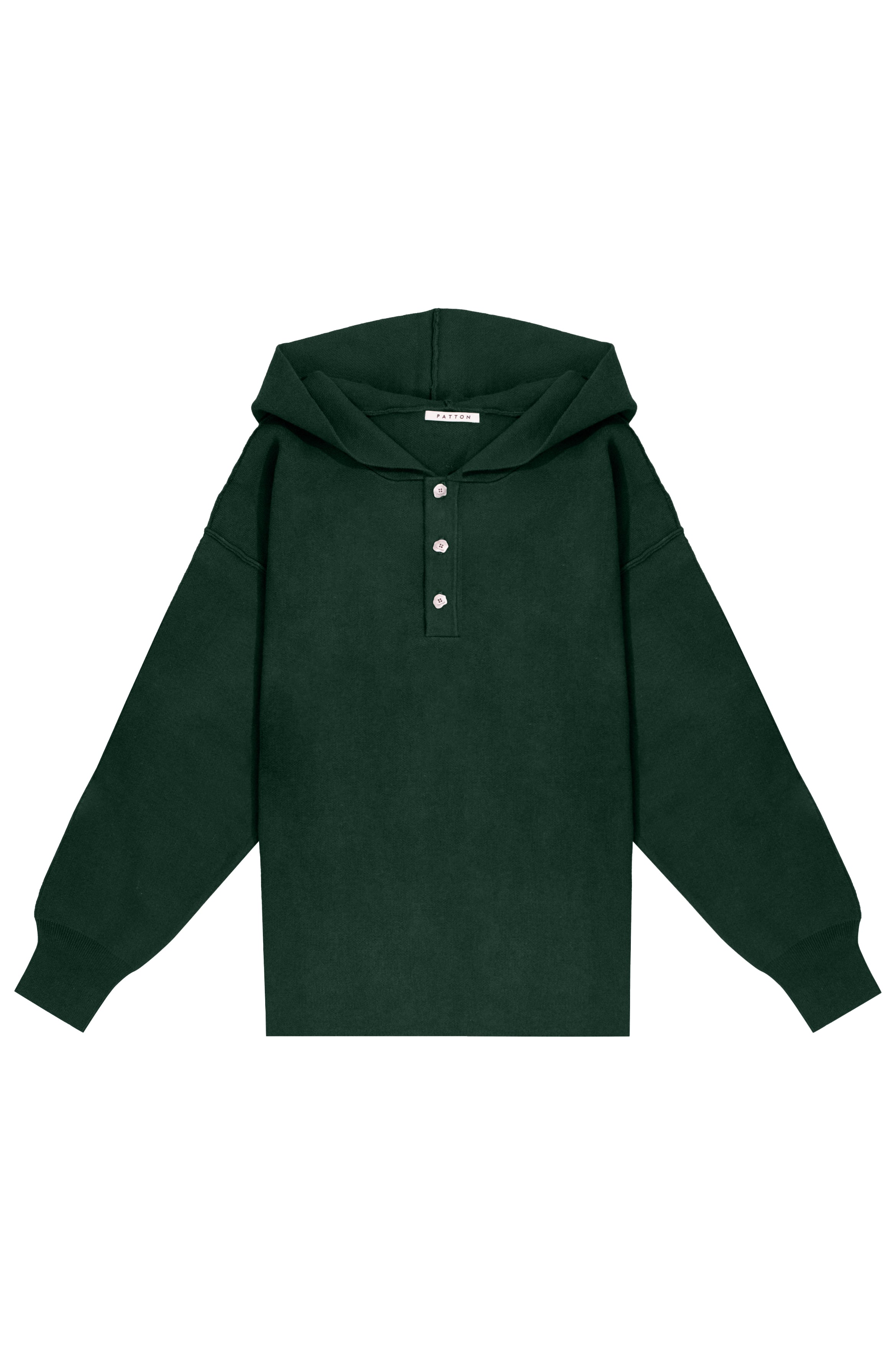 An oversized, unisex hoodie with metal button closures, and raw edge design.