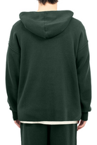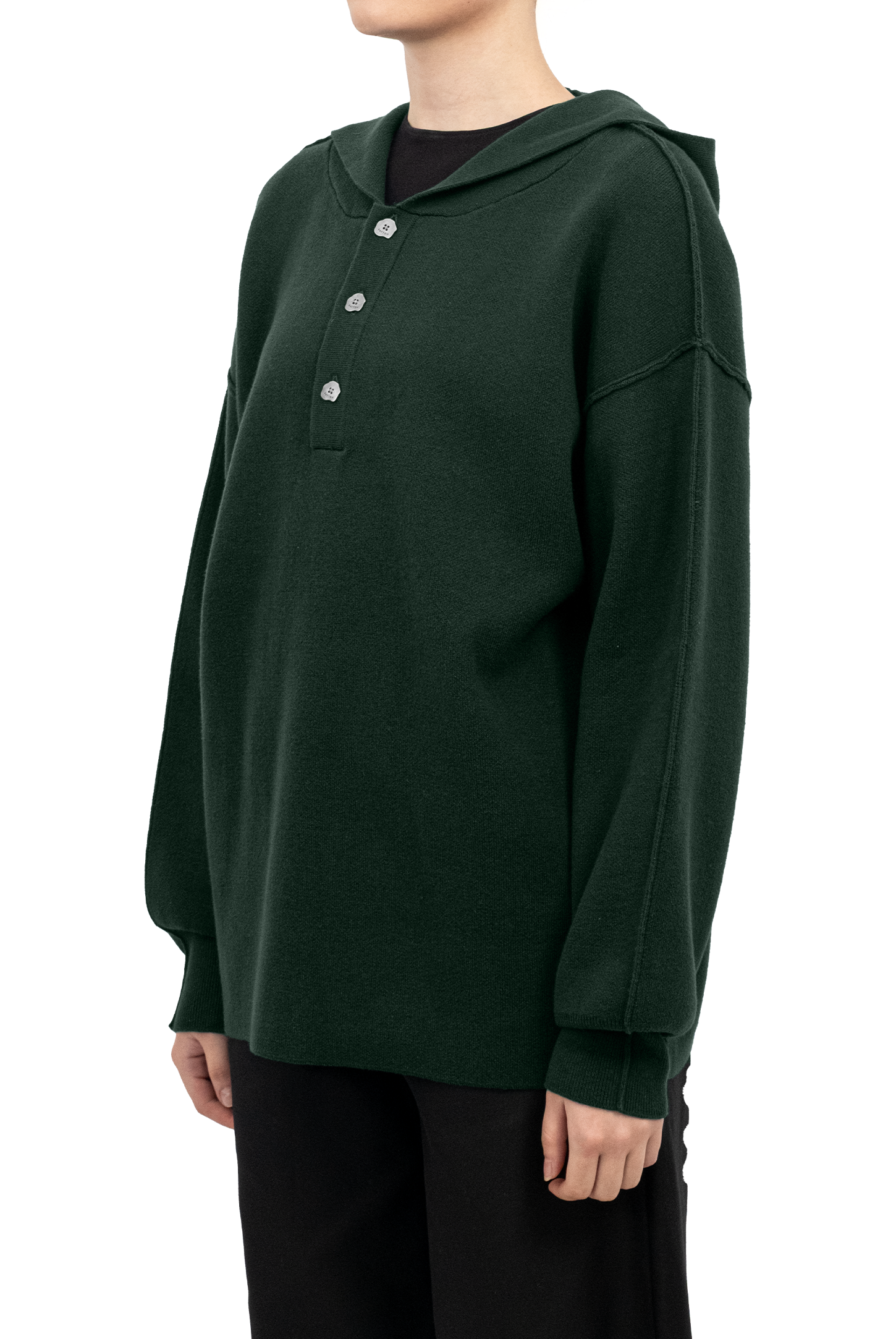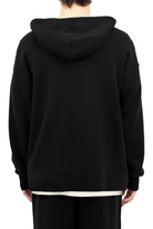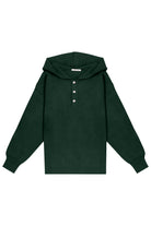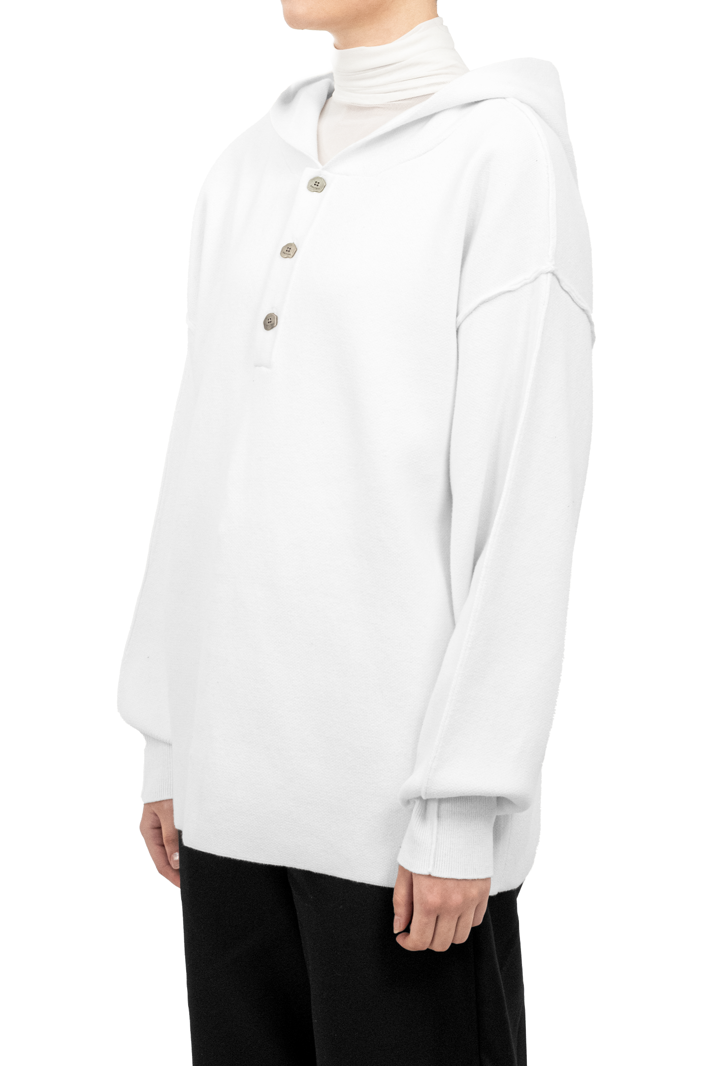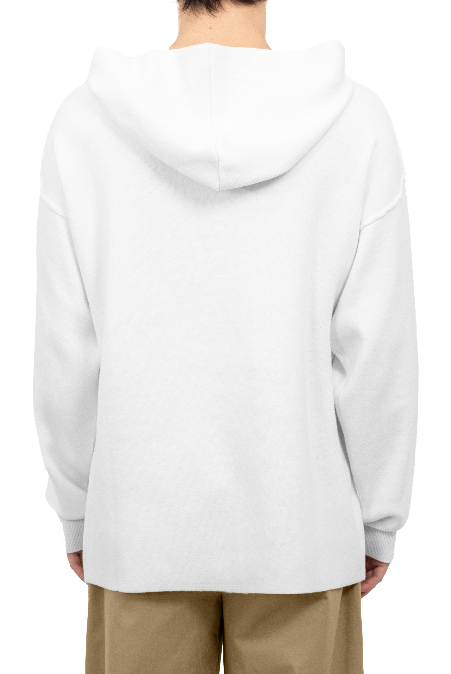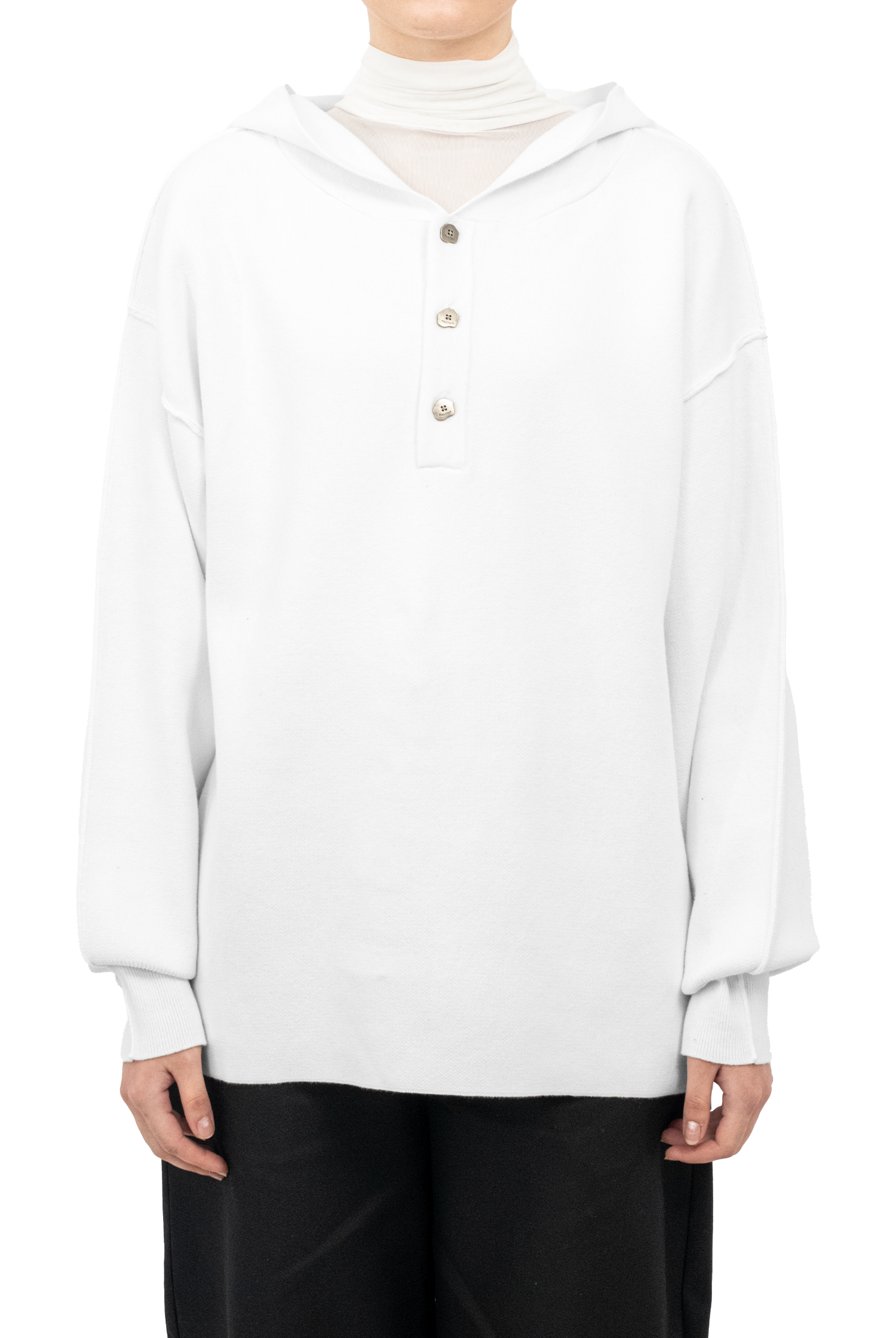 An oversized, unisex hoodie with metal button closures, and raw edge design.