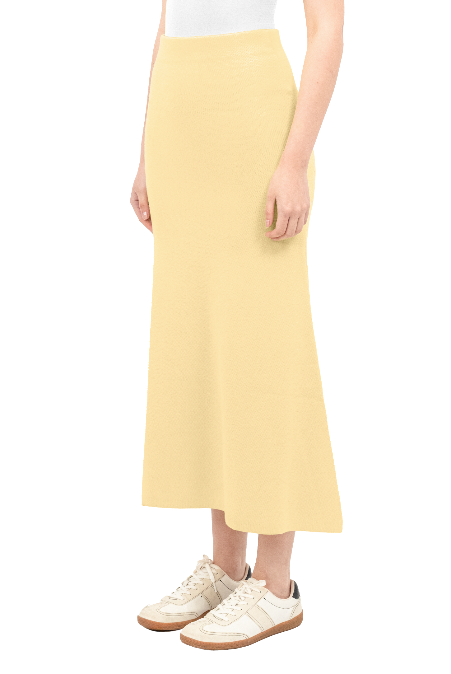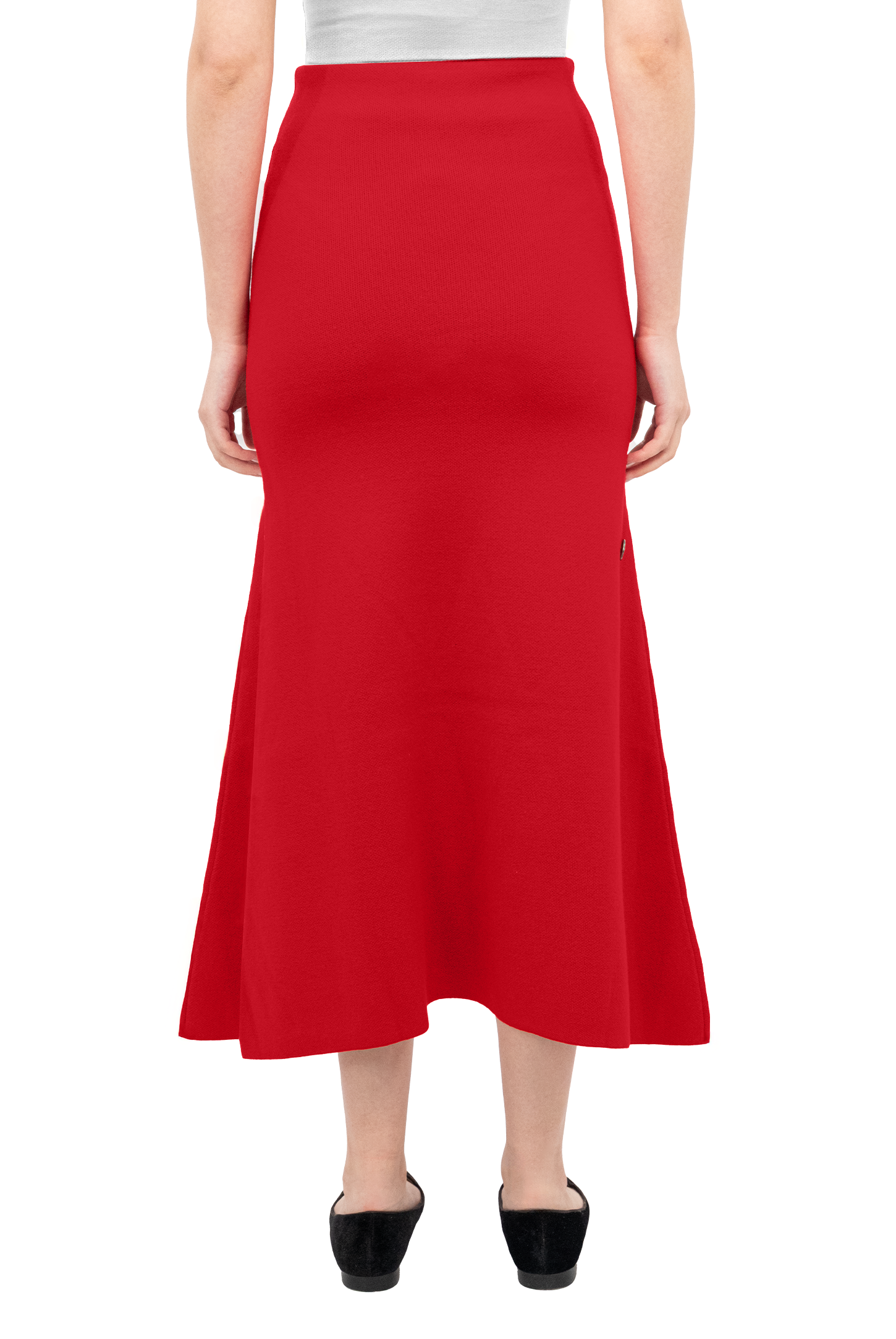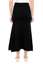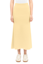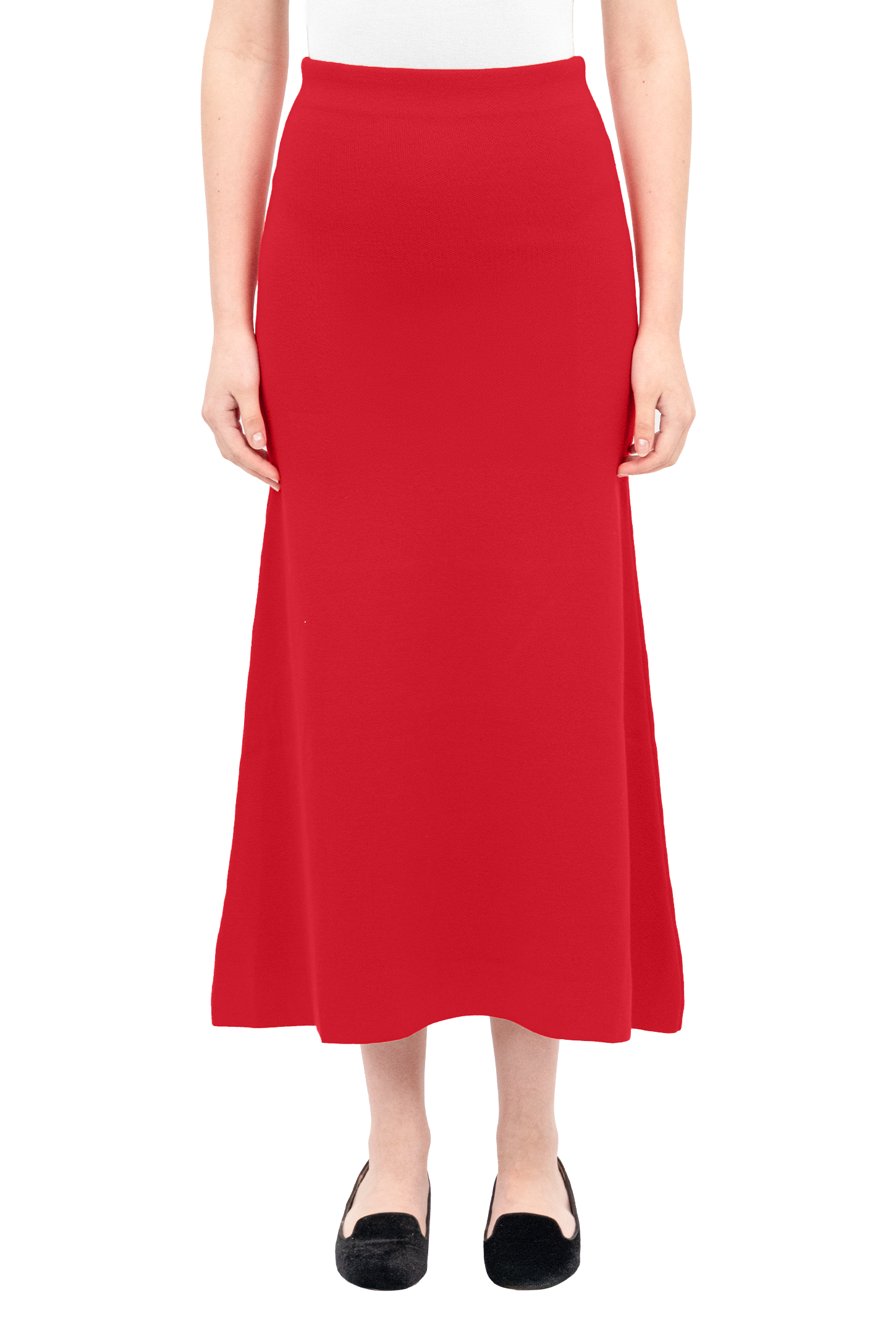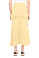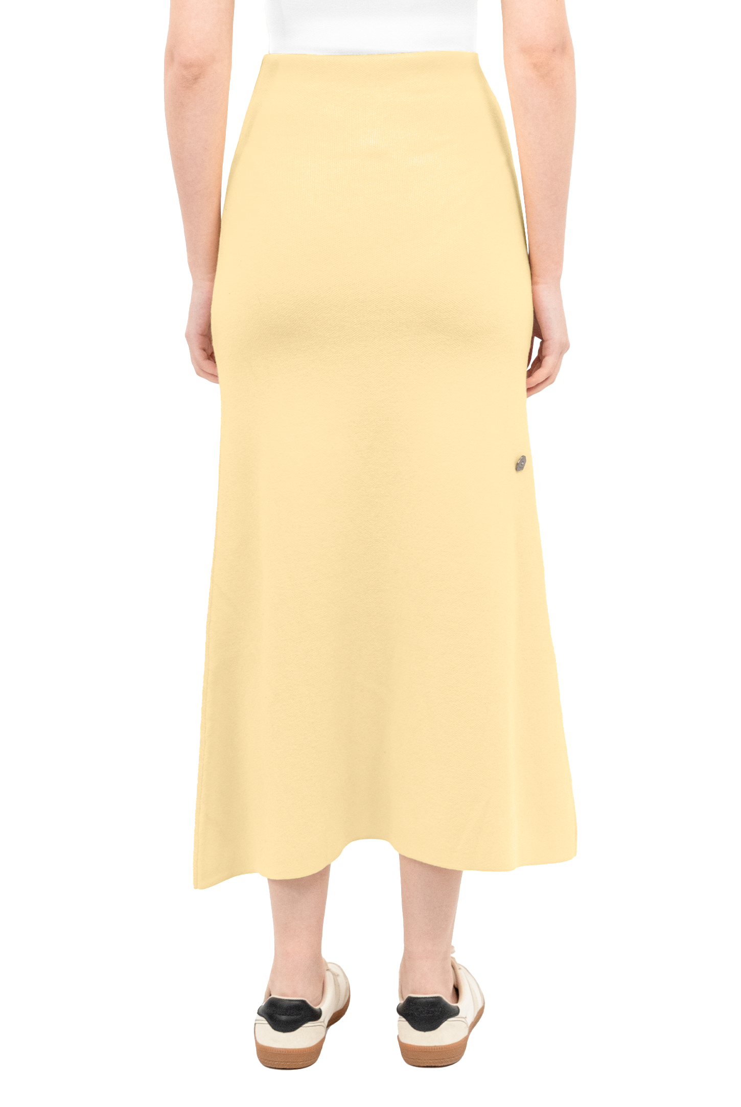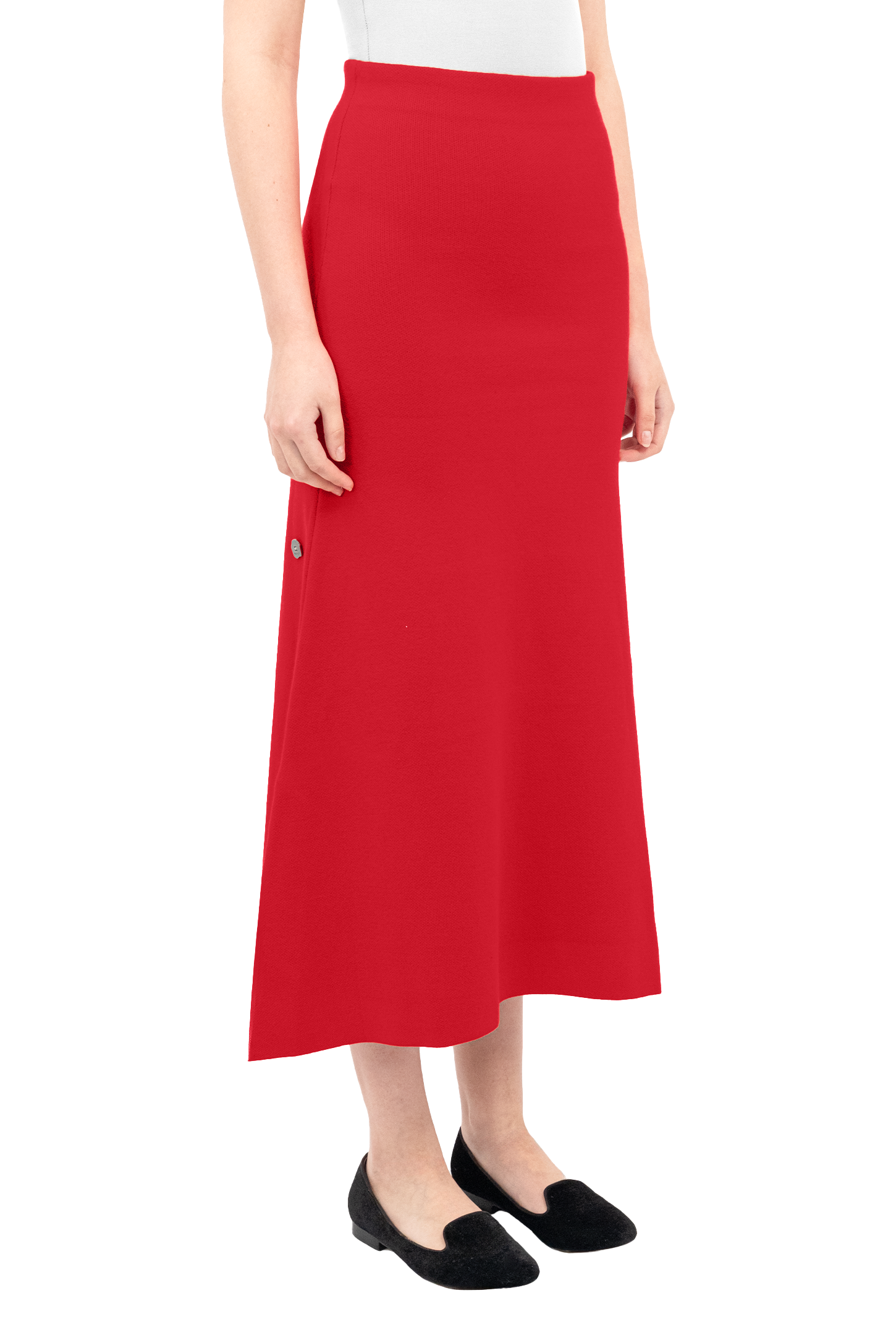 A midi length skirt that fits close on the waist and hips, and flares out to an A-line, with a metal logo button.