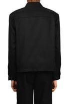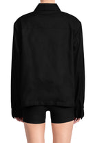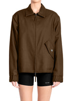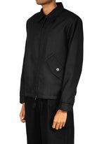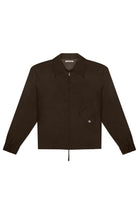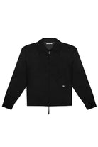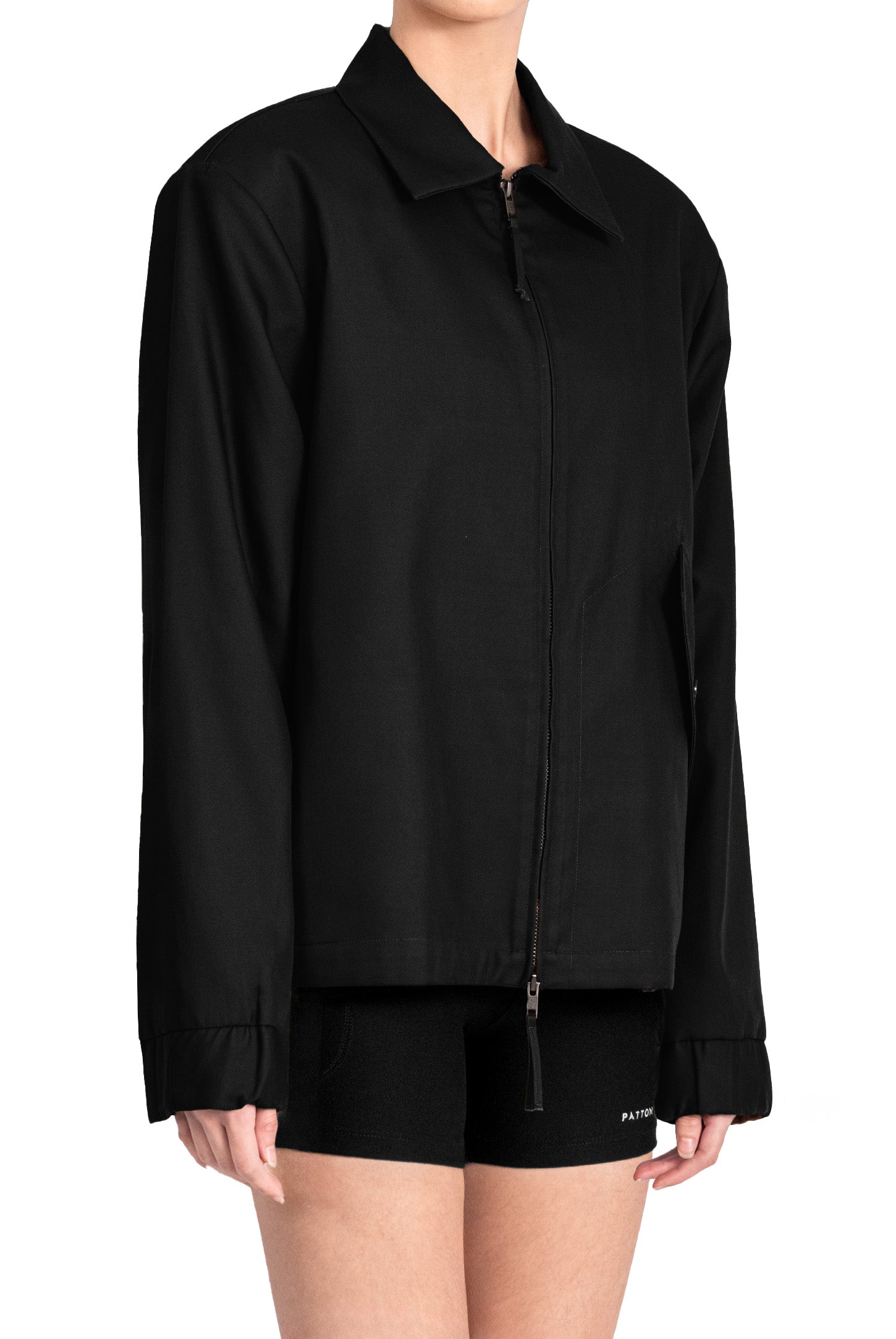 A relaxed fit, unisex jacket with a classic collar and two-way zip closure with fabric slider, gartered cuffs, an oversized flap side pocket with metal button logo, and an inner pocket.