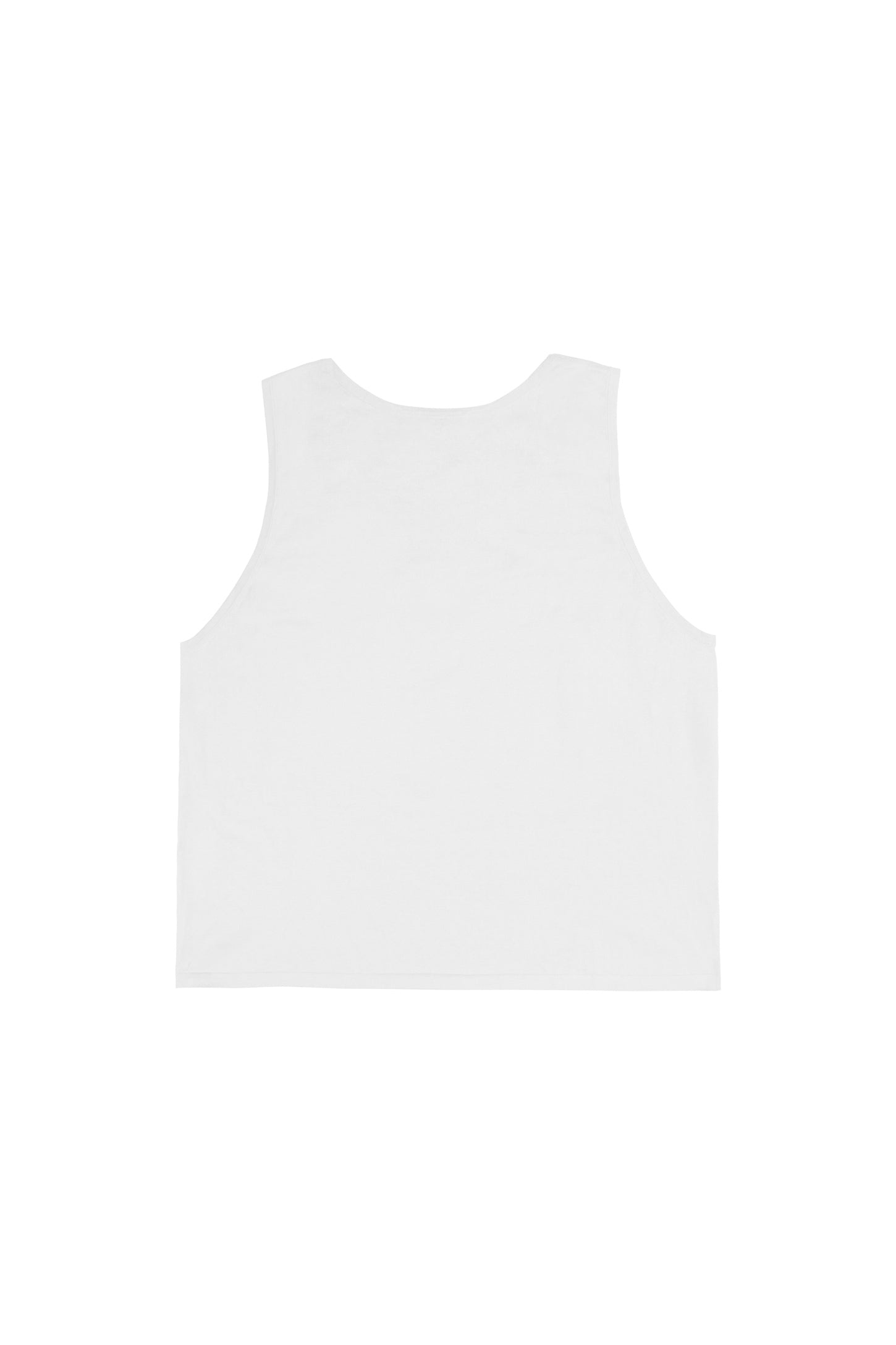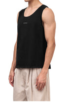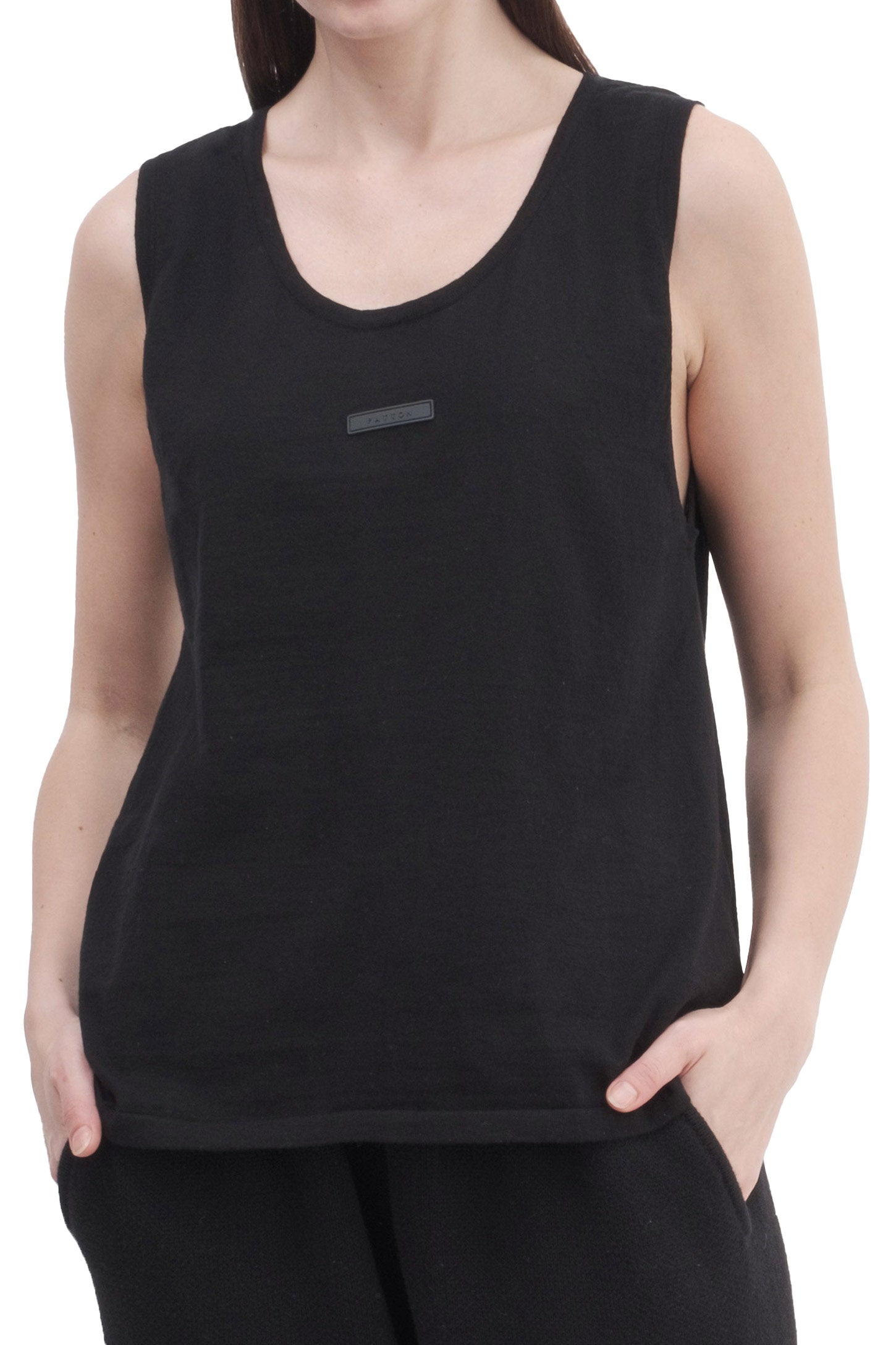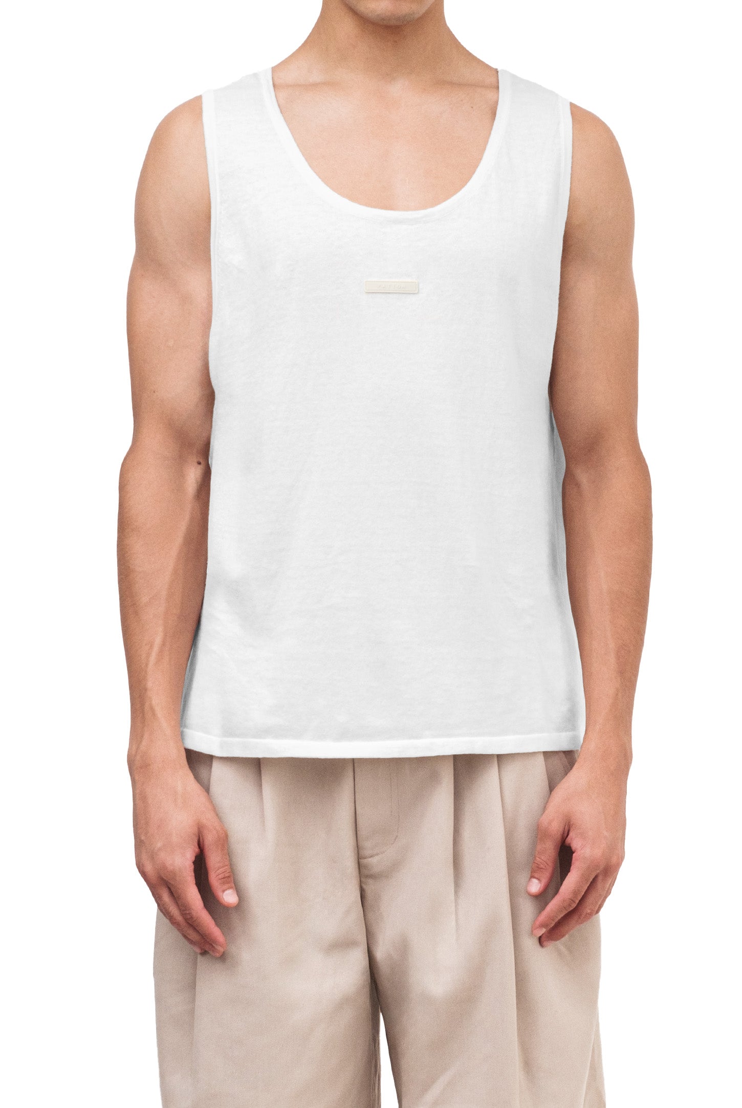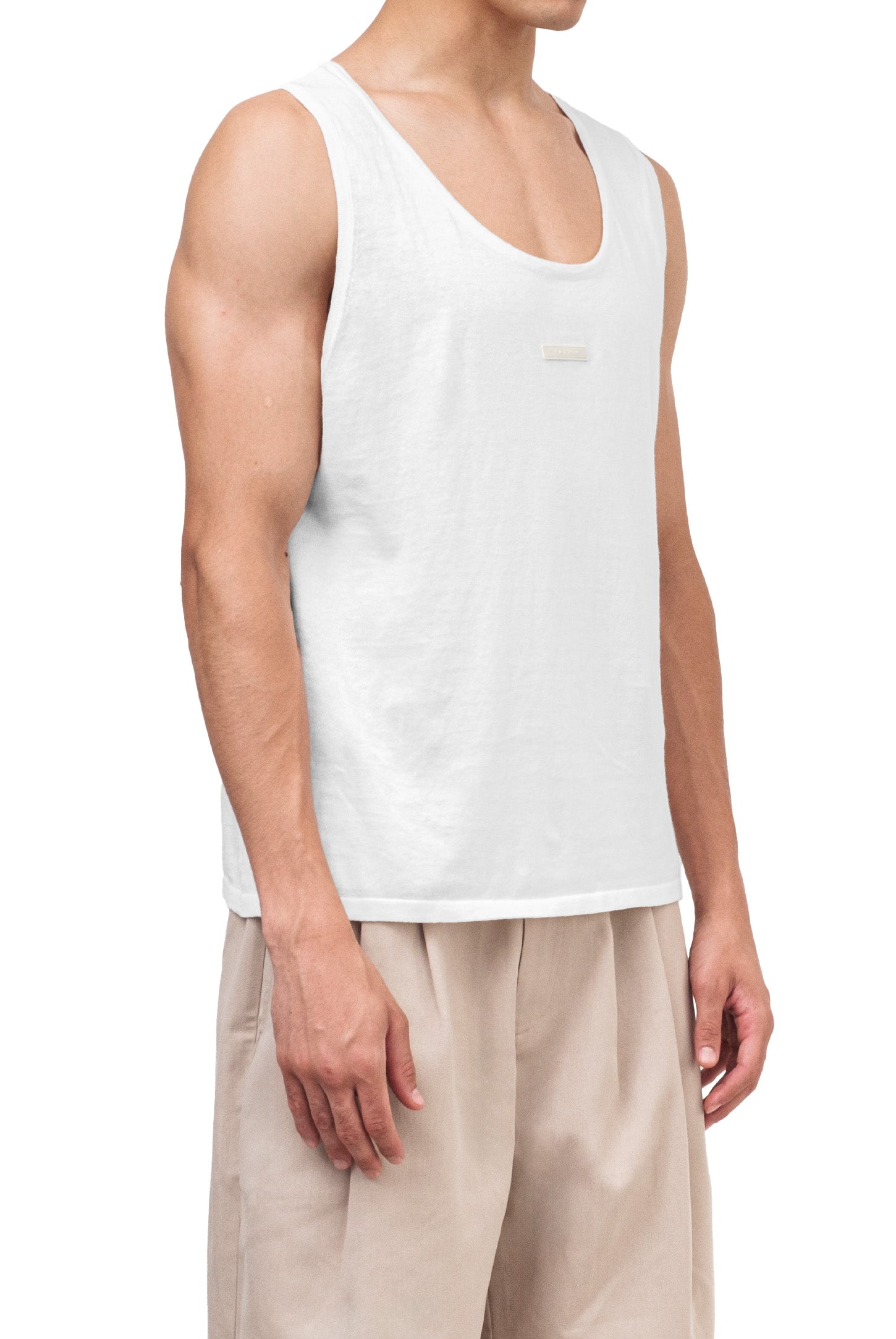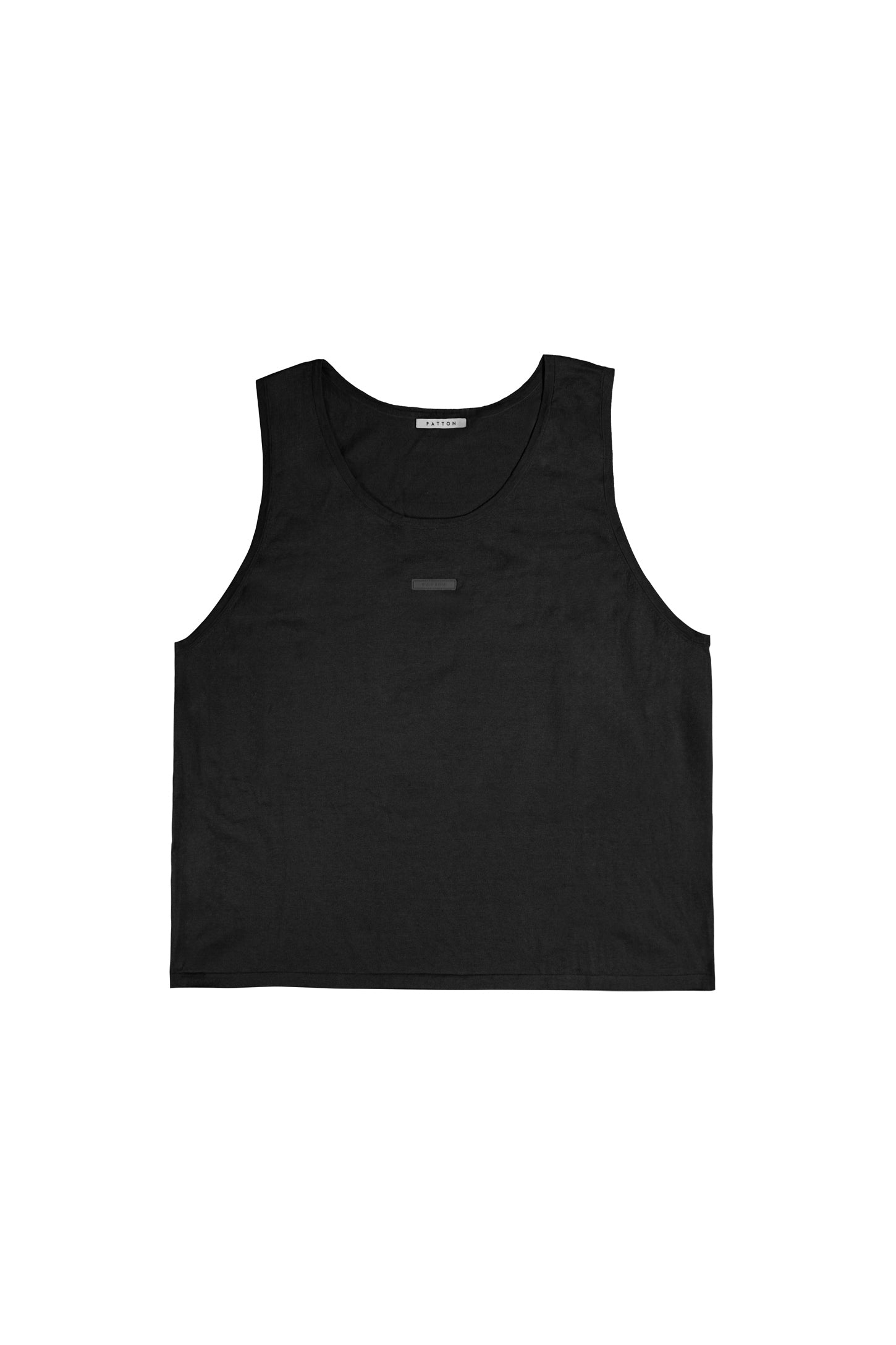 A unisex oversized sleeveless top with a scoop neckline and rubber patch logo.
