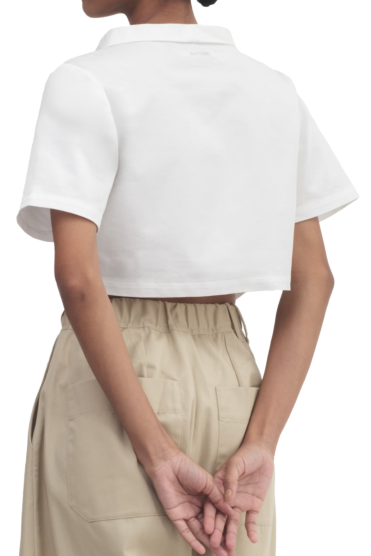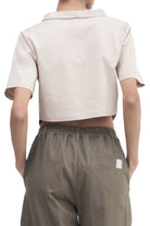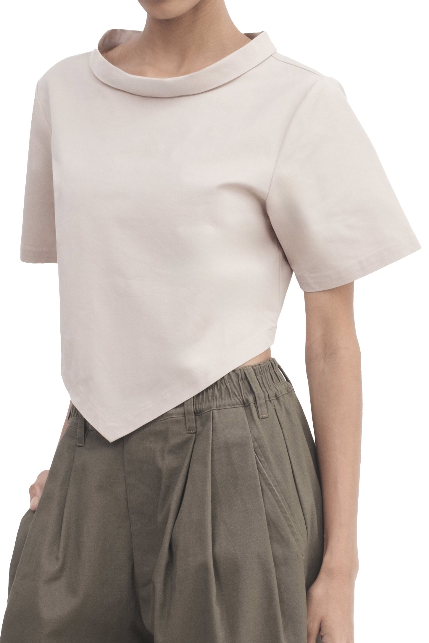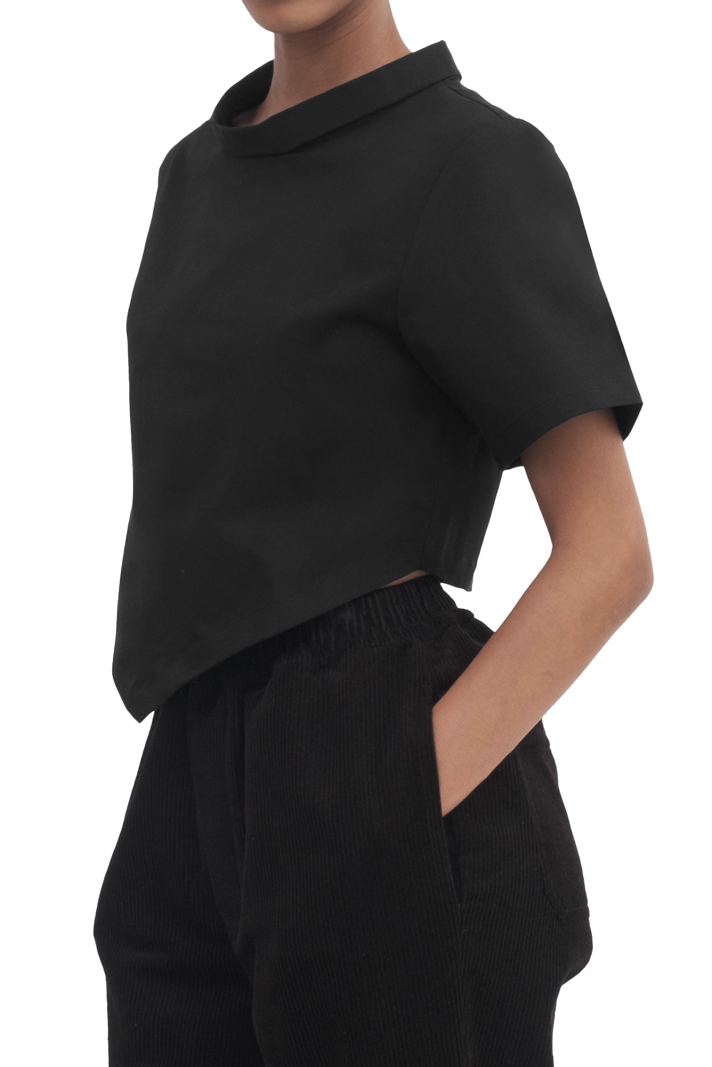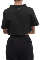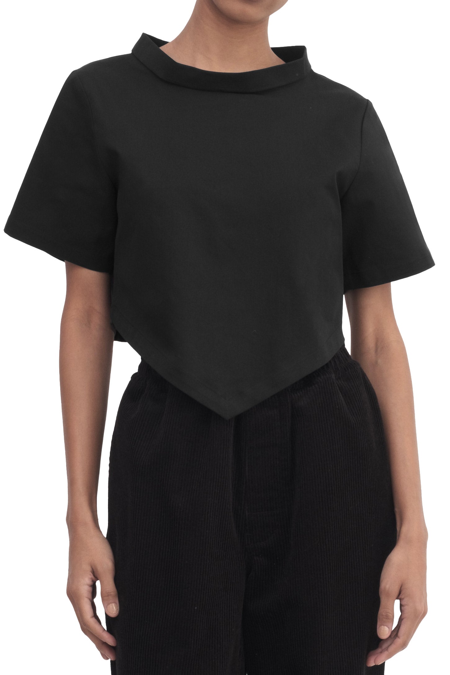 A short-sleeve top with a cropped length, V-hem, mock neck, and an embroidered logo.