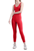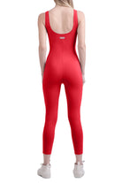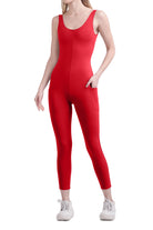 A full-length unitard with a classic scoop neck, low back, side pockets, and a rubber patch logo.