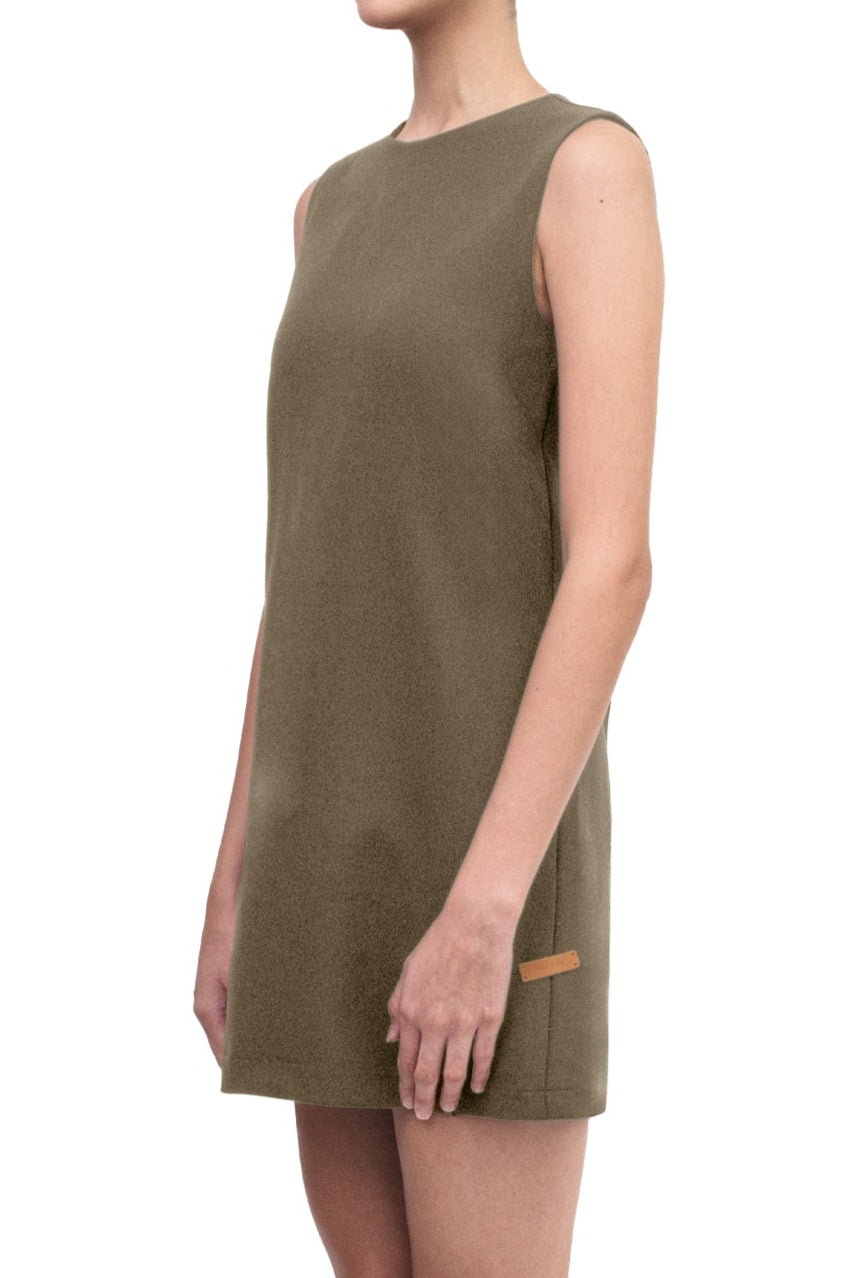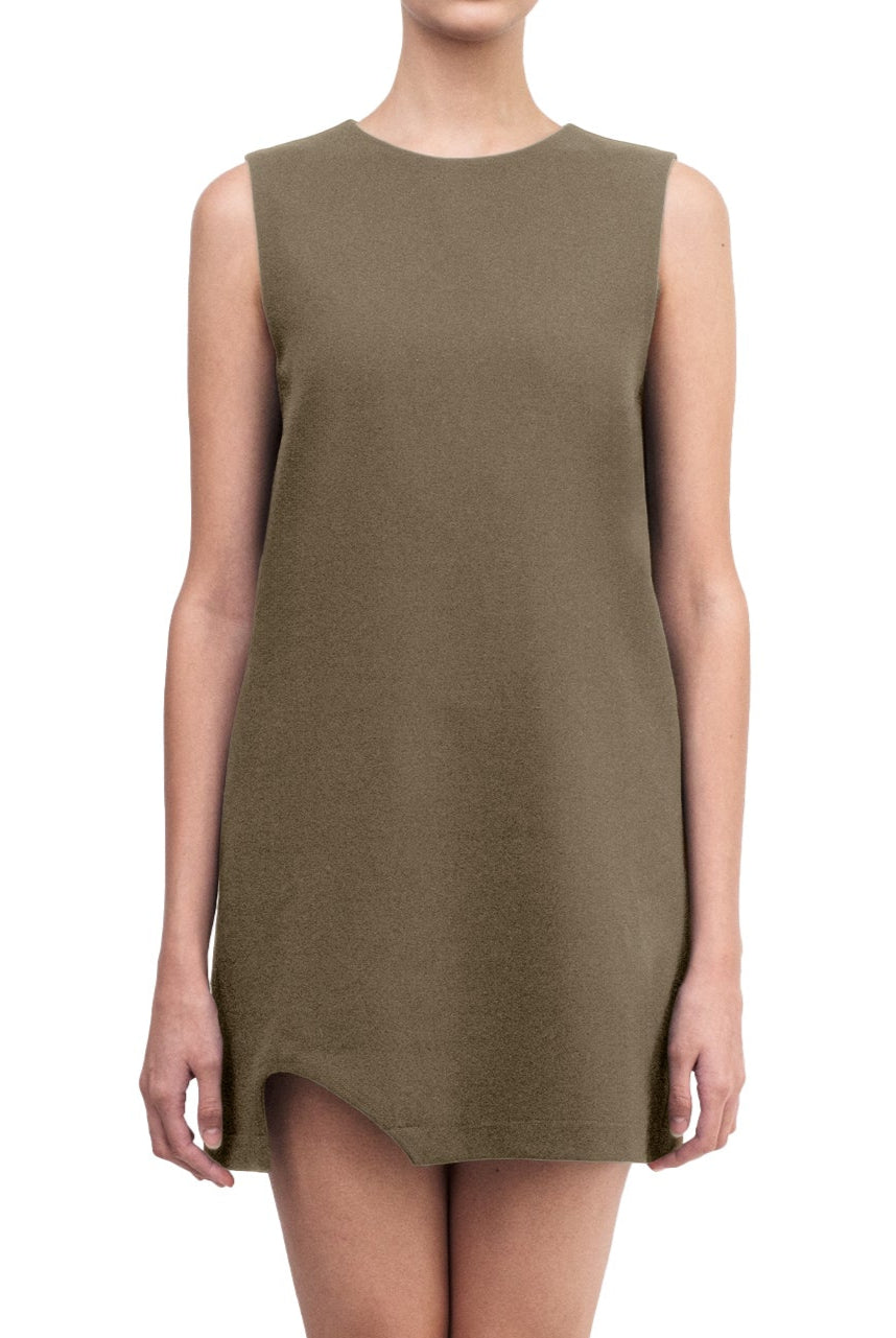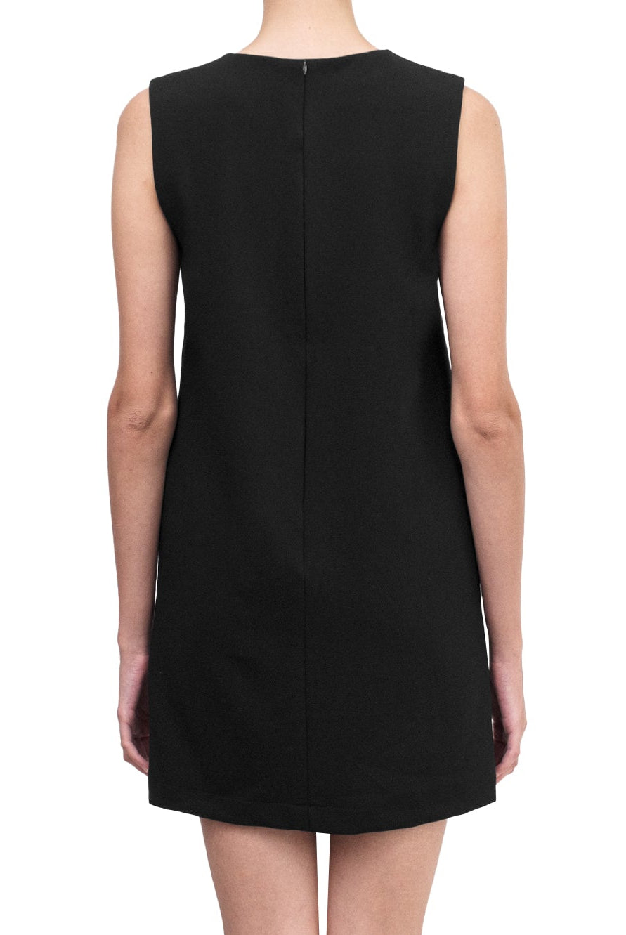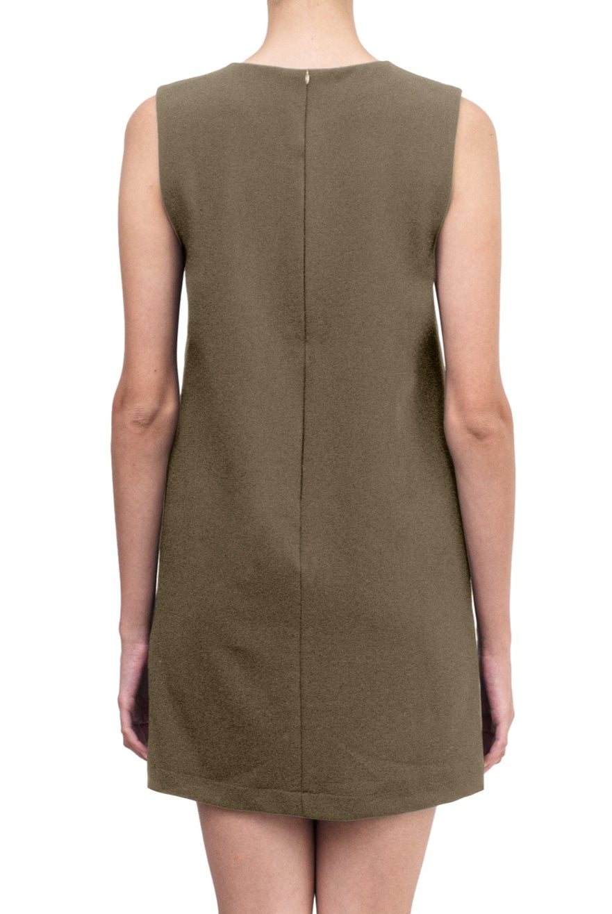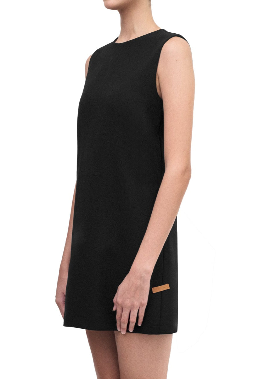 A sleeveless dress with a relaxed fit, crew neckline, invisible zipper closure at the back, curved side slit, full lining, and a jacron label.