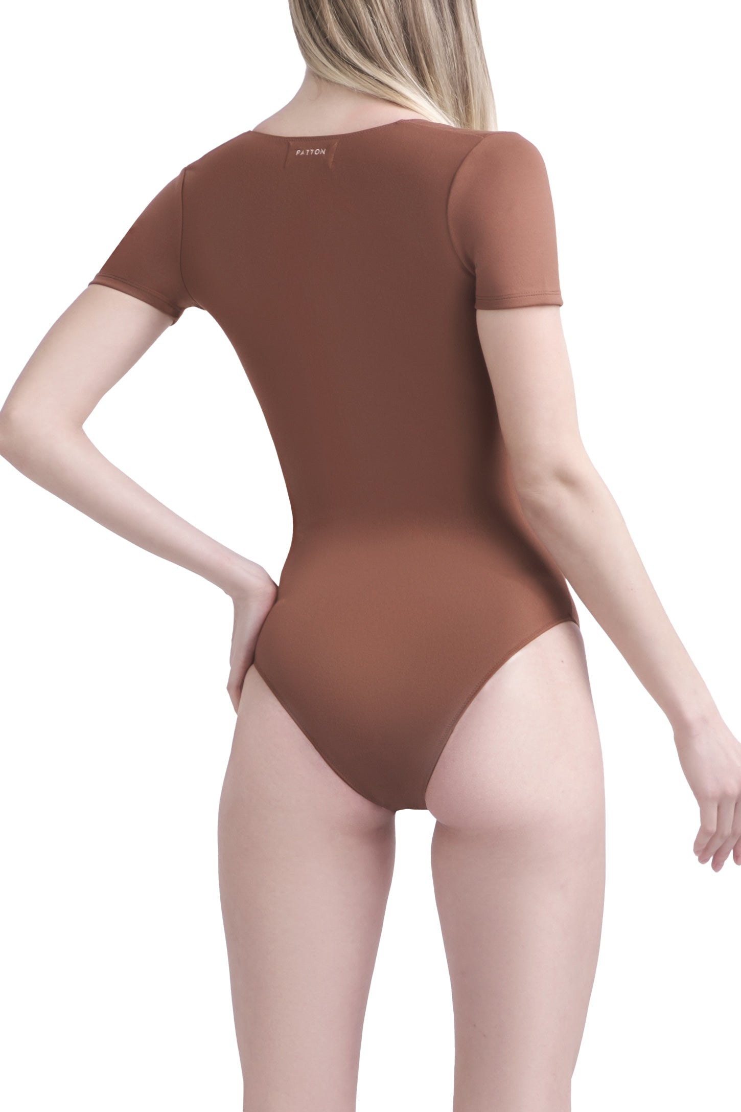 A short-sleeve bodysuit with a scoop V-neckline, snap closures, and an embroidered logo.